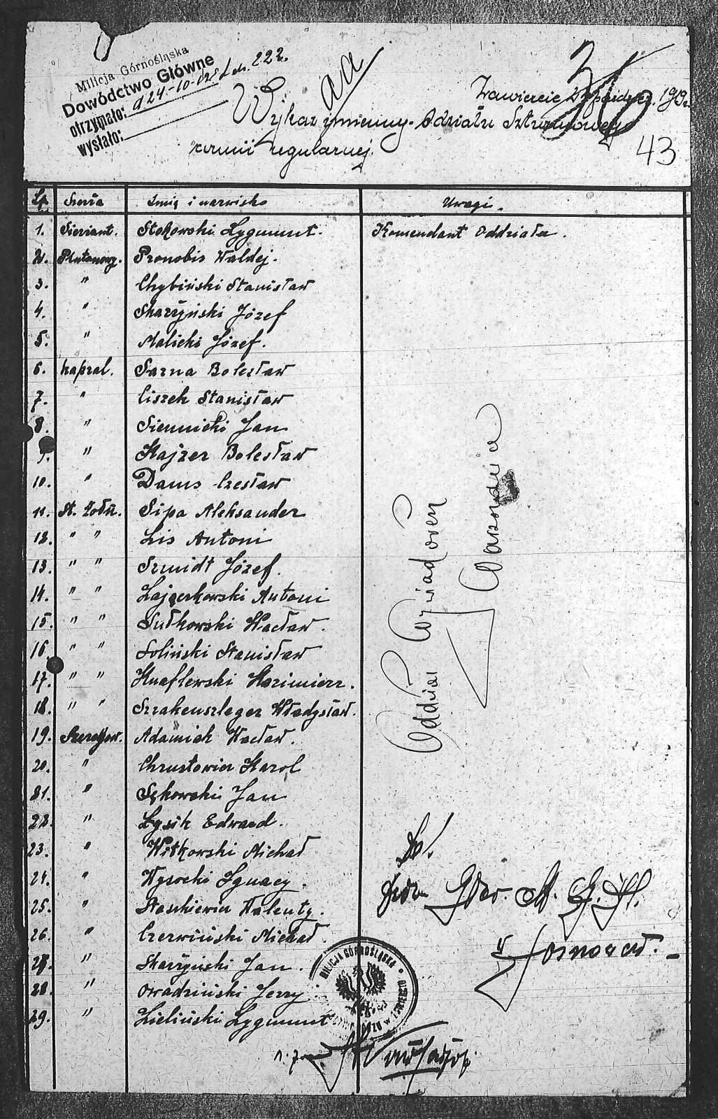 Adamiak, Wacław; Chrustowicz, Karol; Chybiński, Stanisław; Ciszek, Stanisław; Czerwiński, Michał; Danus, Czesław; Kajzer, Bolesław; Knaflowski, Kazimierz; Lis, Antoni; Łysik, Edward; Malicki, Józef; Owadziński, Jerzy; Pronobis, Waldej.; Sękowski, Jan; Siennicki, Jan; Sipa, Aleksander; Skarżyński, Jan; Skarżyński, Józef; Soliński, Stanisław; Sosna, Bolesław; Stankiewicz, Walenty; Stokowski, Zygmunt; Sułkowski, Wacław; Szmidt, Józef; Szrakenszleger, Władysław; Witkowski, Michał; Wysocki, Ignacy; Zajączkowski, Antoni; Zieliński, Zygmunt; |