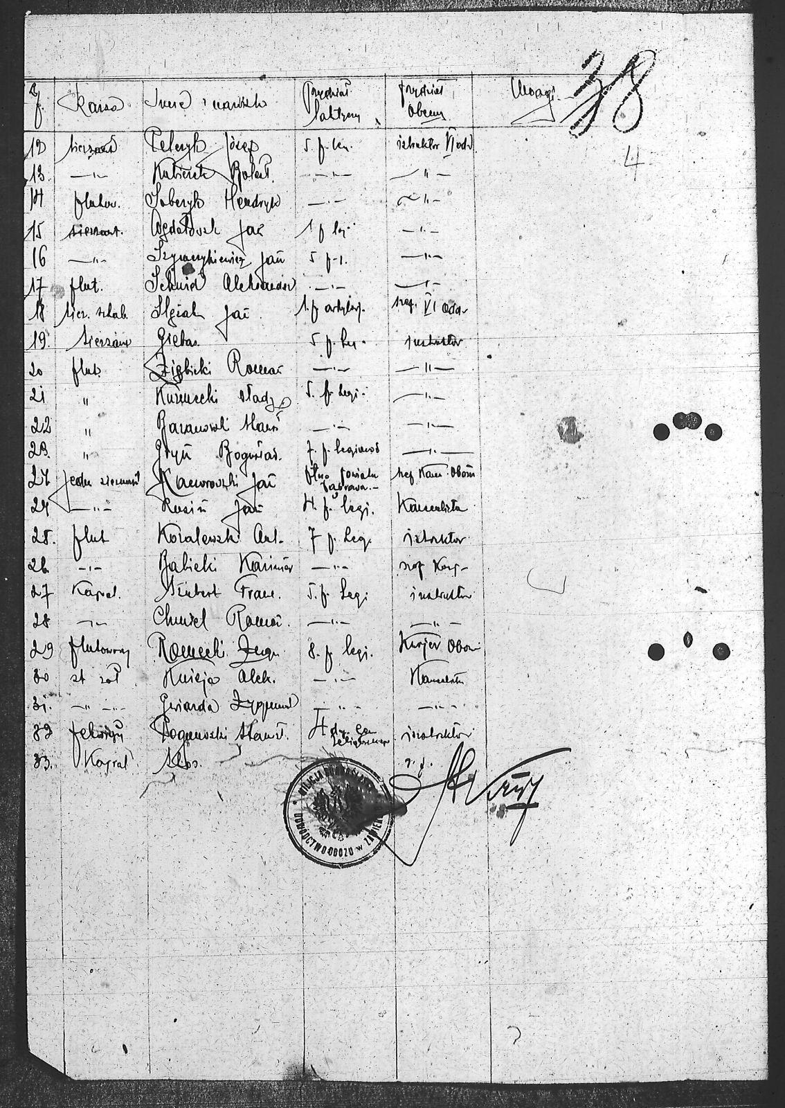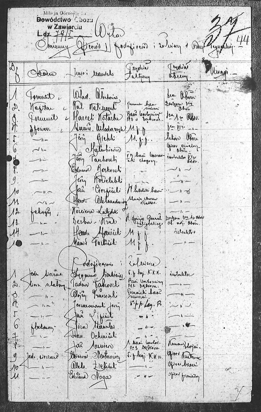 Aleksandrowicz, Henryk; Babicki, Kazimierz; Baranowski, Stanisław; Bielski, Jerzy; Chmiel, Roman; Cierpiński, Jan; Dąbrowski, Tadeusz; Derba, [nieczytelne]; Giebas ; Góra, Stanisław; Gryń, Bogusław; Gwiazda, Zygmunt; Jerzmanowski, Jerzy; Kaczorowski, Jan; Knieja, Aleksander; Koralewski, Antoni; Kotarba, Marceli; Kozietulski, Jerzy; Kubiczek, Bolesław; Kuzmecki, Władysław; Lipiński, Jan; Malinowski, Wal.; Maluskiewicz; Nesterowicz, Mieczysław; Noga, Edward; Ochmiński, Stanisław; Paszkowski, Jerzy; Poguneski, Stanisław; Polczyk, Józef; Ramecki, Eug.; Rozkowski, Edward; Rusin, Jan; Schmid, Aleksander; Sienkiewicz, Zygmunt; Slężak, Jan; Sobczyk, Henryk; Sosnierz, Jan; Stawieski, Henryk; Stos; Szubert, Franciszek; Szyraczykiewicz, Jan; Truszewski, Alojzy; Turbiński, Marian; Wędałowski, Jan; Włochowicz, Władysław; Włodarczyk, Stanisław; Woreiesza-Łabędzki, ; Zieliński, Aleksander; Ziębicki, Roman; |