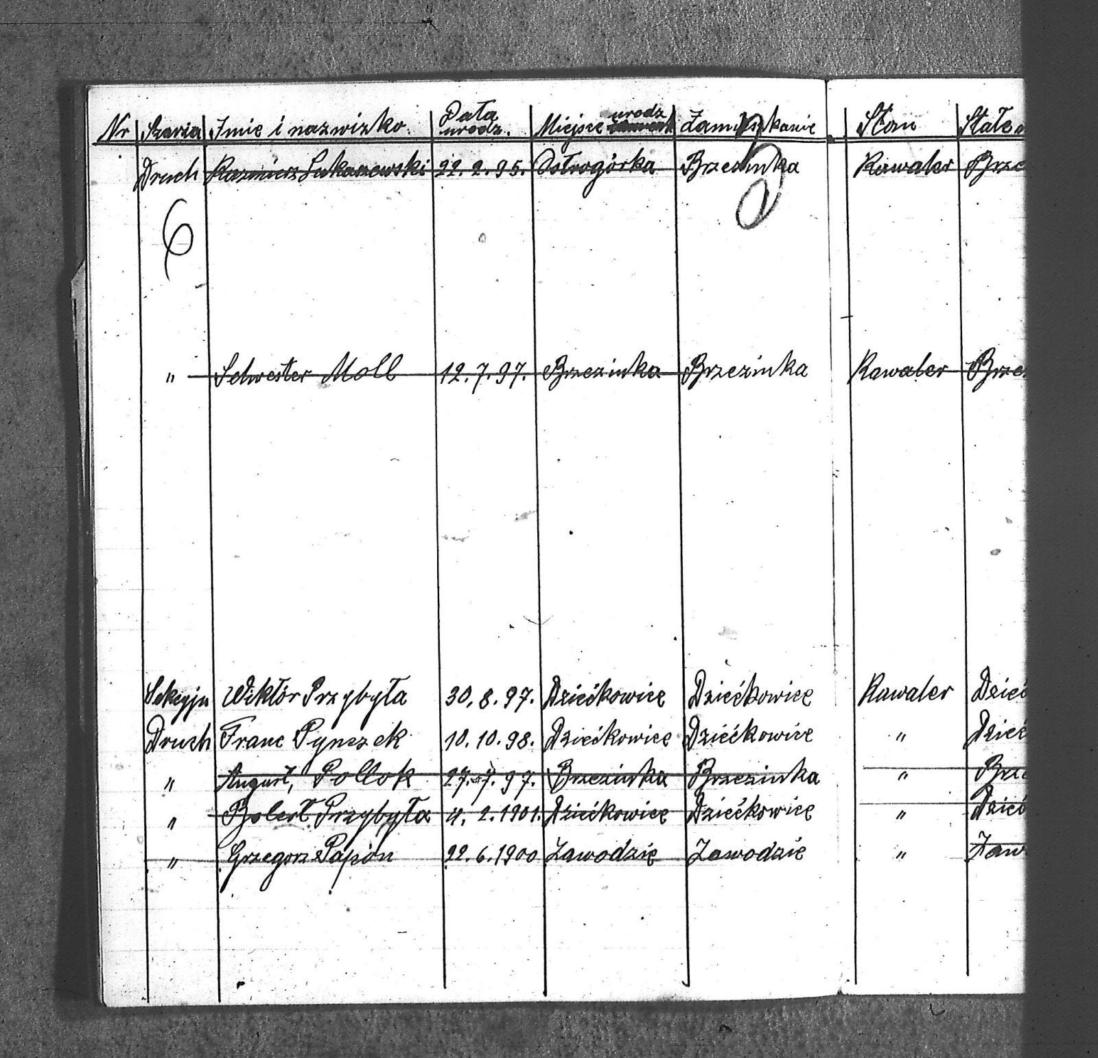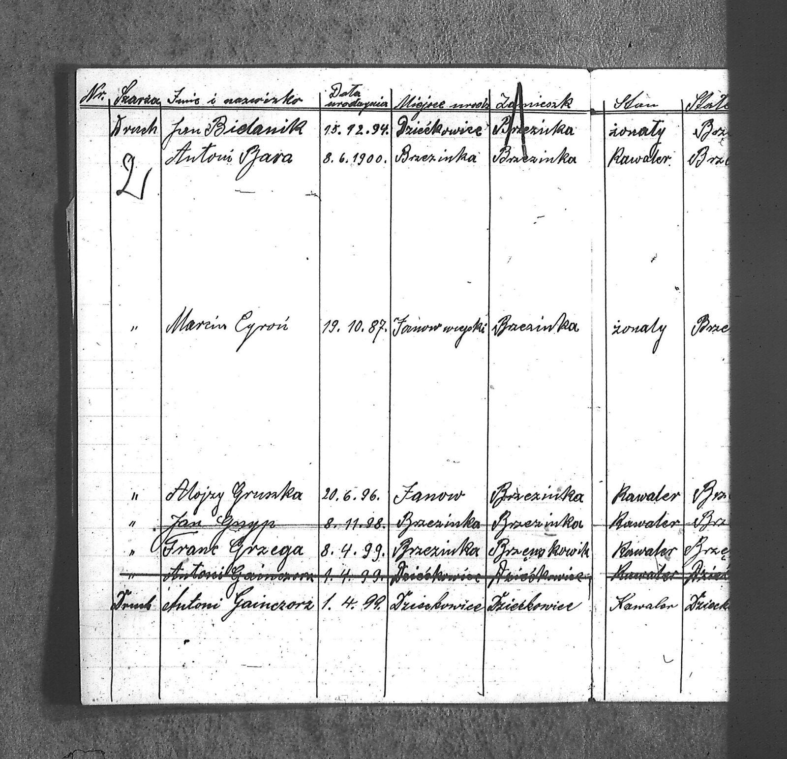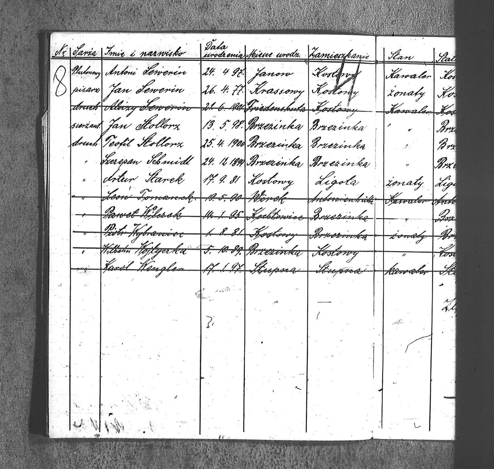 [Sukaszewski], Kazimierz; Bara, Antoni; Bara, Jan; Bielnik, Anna; Bielnik, Jan; Cieplok, Paweł; Cyroń, Katarzyna; Cyroń, Marcin; Gainczorz, Antoni; Gainczorz, Bronisława; Gnyp, Jan; Gnyp, Teodor; Gruszka, Alojzy; Gruszka, Antoni; Grzega, Franc; Grzega, Piotr; Hetmański, Antoni; Hetmański, Jan; Hetmański, Josef; Jenczmyk, Ang.; Jenczmyk, Tomasz; Kloska, [Wilk]; Kloska, Bronisław; Kost, [Stanisław]; Kost, Anna; Kost, Franc; Kost, Maria; Kowalski, Wincenty; Kuderska, Anna; Kuderski, Jan; Moll, [Sylwester]; Moll, Wawrzyn; Papoń, Grzegorz; Papoń, Piotr; Pollok, August; Przybyła, [Bolesław]; Przybyła, Josef; Przybyła, Wiktor; Pynczek, Anna; Pynczek, Franc; Schmidt, Szczepan; Schmidt, Wojciech; Sewerin, Aloizy; Sewerin, Antoni; Sewerin, Jadwiga; Sewerin, Jan; Starek, Artur; Starek, Maria; Stollorz, Anna; Stollorz, Teofil; Tomanek, [Joanna]; Tomanek, Leon; Wengler, Karol; Wilczek, Jan; Wilczek, Paweł; Wojteczka, Rozalia; Wojtyczka, Wilhelm; Wybraniec, Maria; Wybraniec, Piotr; |