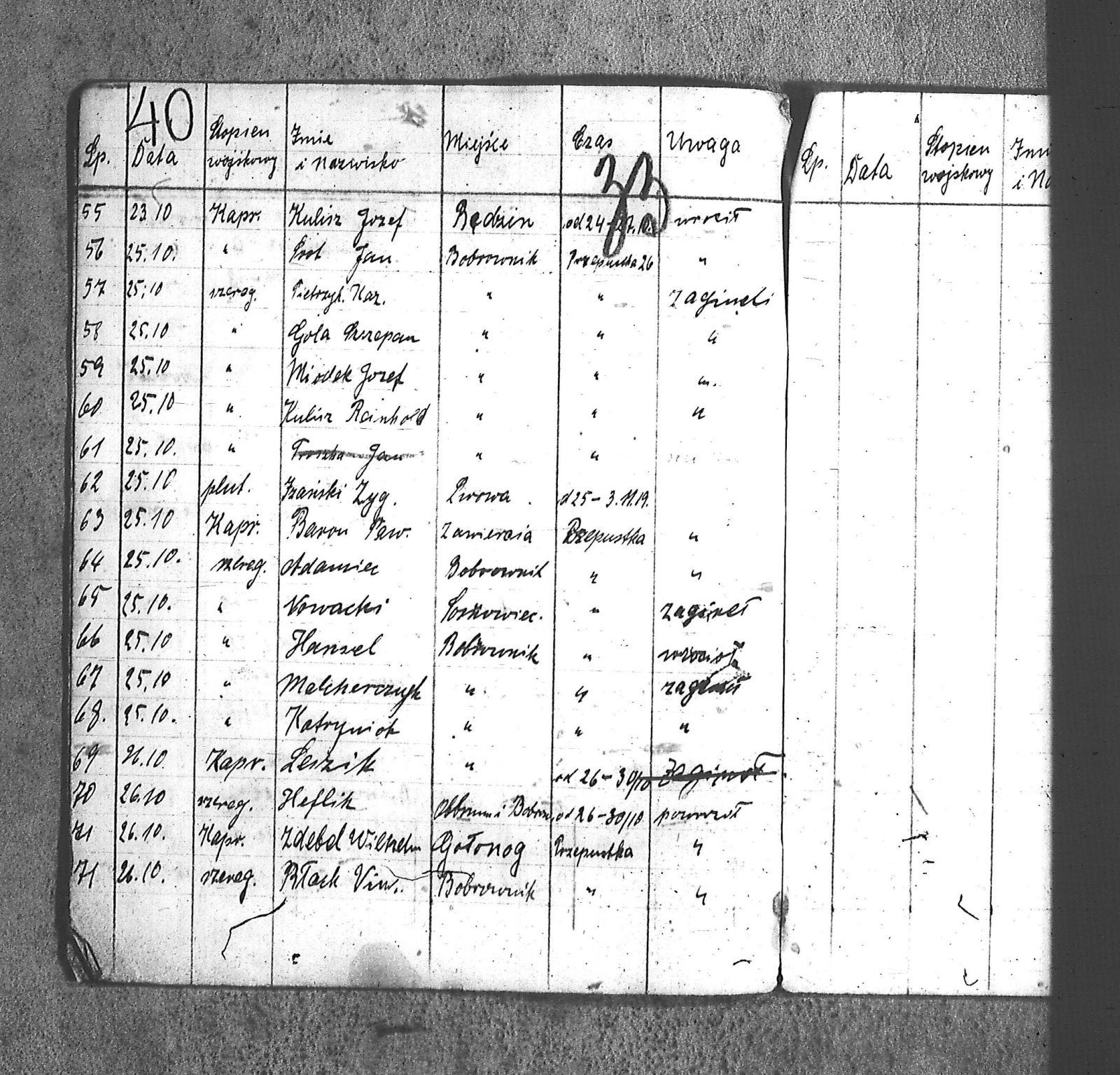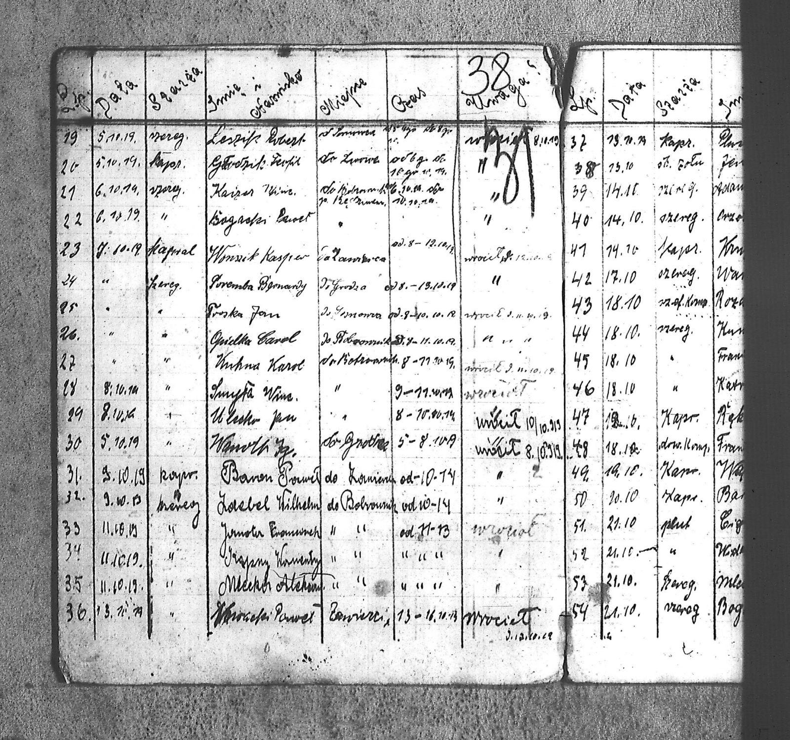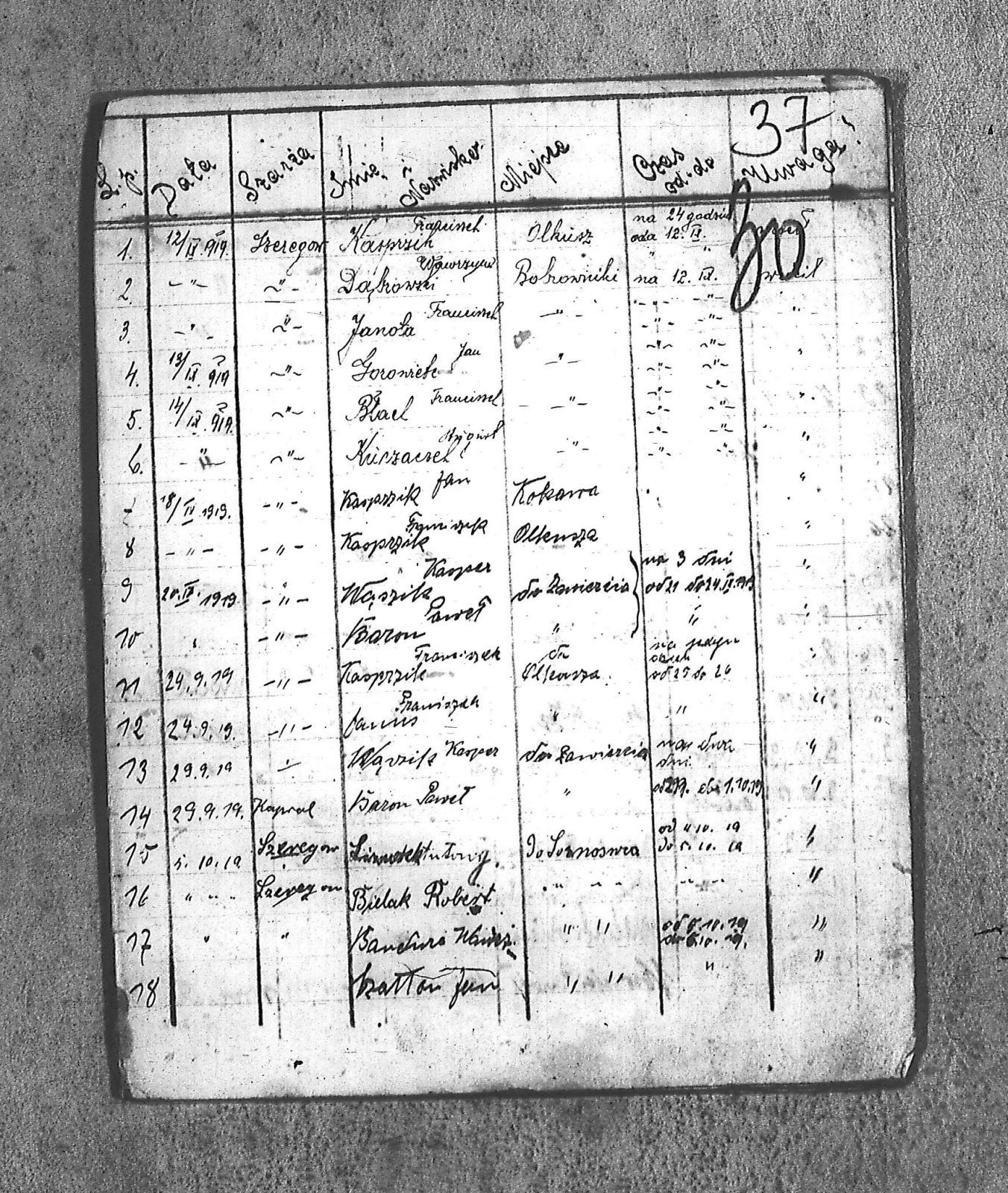 [Adamierz], Jan; [Adomieły], Jan; [Bandura], W.; [Blacl], Franciszek; [Błack], Vinc.; [Cigler], [Ignacy]; [Francielowski], Jan; [Franielczyk], Paweł; [Gorowiet], Jan; [Izański], Zygmunt; [Jamota], E.; [Jendruch], Jan; [Kaizer], W.; [Kasprzyk], Franciszek; [Kasprzyk], Jan; [Katryniok]; [Krirżaczek]; [Leszik], Robert; [Lezik]; [Mekherczyk]; [Mlecko], [Aleksander]; [Mlecko], Jan; [Orzołek], Antoni; [Pawlik], Jan; [Prot], Jan; [Ulecko], Jan; [Wąsik], Kacper; [Wuhna], Karol; [Zolebel], Wilhelm; Adamiec, [nieczytelne]; Baron, [Paweł]; Baron, Paweł; Bielak, Robert; Bogacki, Adolf; Bogacki, Paweł; Bryłka; Dąbrowski, Wawrzyn; Franiel, Jan; Froszka, Jan; Głodzik, Teofil; Gola, Szczepan; Hanzel; Heflik; Janota, Franciszek; Katryniok, Jan; Kępny, [Wincenty]; Krupa, Karol; Kulisz, [Rainhold]; Kulisz, Józef; Kuna, Viktor; Miodek, Józef; Niewiadomski; Nowacki; Nowacki, Paweł; Opielka, Karol; Pietrzyk, [Kazimierz]; Pluszczyk, Filip; Poremba, Bernard; Ręka, Szymon; Rożanka, Jan; Smyła, Winc.; Troska, Jan; Warecki, Paweł; Wązik, Kacper; Widera, B.; Zdebel, Wilhelm; |