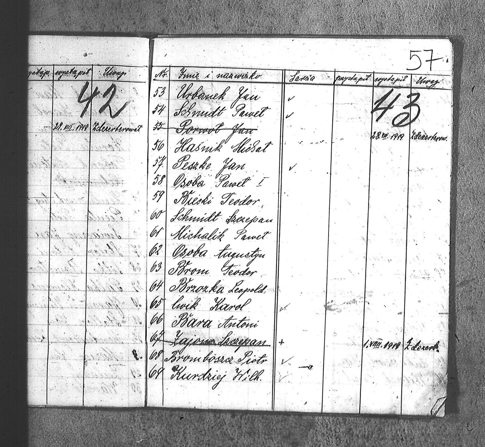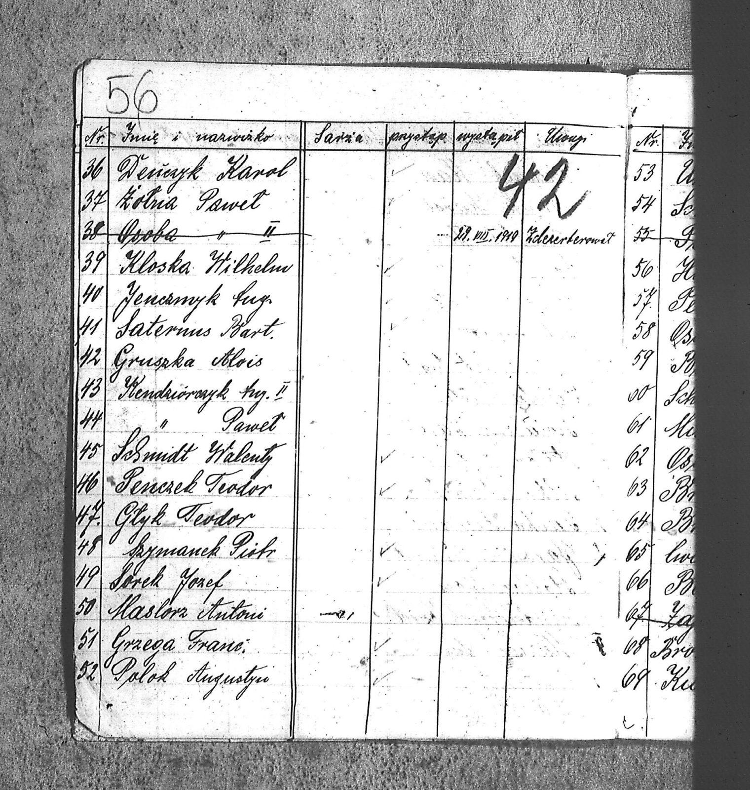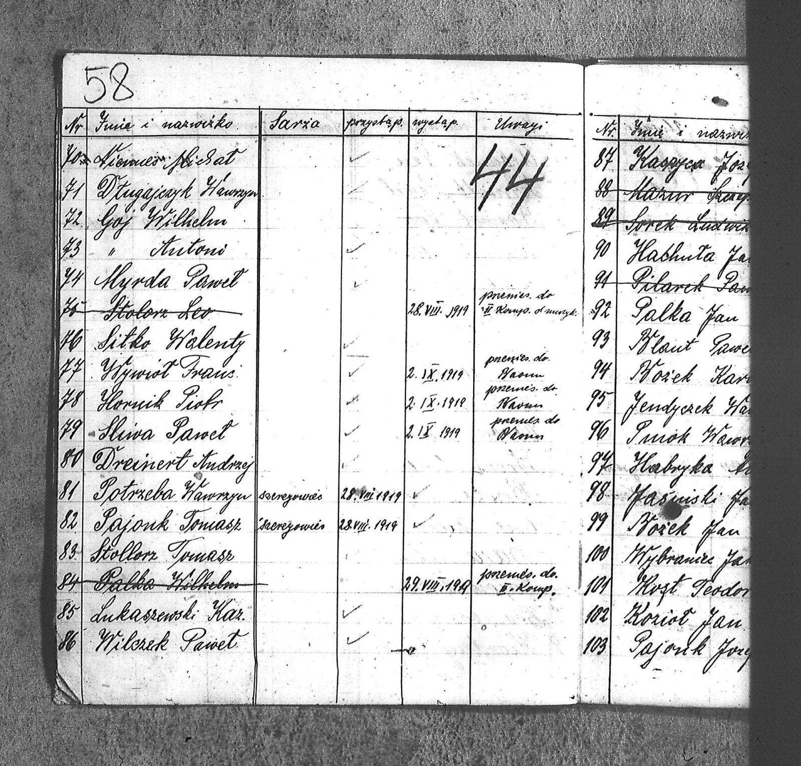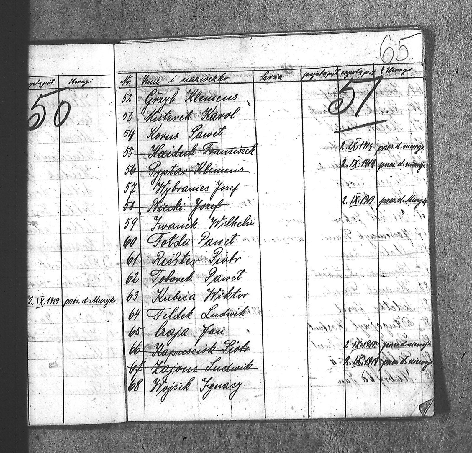 [Danecki], [Franciszek]; [Długajczyk], Wawrzyn; [Dombek], Emil; [Dombek], Walenty; [Dzibany], Paweł; [Dzibon], Teodor; [Ferusol], Jan; [Gainczorz], Józef; [Gincorz], Józef; [Guziak], Władysław; [Habryka], Aug.; [Hachuła], Jan; [Hajduk], Franciszek; [Hiacent], Paweł; [Jaśniski], Jan; [Jaśniski], Józef; [Jochemczyk], [Franciszek]; [Kapuściok], Ludwik; [Kapuśniok], Piotr; [Kaszyca], Józef; [Klimczok], Szczepan; [Klmiern], Walenty; [Kluiczok], Tomasz; [Kontny], Piotr; [Mikula], [Franciszek]; [Ożuchowski]; [Pająk], Józef; [Pająk], Tomasz; [Pioskowik], Piotr; [Rzurziowski], Kazimierz; [Saternus], [Barthom]; [Sewerin], Ludwik; [Sewerm], Jan; [Stachon], Józef; [Szcok], Jan; [Śliwa], Paweł; [Warczek], Piotr; [Winkowski], Szczepan; [Wojcik], Ignacy; [Wybramec], Józef; [Zając], Ludwik; [Zając], Teodor; Apostel, Edward; Apostel, Jan; Apostel, Paweł; Bak, Konstanty; Banasik, Piotr; Bara, Antoni; Bartnicki, Izydor; Bicz, Bolesław; Biecki, Józef; Biecki, Teodor; Bieski, Teodor; Blant, Paweł; Błotko, Jan; Błotko, Ludwik; Boruta, Piotr; Bożek, Jan; Bożek, Karol; Brom, Teodor; Bromborcz, Piotr; Bromboszcz, [Wilhelm]; Brzoska, Leopold; Brzozka, Leopold; Brzozowski, [Franciszek]; Chowaniec, [Franciszek] I; Chowaniec, [Franciszek] II; Chrobok, Jan; Chrostek, [Franciszek]; Cieplik, Tomasz; Cieplok, Augustyn; Cwik, Karol; Czaja, Jan; Czempas, Emil; Ćwik, Franciszek; Danecki, [Franciszek]; Daniś, Józef; Deda, Augustyn; Denczyk, Karol; Deńczyk, Karol; Dera, [Franciszek]; Deukowski, Paweł; Długajczyk, [Tomasz]; Długajczyk, Jan; Długajczyk, Konstanty; Długajczyk, Wal.; Długajczyk, Walenty; Długajczyk, Wawrzyn; Dreinert, Andrzej; Duzy, Jan; Duży, Jan; Duży, Piotr; Feldek, Józef; Feldek, Ludwik; Ferusol, Jacob; Fiegel, Teofil; Figura, Ludwig; Fołda, Paweł; Fołda, Tomasz; Gecman, Szczepan; Głyk, Jan; Głyk, Teodor; Gnyp, Jan; Goj, Antoni; Goj, Ignacy; Goj, Paweł; Goj, Wilhelm; Gornik, Karol; Gruszka, [Alojzy]; Grzega, [Franciszek]; Grzyb, Klemens; Grzyb, Marcin; Grzybek, [Franciszek]; Habryka, Augustyn; Habryka, Jan; Habryka, Wilhelm; Handy, Karol; Haśnik; Heiduk, Paweł; Hetmański, [Tomasz]; Hetmański, [Wojciech]; Hetmański, Jakub; Hetmański, Józef; Hetmański, Piotr; Hetmański, Tomasz; Hetmański, Wojciech; Hornik, Piotr; Howaniec, [Franciszek] I; Ikielek, Ignacy; Iwanek, Wilhelm; Jamrozy, [Franciszek]; Jamrozy, [Franciszek] II; Jamrozy, Antoni; Jamrozy, Jan; Jamrozy, Mikołaj; Jamrozy,[Franciszek]; Jamroży, Jan; Janota, Piotr; January, Antoni; Jaromin, Vincenty; Jaromin, Wincenty; Jasik; Jelonek, Józef; Jenczmyk, Aug.; Jendyczek, Wawrzyn; Jendyk, Melchior; Jeruzol, Jacob; Jeruzol, Jan; Jurowicz, Józef; Kalisz, [Kaźmierz]; Kapuszciok, Wilhelm; Kapuściok, Wilhelm; Karkoszka, Sylwester; Karwicki, Jan; Kaszyca, Józef; Kendzierczyk, Augustyn_II; Kendzierczyk, Paweł; Kendziorczyk, Aug._I; Kendziorczyk, Aug._II; Kendziorczyk, August_II; Kendziorczyk, Jan; Kendziorczyk, Karol; Kendziorczyk, Paweł; Kieromin, Klemens; Klekot, Jakob; Klimczok, Tomasz; Klimczuk, Tomasz; Klinczok, [Franciszek]; Kloska, Wilhelm; Knapik, Jakub; Knapik, Paweł; Knapik, Tomasz; Konieczny, [Franciszek]; Korus, Paweł; Korusiewicz, Julian; Kost, Franciszek; Kost, Stanisław; Kost, Teodor; Kostoł, Teodor; Koszyca, Józef; Kozioł, Jan; Kraczla, Szczepan; Kramarczyk, [Franciszek]; Krenzel, Antoni; Książkiewicz, Tadeusz; Kubica, Wiktor; Kuderski, Augustyn; Kuderski, Jan; Kurdziej, Klemens; Kurdziej, Roman; Kurdziej, Wilhelm; Kuś, Jan; Lachowicz, Henryk; Lukaszewski, Kaz.; Łokietek, Władysław; Magdziorz, Szczepan; Malorny, Franciszek; Malorny, Lev; Malorny, Marcin; Marszol, Teodor; Maslorz, Antoni; Mastorz, Antoni; Mazur, Jan; Mazur, Józef; Mazur, Paweł; Mazur, Szczepan; Mendera, Paweł; Michalik, Paweł; Misterek, Karol; Mokry, Konrad; Moron, Franciszek; Moron, Paweł; Musioł, R.; Myrda, [Franciszek]; Myrda, Aug.; Myrda, Augustyn; Myrda, Paweł; Niemiec, Michał; Noras, Wilhelm; Noraz, Wilhelm; Nowakowski, Jan; Olej, Piotr; Osoba, Augustyn; Osoba, Paweł I; Osoba, Paweł II; Ostrowski, Jan; Pajonk, Tomasz; Palka, Jan; Palka, Jan I; Palka, Jan II; Palka, Klemens; Palka, Wilhelm; Paternus, Tomasz; Penczek, Teodor; Peszke, Jan; Pienta, Piotr; Pięta, Piotr; Pilarek, Paweł; Pioskowik, Piotr; Plewniok, Szczepan; Pmok, Wawrzyn; Pniok, Antoni; Pniok, Wawrzyn; Polok, Augustyn; Porwit, [Franciszek]; Porwoł, Jan; Potrzeba, Wawrzyn; Proc, Piotr; Pryszcz, Franciszek; Pypłac, Piotr; Pypłać, Klemens; Radziewicz, Bolesław; Rak, Karol; Reczek, Konstanty; Richter, Piotr; Roik, Augustyn; Sapyta, Wojciech; Saternus, Bart.; Saternus, Tomasz; Schmidt, Paweł; Schmidt, Szczepan; Schmidt, Walenty; Schmiedt, Paweł; Schmiedt, Szczepan; Sewerin, Antoni; Sewerin, Jan; Sidełko, Józef; Sitko, Roman; Sitko, Stanisław; Sitko, Tadeusz; Sitko, Walenty; Sliwa, Paweł; Smutny, Viktor; Smutny, Wiktor; Snopek, Marian; Sojka, [Franciszek]; Sojka, Antoni; Sorek, Józef; Sorek, Ludwik; Sorek, Paweł; Sporys, [Max]; Stachon, Józef; Stachoń, Józef; Stanoszek, Ludwig; Stanoszek, Ludwik; Stokłosa, Jan; Stollorz, Jan; Stollorz, Tomasz; Stolorz, Antoni; Stolorz, Leo; Stolorz, Lev; Stolorz, Teofil; Swiaczny, Jan; Szemanek, Piotr; Szendera, [Franciszek]; Szmiedt, Walenty; Szyja, Franciszek; Szymanek, Piotr; Ścierski, Klemens; Toborek, Antoni; Toborek, Paweł; Tomanek, [Hah]; Tomanek, [Max.]; Tomiczek; Tomiczek, Augustyn; Tusiński, Paweł; Urbanek, Jan; Urbanek, Jan_II; Urbańczyk, Michał; Urbis, Teodor; Warczek, Piotr; Wesołek, Wilhelm; Wilczek, Jan; Wilczek, Paweł; Wilczek, Wilhelm; Winiarski, Antoni; Włosek, Klemens; Wójcik, Jan; Wrona, Marcin; Wtosiński, Józef; Wybramis, Józef; Wybraniec, [Jackob]; Wybraniec, Jakob; Wybraniec, Jan; Wybraniec, Józef; Wybraniec, Michał; Wyrda, Paweł; Wywioł, [Franciszek]; Wywiot, Franciszek; Zając, Szczepan; Zawadzki; Zawadzki, [Franciszek]; Ziemba, Szczepan; Zyskowicz, Bolesław; Żelazny, [Wilhelm]; Żelazny, Antoni; Żelazny, Wilhelm; Żołna, Michał; Żołn