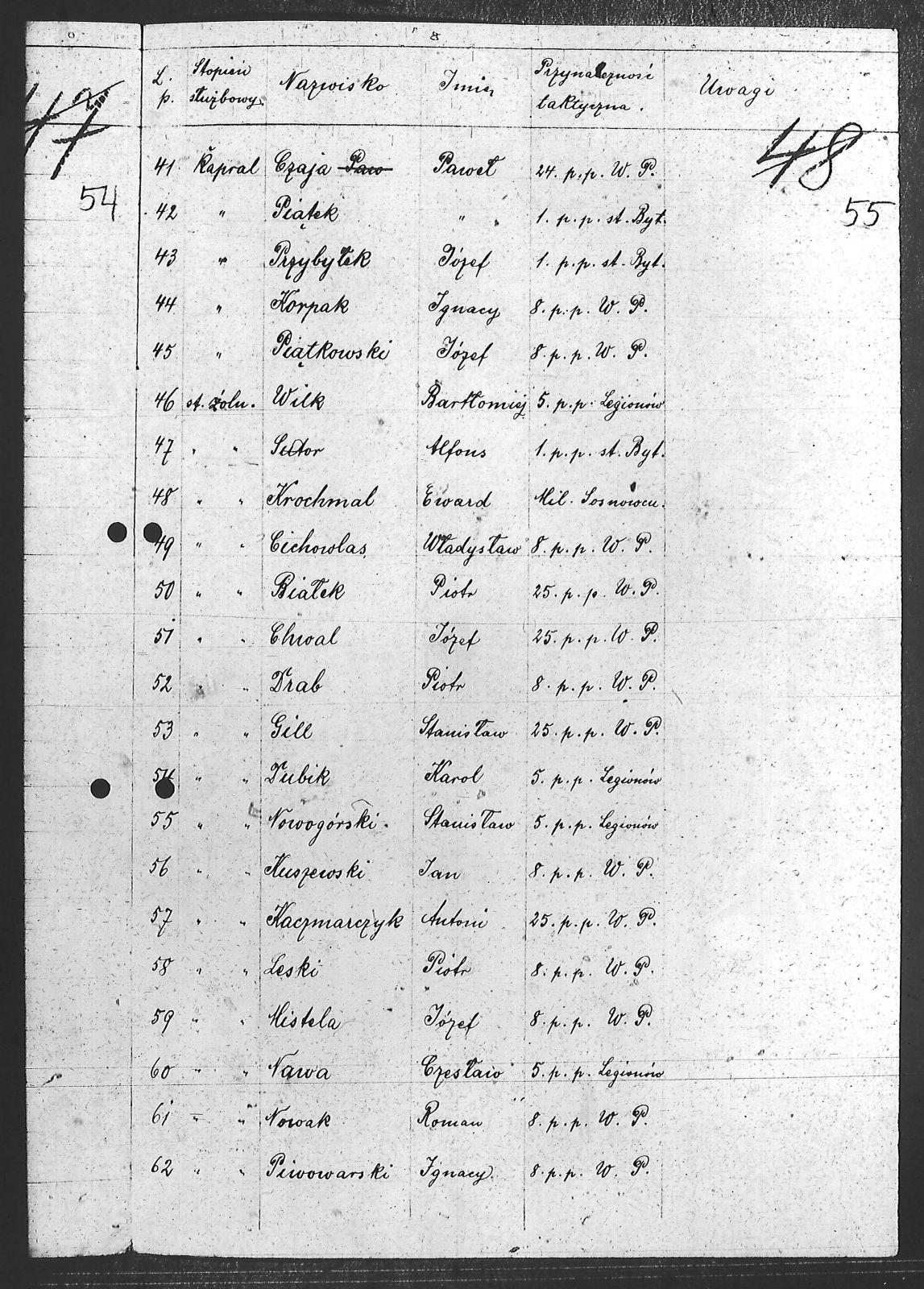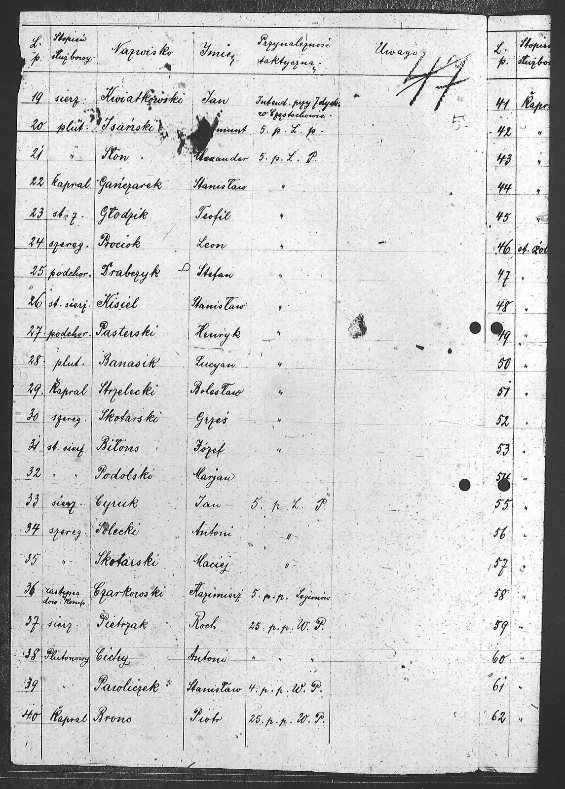 Banasik, Lucjan; Białek, Piotr; Bil, Józef; Biłons, Józef; Bruno, Piotr; Cettis, Romuald; Chwal, Józef; Cichowlas, Władysław; Cichy, Antoni; Cyruk, Jan; Czaja, Paweł; Czarkowski, Kazimierz; Drab, Piotr; Drabczyk, Stefan; Dubik, Karol; Gańczarek, Stanisław; Gil, Stanisław; Glogier, Rudolf; Głodzik, Teofil; Histela, Józef; Isański, Zygmunt; Jastrzębski, Stanisław; Kaczmarczyk, Antoni; Kisiel, Stanisław; Koczwara, Marian; Kołodziej, Franciszek; Korpak, Ignacy; Kozioł, Jan; Krochmal, Edward; Krych, Józef; Krzyżanowski, Tadeusz; Kuszewski, Jan; Kwiatkowski, Jan; Leski, Piotr; Liszka, Stanisław; Małota, Jan; Nawa, Czesław; Nowak, Roman; Nowogórski, Stanisław; Padolski, Marian; Palimąka, Paweł; Pasterski, Henryk; Pawliczek, Stanisław; Piątek, Paweł; Piątkowski, Józef; Pietrzak, Roch; Piwowarski, Ignacy; Pożeć, Stanisław; Prociok, Leon; Pruchałka; Przybyłek, Józef; Skotarski, Grzegorz; Skotarski, Maciej; Słoń, Aleksander; Słowik, Jan; Solecki, Antoni; Solecki, Stanisław; Stempisz, Feliks; Strzelecki, Bolesław; Sutor, Alfons; Taranowski, Antoni; Tyka, Jan; Wilk, Bartłomiej; Wisniowski, Kazimierz; Wróblewski, Stanisław; Zapałowicz, Józef; |