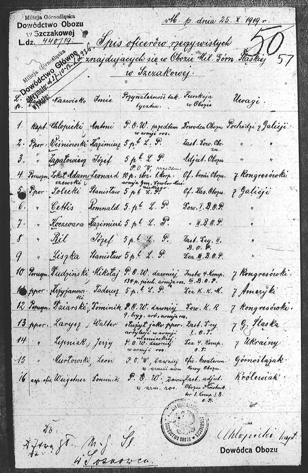 | Tytuł | Spis oficerów rzeczywistych znajdujących się w Obozie Milicji Górnośląskiej w Szczakowej |