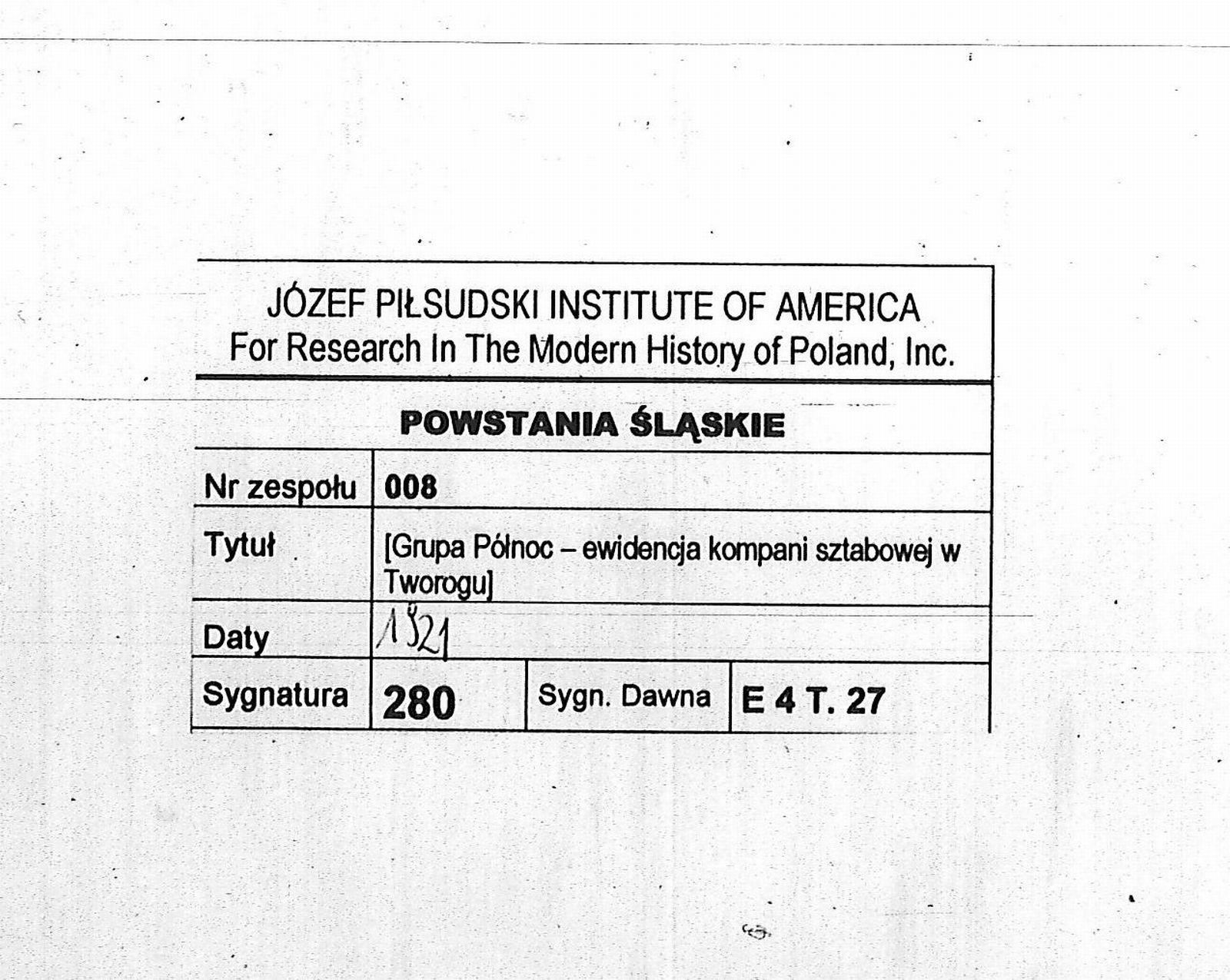 Tytuł Grupa Północ - ewidencja kompanii sztabowej w Tworogu