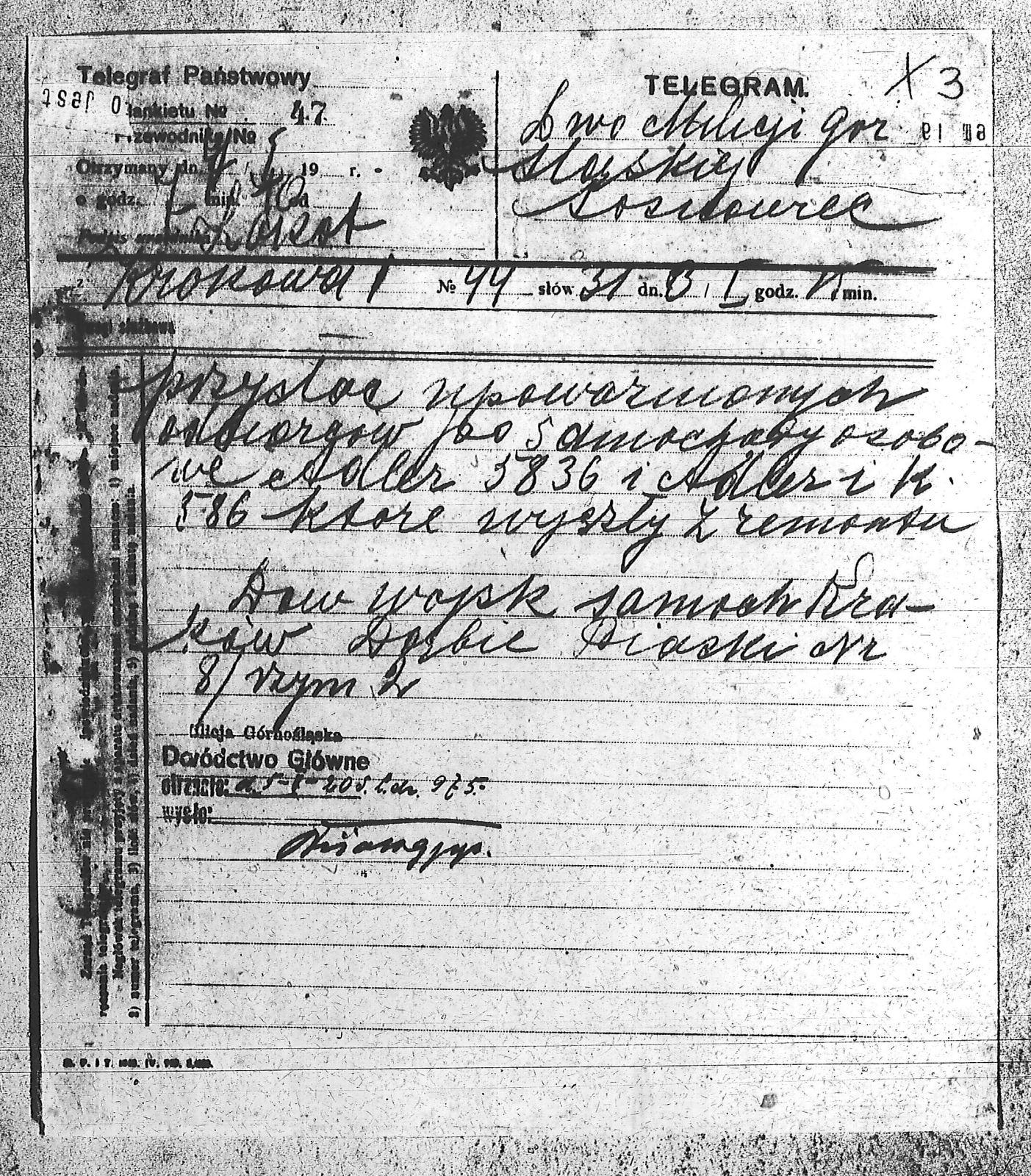 Tytuł Telegram - z Krakowa do Milicji Górnośląskiej Główne Dowództwo w Sosnowcu