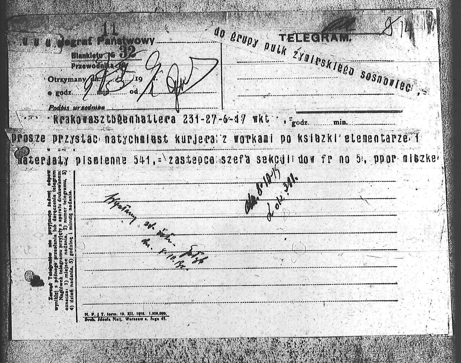 Tytuł Telegram - z Krakowa do grupy pułkownika Żymirskiego, Sosnowiec