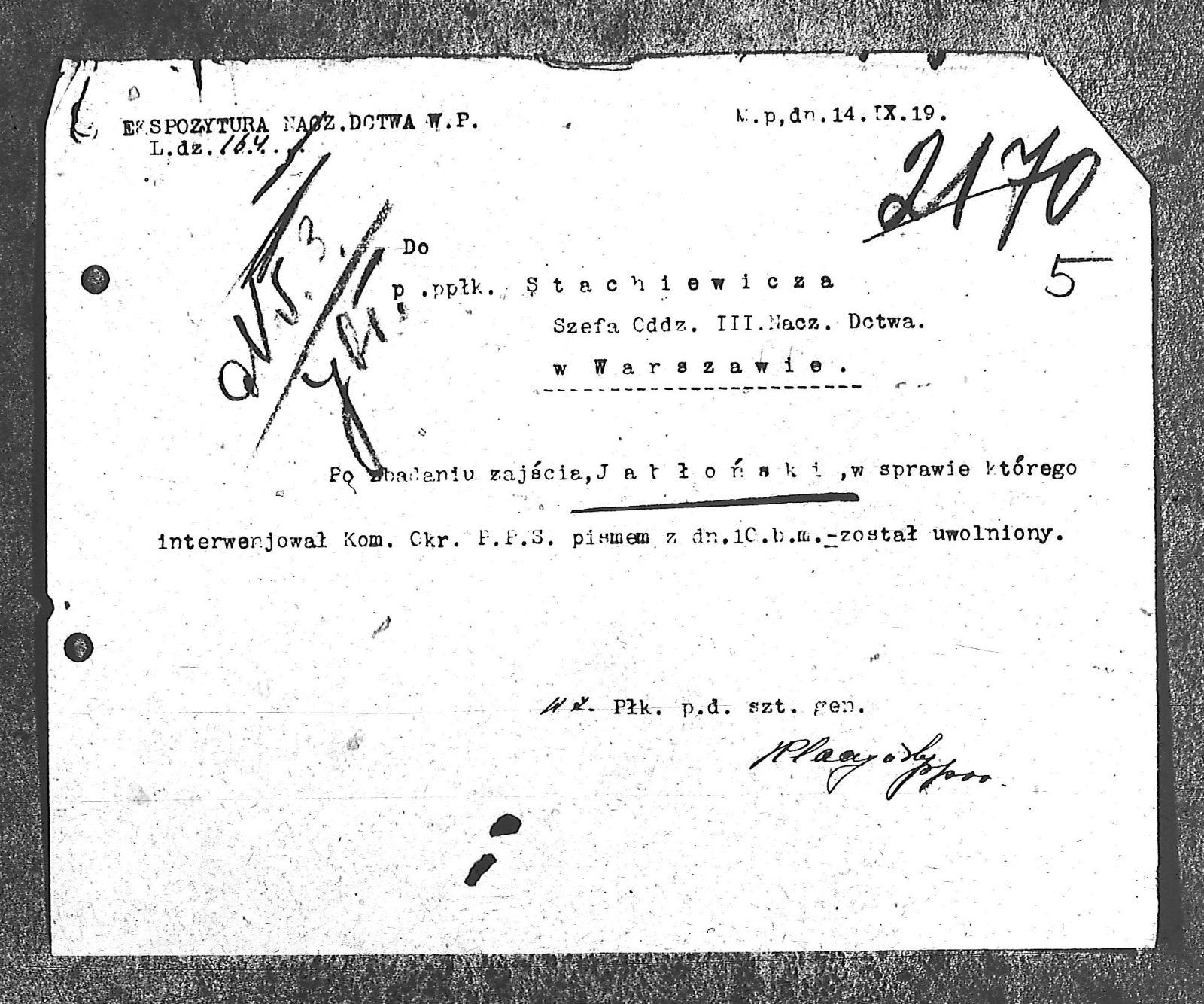 | Tytuł | Do podpułkownika Stachiewicza Szefa Oddziału III Naczelnego Dowództwa w Warszawie |