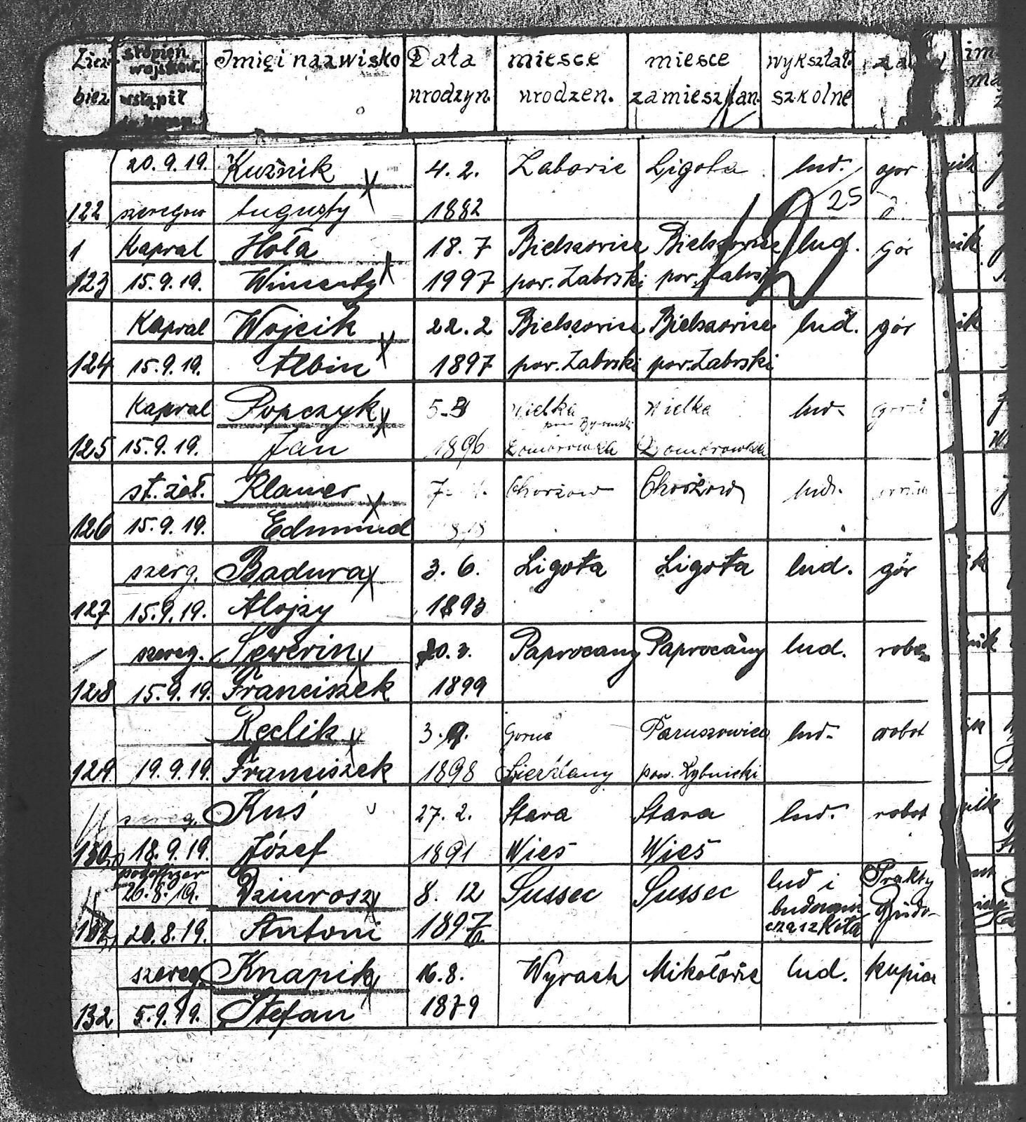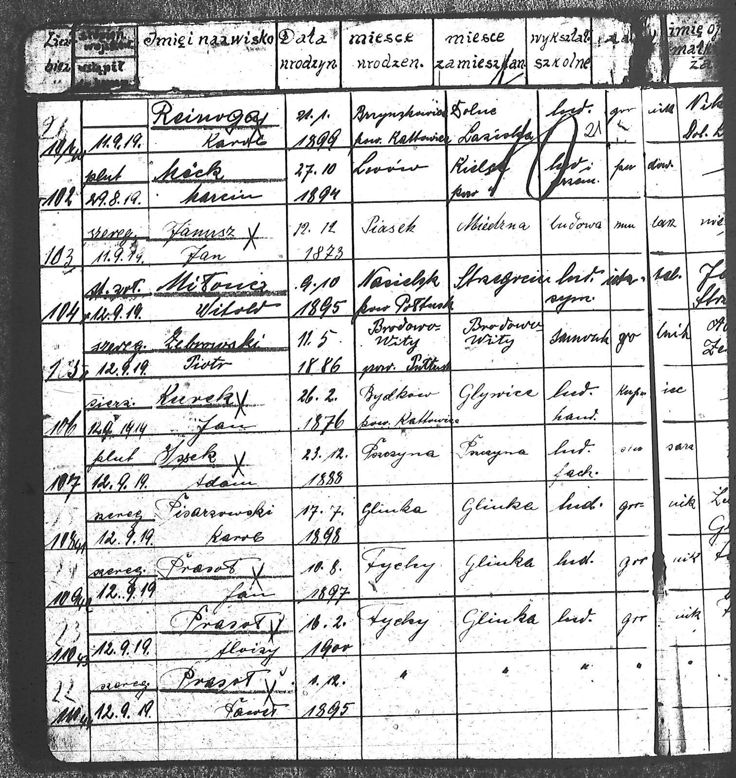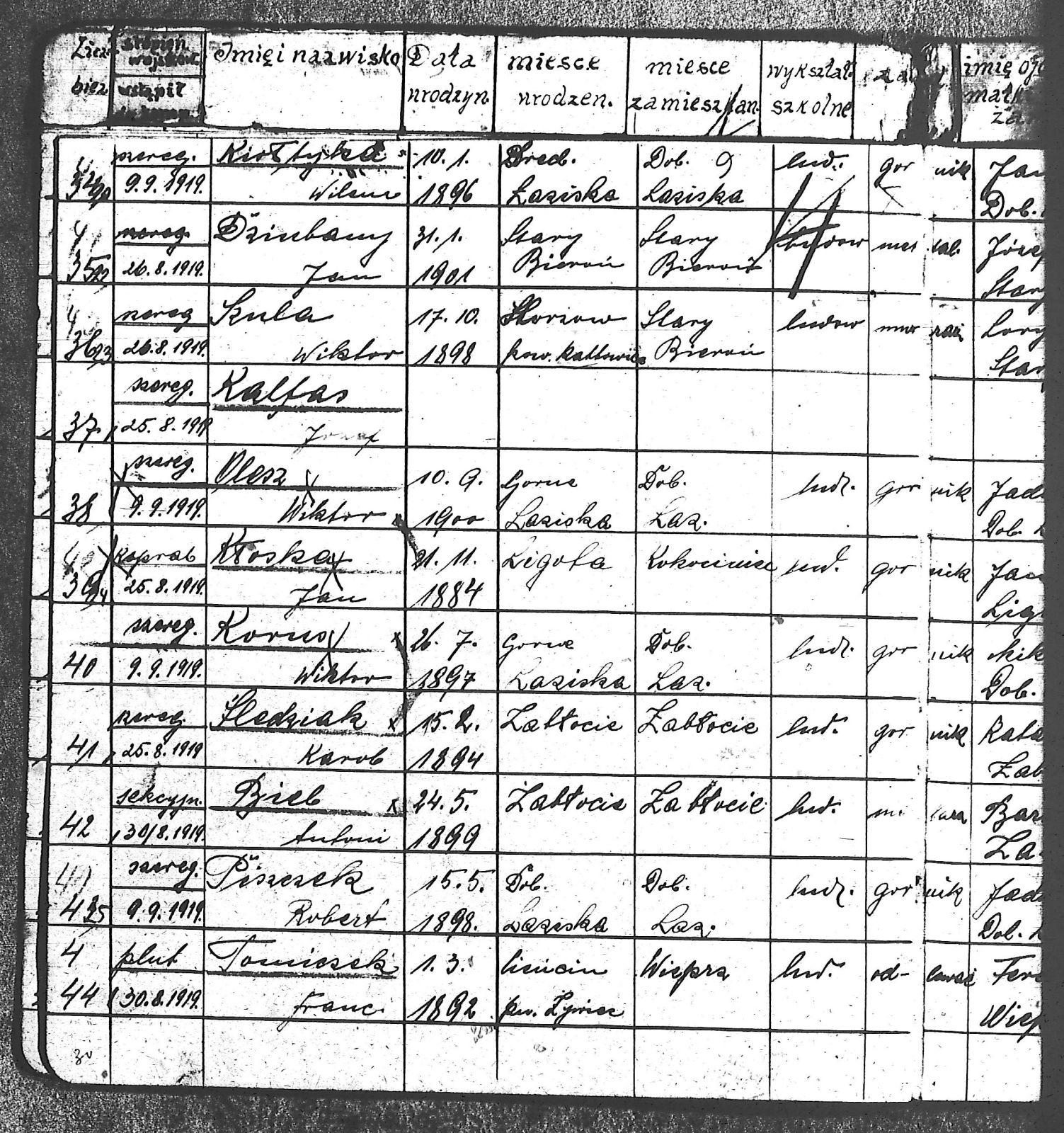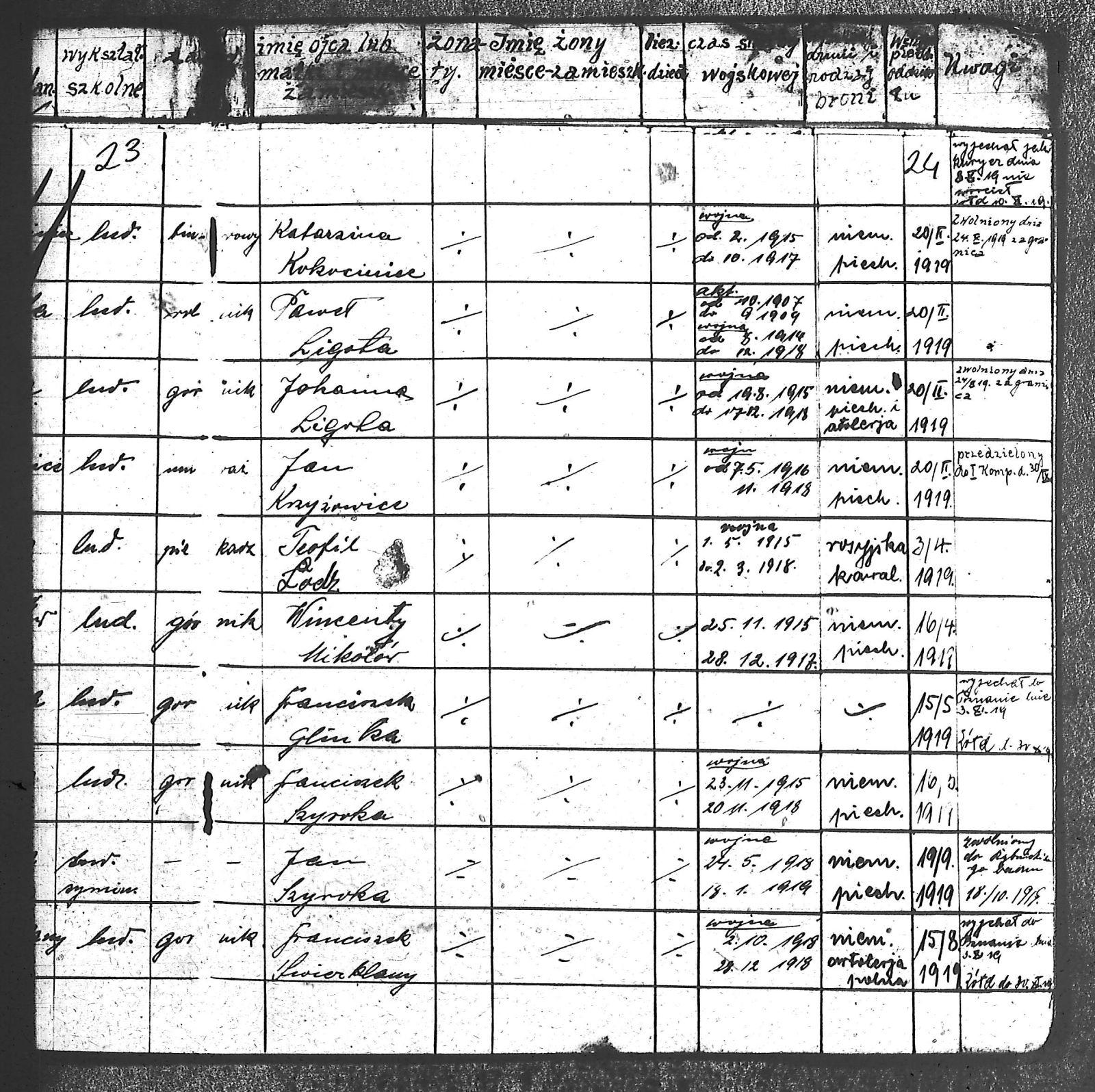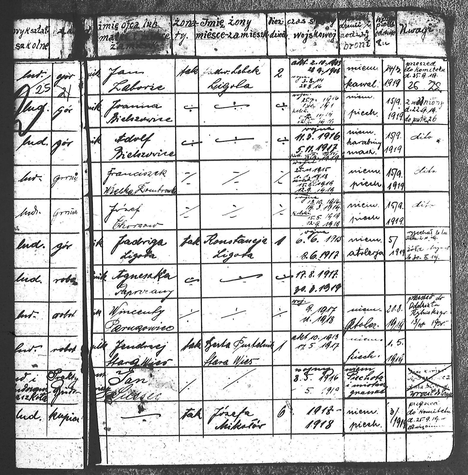 Adam, Stanisław; Badura, Alojzy; Baran, Tomasz; Biel; Biel, Antoni; Bienia, Ignacy; Boidoł, Wilem; Borowski, Jan; Brassy, Alfred; Brassy, Bruno; Bromboszcz, Wincenty; Broncel, Tomasz; Buczek, ; Budny, Teofil; Bywalec, Stanisław; Cebula, Franciszek; Ciastoń, Antoni; Cimala, August; Cofała, Kazimierz; Coida, Ludwig; Czympas, Teodor; Drobik, Wilem; Duda, Józef; Dziubany, Jan; Dziurosz, Antoni; Fizia, Paweł; Fyda, Jan; Fyjak, Karol; Gabrych, Kazimierz; Gasz, Franciszek; Gawin, Robert; Gibas, Andrzej; Golus, Ludwik; Goroń, Antoni; Gowin, Józef; Hoła, Wincenty; Ispek, Adam; Jadamus, Jan; Jadamus, Wawrzyn; Jakubowski, Stefan; Janusz, Jan; Kalfas, Józef; Kapczak, Franciszek; Kapczak, Michał; Kiełtyka, Teodor; Kiełtyka, Wilem; Klamer, Edmund; Kłoska, Jan; Knapik, Stefan; Kocima, Leopold; Kocurek, Franciszek I; Kocurek, Jan; Kocurek, Józef; Kocurek, Klemens; Kocurek, Walenty; Kopański, Franciszek; Kopański, Józef; Korus, Wiktor; Kowal, Józef; Kozłowski, Stanisław; Krupa, Józef; Kuc, Walenty; Kucharski, Stanisław; Kucharski, Władysław; Kurczok, Paweł; Kurek, Jan; Kuś, Józef; Kuźnik, Augustyn; Labuzda, Stanisław; Lichnowski, Jan; Loska, Stanisław; Lubecki, Sylwester; Ludziarczyk, Edward; Łukaszek, Jan; Małek, Augustyn; Mandrysz, Jan; Mansfeld, Ernest; Mańka, Jan; Matlakiewicz, Jakub; Miłoncz, Wiktor; Möck, Marcin; Moroń, Teodor; Olesz, Wiktor; Oprzondek, Jan; Optułowicz, Franciszek; Ostrowski, Władysław; Otrzonsek, Jan; Pajonk, Mikołaj; Pajonk, Stanisław; Pajonk, Wilem; Pawełczyk, Walenty; Pawełek, Jan; Pawlus, Antoni; Pawlus, Roman; Piecha, Emanuel; Piecha, Jan; Piecha, Julian; Piekarczyk, Franciszek; Pisarzowski, Karol; Piszczek, Robert; Płoch, Wincenty; Popczyk, Jan; Prasoł, Alojzy; Prasoł, Jan; Prasoł, Paweł; Pukocz, Jan; Pukocz, Paweł; Pukocz, Robert; Pyras, Jan; Pysz, Jan; Pysz, Leon; Pysz, Ludwig; Reclik, Franciszek; Reinoga, Karol; Sanetra, Jan; Sewerin, Franciszek; Sikora, Jan; Sikora, Józef; Skupnik, Jan; Sobik, Karol; Staś, Teodor; Stawowy, Teodor; Styncel, Karol; Suchoński, Józef; Szmajduch, Franciszek II; Szula, Wiktor; Szuta, Wacław; Szymacha, Józef; Śledziak, Józef; Śledziak, Karol; Tomiczek, Franciszek; Urbański, Tomasz; Wadas, Karol; Wanky, Karol; Wanzel, Andrzej; Wanzel, Józef; Weszka, Piotr; Wiatr, Józef; Widuch, Walenty; Wieczorek, Jan; Wilk, Józef; Winkler, Ernest; Witta, Emil; Wojcik, Albin; Wojewodzic, Ludwig; Wolny, Szczepan; Wosalik, Józwf; Woźniakowski, Wilem; Wrona, Mikołaj; Wyleżoł, Paweł; Zielonka, Piotr; Żebrowski, Piotr; Żmija, Józef; |