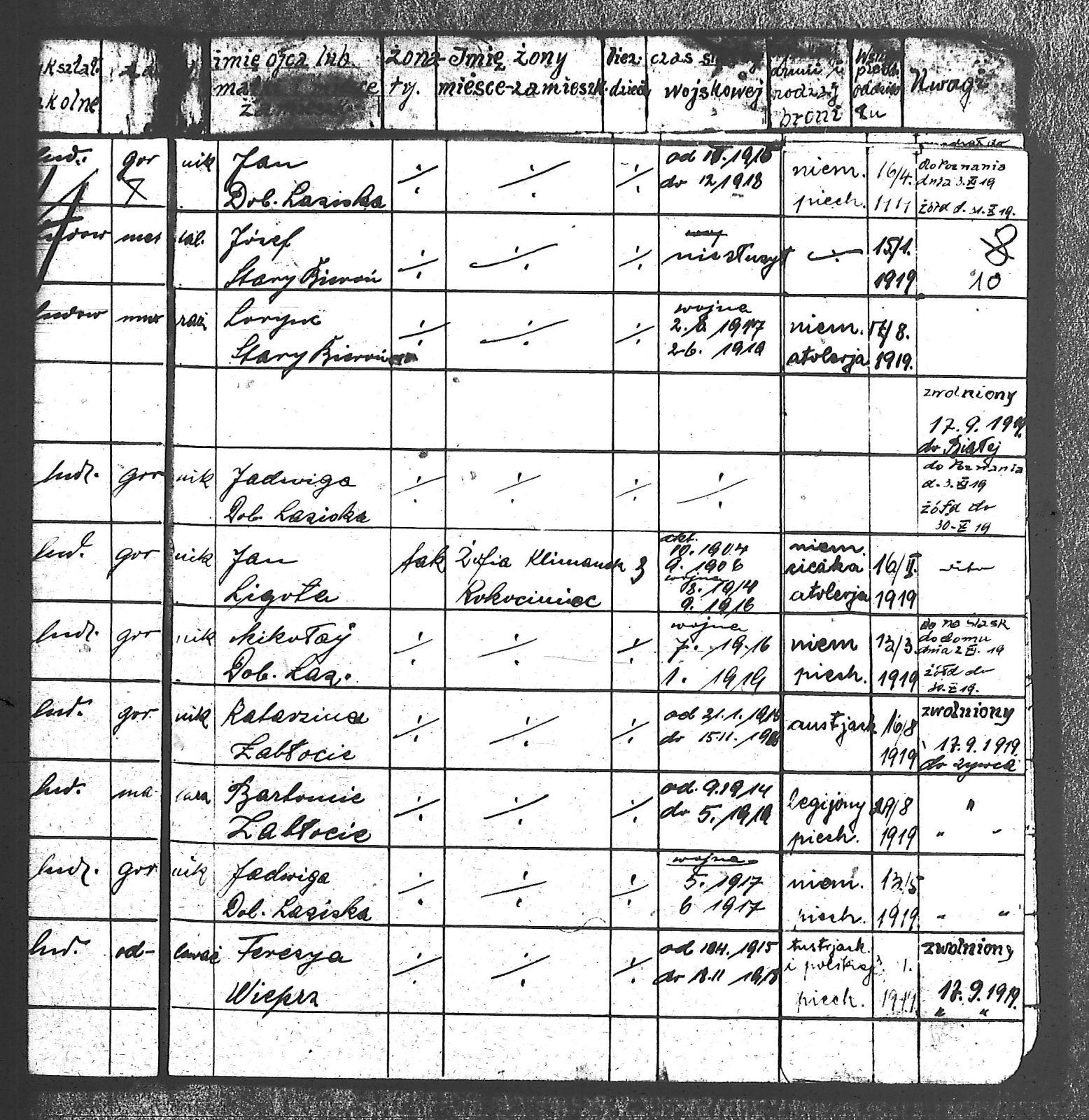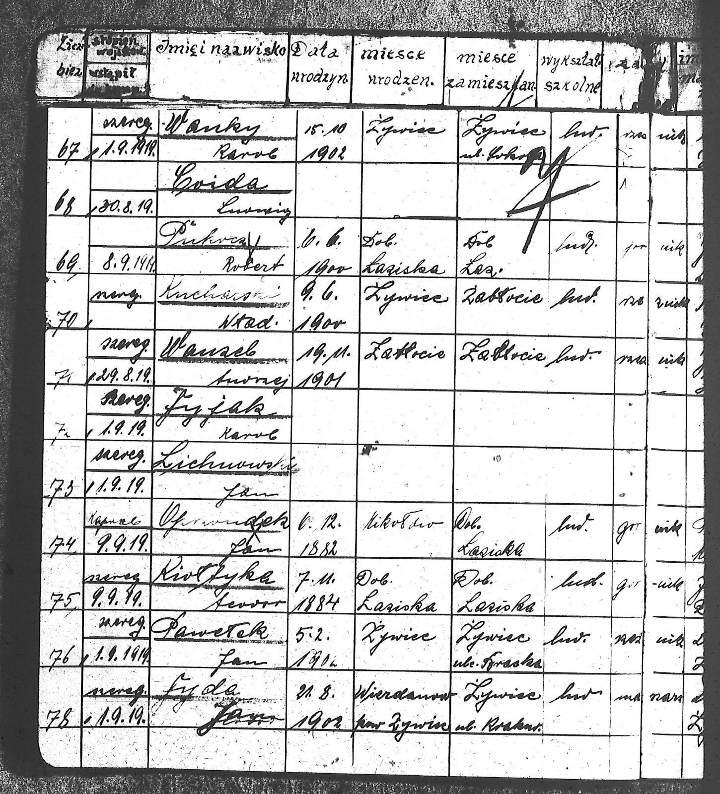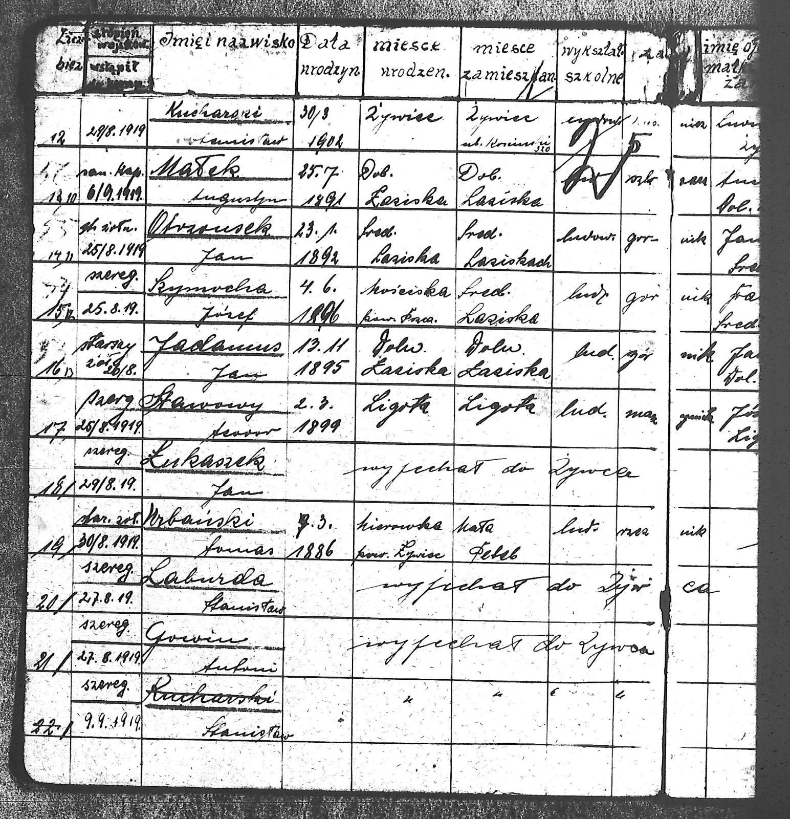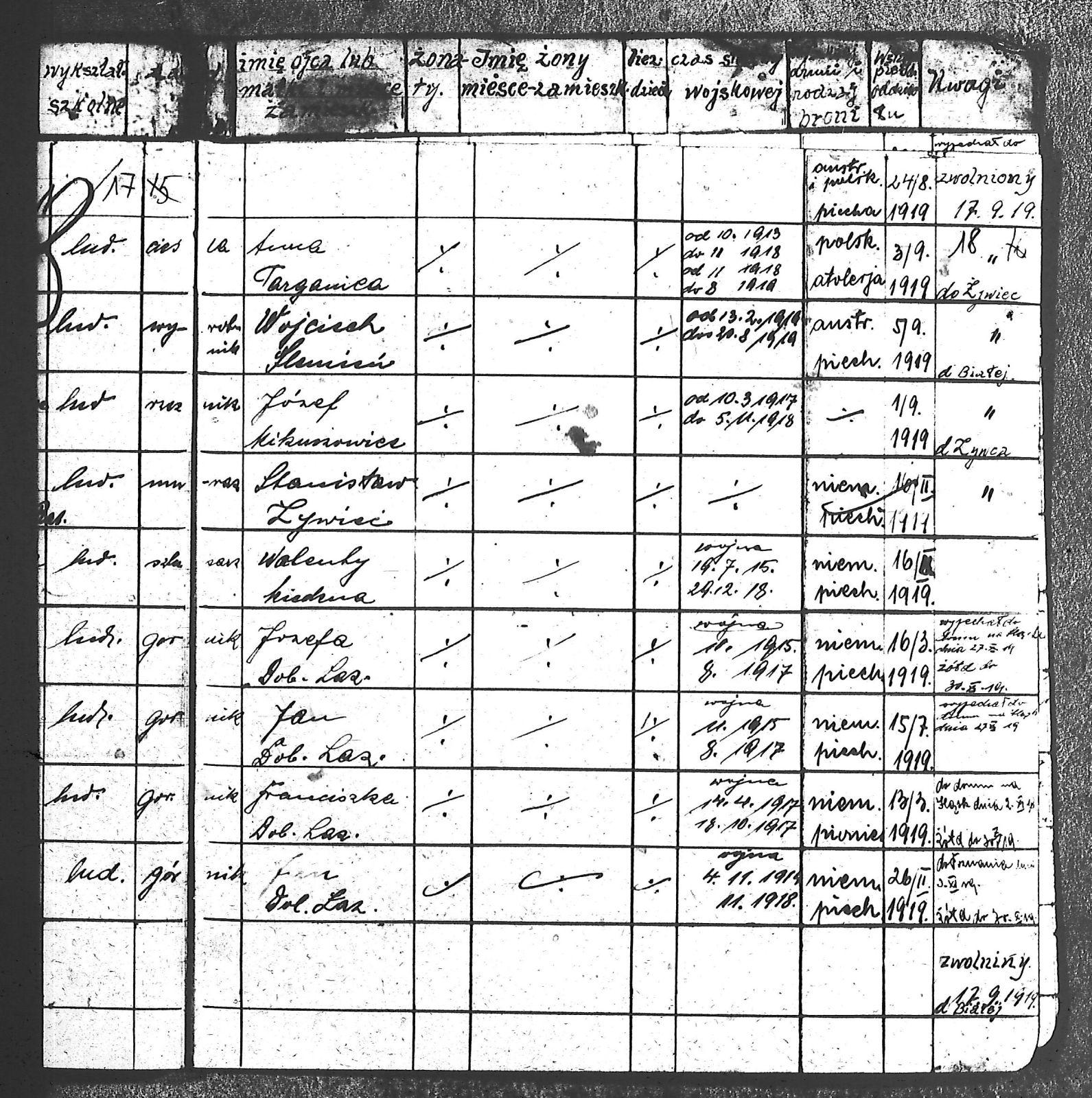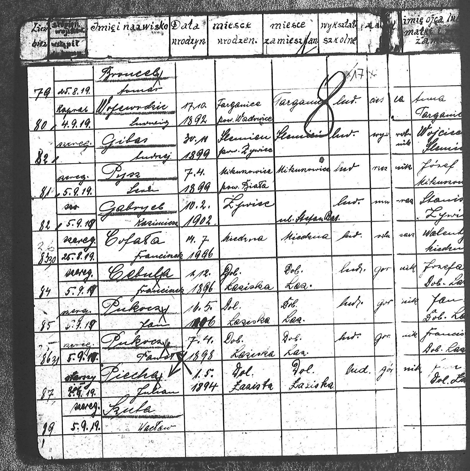 Adam, Stanisław; Badura, Alojzy; Baran, Tomasz; Biel; Biel, Antoni; Bienia, Ignacy; Boidoł, Wilem; Borowski, Jan; Brassy, Alfred; Brassy, Bruno; Bromboszcz, Wincenty; Broncel, Tomasz; Buczek, ; Budny, Teofil; Bywalec, Stanisław; Cebula, Franciszek; Ciastoń, Antoni; Cimala, August; Cofała, Kazimierz; Coida, Ludwig; Czympas, Teodor; Drobik, Wilem; Duda, Józef; Dziubany, Jan; Dziurosz, Antoni; Fizia, Paweł; Fyda, Jan; Fyjak, Karol; Gabrych, Kazimierz; Gasz, Franciszek; Gawin, Robert; Gibas, Andrzej; Golus, Ludwik; Goroń, Antoni; Gowin, Józef; Hoła, Wincenty; Ispek, Adam; Jadamus, Jan; Jadamus, Wawrzyn; Jakubowski, Stefan; Janusz, Jan; Kalfas, Józef; Kapczak, Franciszek; Kapczak, Michał; Kiełtyka, Teodor; Kiełtyka, Wilem; Klamer, Edmund; Kłoska, Jan; Knapik, Stefan; Kocima, Leopold; Kocurek, Franciszek I; Kocurek, Jan; Kocurek, Józef; Kocurek, Klemens; Kocurek, Walenty; Kopański, Franciszek; Kopański, Józef; Korus, Wiktor; Kowal, Józef; Kozłowski, Stanisław; Krupa, Józef; Kuc, Walenty; Kucharski, Stanisław; Kucharski, Władysław; Kurczok, Paweł; Kurek, Jan; Kuś, Józef; Kuźnik, Augustyn; Labuzda, Stanisław; Lichnowski, Jan; Loska, Stanisław; Lubecki, Sylwester; Ludziarczyk, Edward; Łukaszek, Jan; Małek, Augustyn; Mandrysz, Jan; Mansfeld, Ernest; Mańka, Jan; Matlakiewicz, Jakub; Miłoncz, Wiktor; Möck, Marcin; Moroń, Teodor; Olesz, Wiktor; Oprzondek, Jan; Optułowicz, Franciszek; Ostrowski, Władysław; Otrzonsek, Jan; Pajonk, Mikołaj; Pajonk, Stanisław; Pajonk, Wilem; Pawełczyk, Walenty; Pawełek, Jan; Pawlus, Antoni; Pawlus, Roman; Piecha, Emanuel; Piecha, Jan; Piecha, Julian; Piekarczyk, Franciszek; Pisarzowski, Karol; Piszczek, Robert; Płoch, Wincenty; Popczyk, Jan; Prasoł, Alojzy; Prasoł, Jan; Prasoł, Paweł; Pukocz, Jan; Pukocz, Paweł; Pukocz, Robert; Pyras, Jan; Pysz, Jan; Pysz, Leon; Pysz, Ludwig; Reclik, Franciszek; Reinoga, Karol; Sanetra, Jan; Sewerin, Franciszek; Sikora, Jan; Sikora, Józef; Skupnik, Jan; Sobik, Karol; Staś, Teodor; Stawowy, Teodor; Styncel, Karol; Suchoński, Józef; Szmajduch, Franciszek II; Szula, Wiktor; Szuta, Wacław; Szymacha, Józef; Śledziak, Józef; Śledziak, Karol; Tomiczek, Franciszek; Urbański, Tomasz; Wadas, Karol; Wanky, Karol; Wanzel, Andrzej; Wanzel, Józef; Weszka, Piotr; Wiatr, Józef; Widuch, Walenty; Wieczorek, Jan; Wilk, Józef; Winkler, Ernest; Witta, Emil; Wojcik, Albin; Wojewodzic, Ludwig; Wolny, Szczepan; Wosalik, Józwf; Woźniakowski, Wilem; Wrona, Mikołaj; Wyleżoł, Paweł; Zielonka, Piotr; Żebrowski, Piotr; Żmija, Józef; |