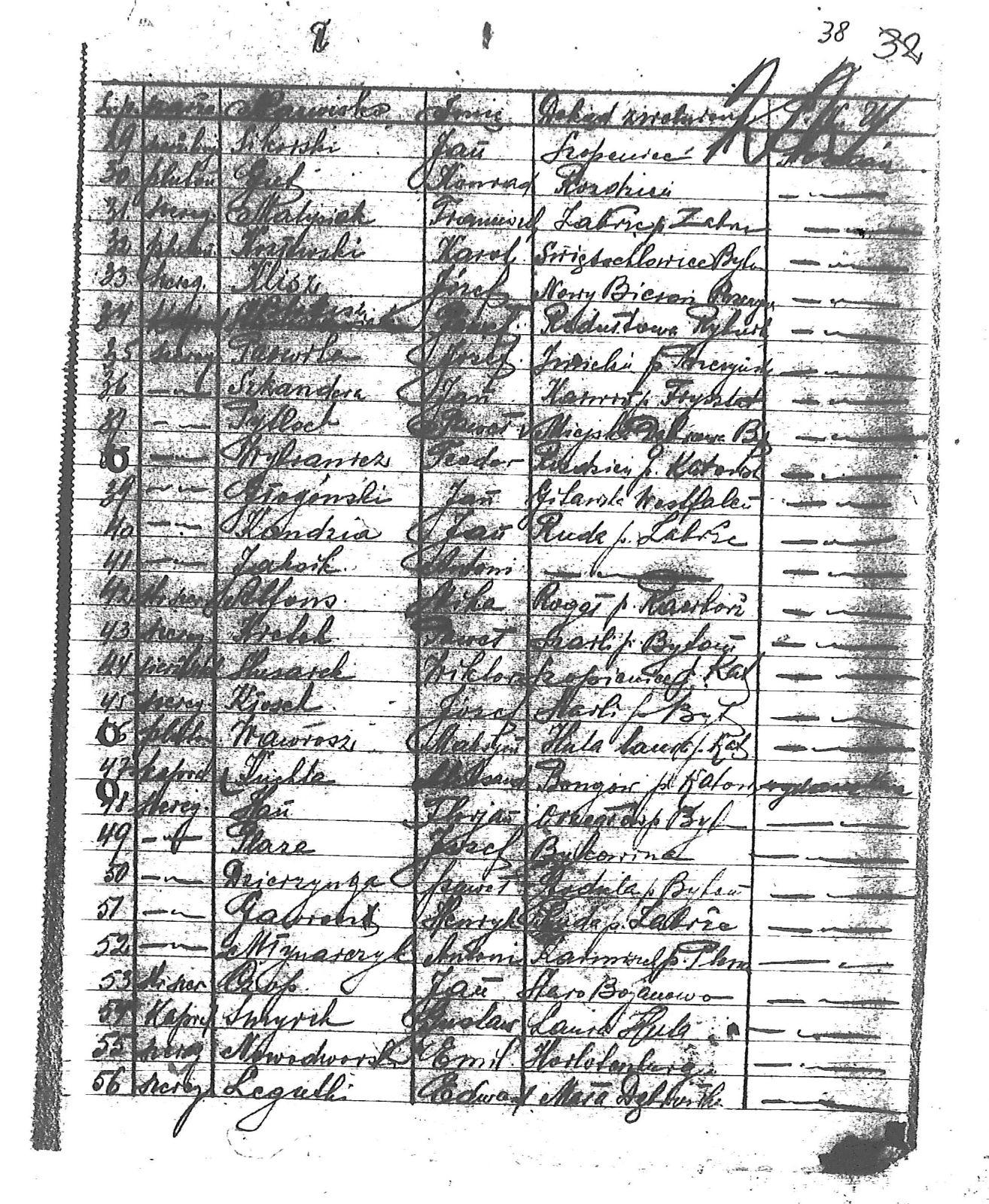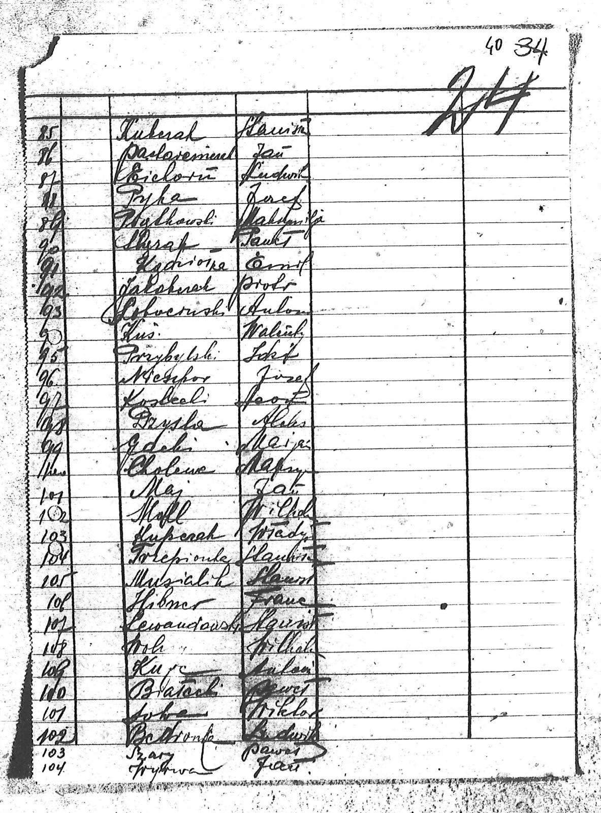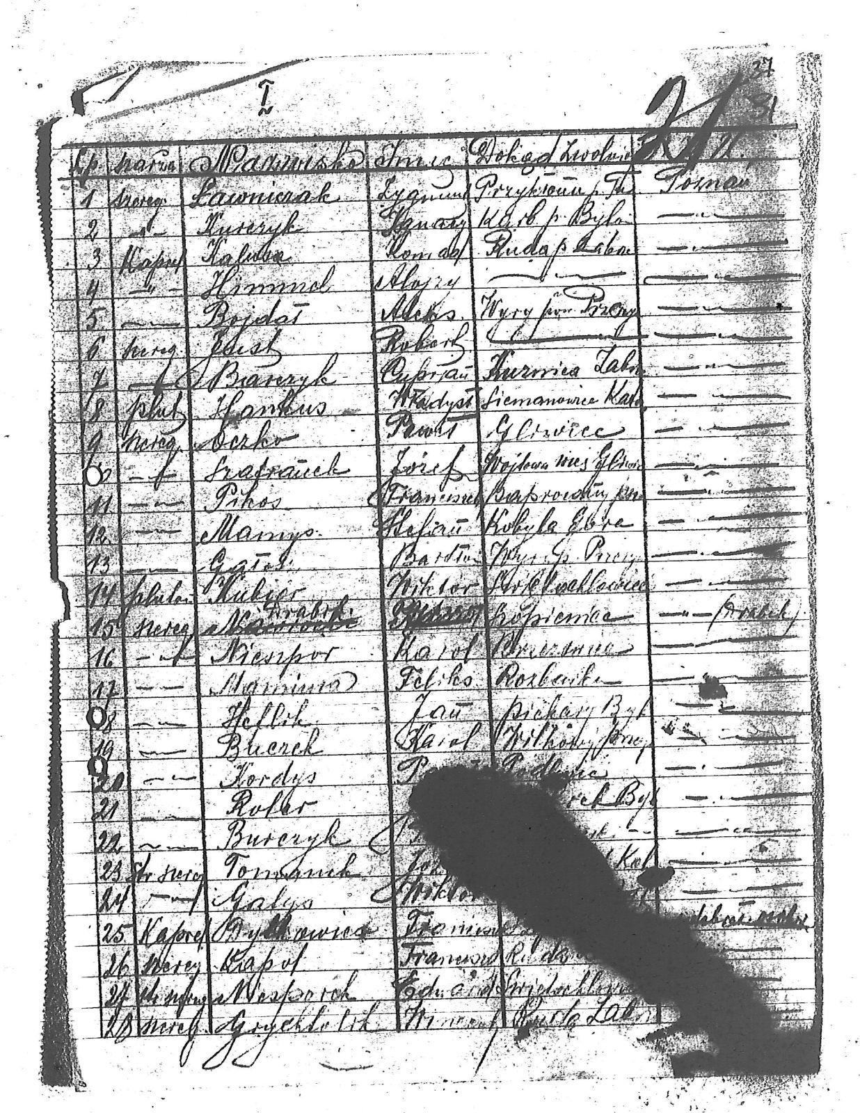 Alfons, Michał; Barczyk, Cyprian; Białecki, Paweł; Biedronka, Ludwik; Blotisz, Paweł; Bogatka, Stefan; Bojdoł, Aleksander; Buczek, Karol; Burczyk; Cepienka, Tomasz; Cholewa, Maksymilian; Cichoń, Ludwik; Czop, Jan; Dobjas, Jan; Dobjas, Wilhelm; Domański, Ludwik; Drabik, Ryszard; Dramski, Mateusz; Druh, Bronisław; Dyllowicz, Franciszek; Dzierzynga, Paweł; Dzysla, Aleksander; Fajkus, Franciszek; Flak, Tomasz; Gacki, Marian; Galys, Wiktor; Gałosz, Bartłomiej; Gawron, Henryk; Głogowski, Jan; Gola, Paweł; Grychtolik, Wincenty; Gumuła, Paweł; Gut, Konrad; Hankus, Władysław; Hań, Florian; Heflik, Jan; Hibner, Franciszek; Himmel, Alojzy; Holadin, Józef; Imiolczyk, Wilhelm; Irykrawicz, Teodor; Jaksik, Antoni; Jakubczak, Piotr; Jambor, Józef; Just, Robert; Kajntoch, Bernard; Kalusa, Konrad; Kandzia, Jan; Kapol, Franciszek; Kędziołka, Emil; Klisz, Józef; Kłosek, Józef; Kordys, Paweł; Kostecki, Leon; Kostka, Marian; Kotyrba, Bronisław; Kozłowski, Alojzy; Kozłowski, Karol; Kretek, Paweł; Kubczak, Stanisław; Kubica, Józef; Kubior, Wiktor; Kuchta, Aleksander; Kudelko, Wiktor; Kujc, Antoni; Kupczak, Władysław; Kurczyk, Ignacy; Kuś, Walenty; Legutki, Edward; Lempa, Stefan; Lewandowski, Stanisław; Loch, Ernest; Łabuś, Józef; Ławniczak, Zygmunt; Machnik, Roman; Maczak, Bronisław; Maj, Jan; Mamiura, Feliks; Mamys, Stefan; Marchewka, Józef; Matysiak, Franciszek; Miecha, Stefan; Młynarczyk, Antoni; Moll, Wilhelm; Motyka, Ludwik; Musialik, Stanisław; Niesporek, Edward; Nieszpor, Józef; Nieszpor, Karol; Nowodworski, Emil; Oczko, Paweł; Paruska, Józef; Pastareniczek, Jan; Piątek, Bernard; Piątek, Franciszek; Piątkowski, Maksymilian; Pikos, Franciszek; Plaza, Józef; Pocz, Jan; Pronobis, Wilhelm; Przybylski, Idzi; Pyka, Józef; Pytloch, Paweł; Rofer; Sikorski, Jan; Skocz, Henryk; Smyrek, Gustaw; Sobociński, Antoni; Sowa, Wiktor; Szafranek, Józef; Szary, Paweł; Szkandera, Jan; Ścigała, Rajnhold; Ślązak, Paweł; Ślusarek, Wiktor; Tomanik, Józef; Trzepionka, Stanisław; Wawrosz, Maksymilian; Widera, Józef; Wiśniewski, Bronisław; Wolny, Wilhelm; Wozurek, Stanisław; Wyrwa, Jan; Ząbkowski, Wincenty; |