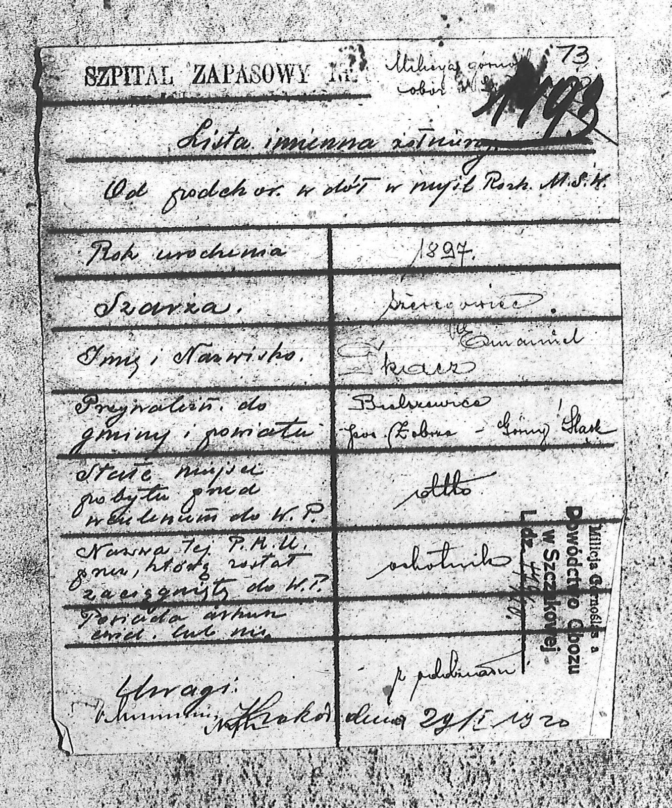 Instytucje Milicja Górnośląska. Obóz w Szczakowej. Dowództwo; Szpital Zapasowy w Krakowie