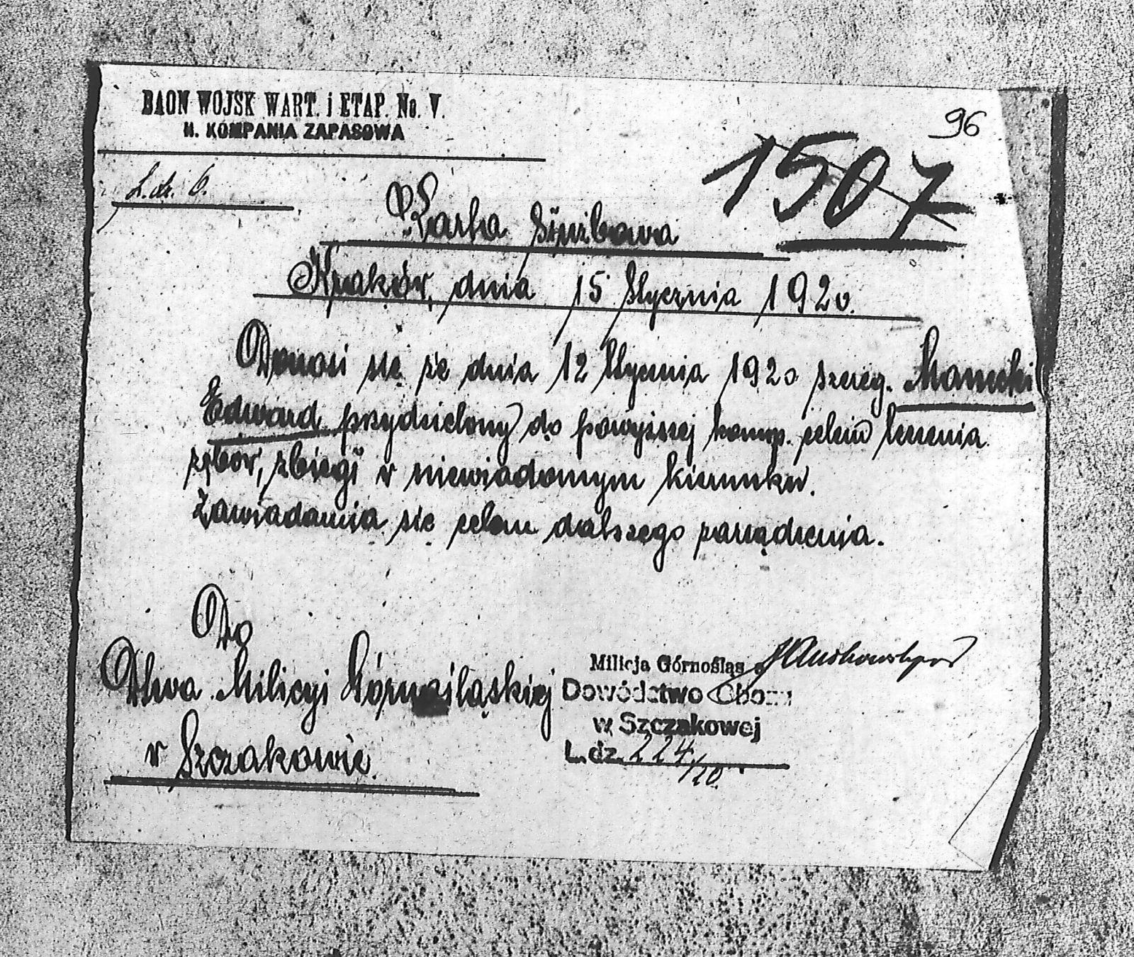 Instytucje Batalion Wojsk Wartowniczych; Milicja Górnośląska. Obóz w Szczakowej. Dowództwo. Kompania Zapasowa