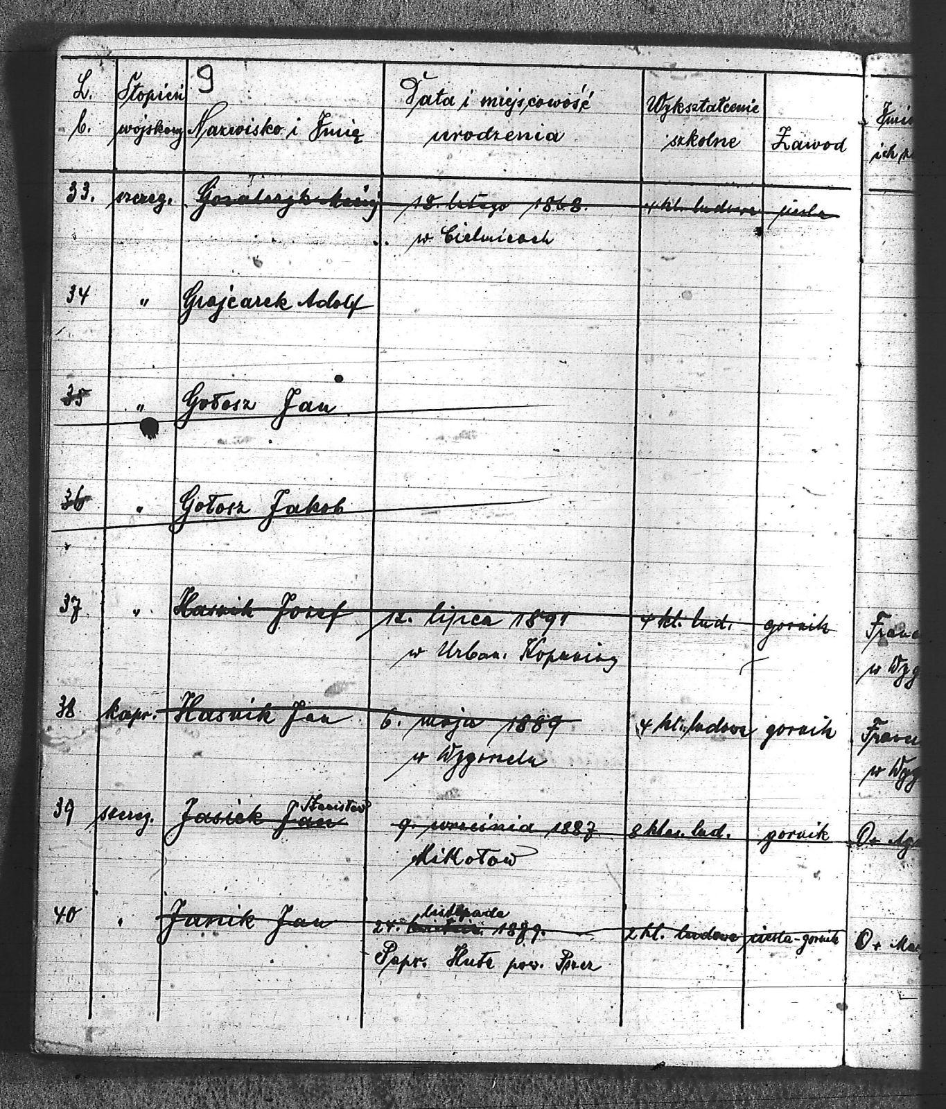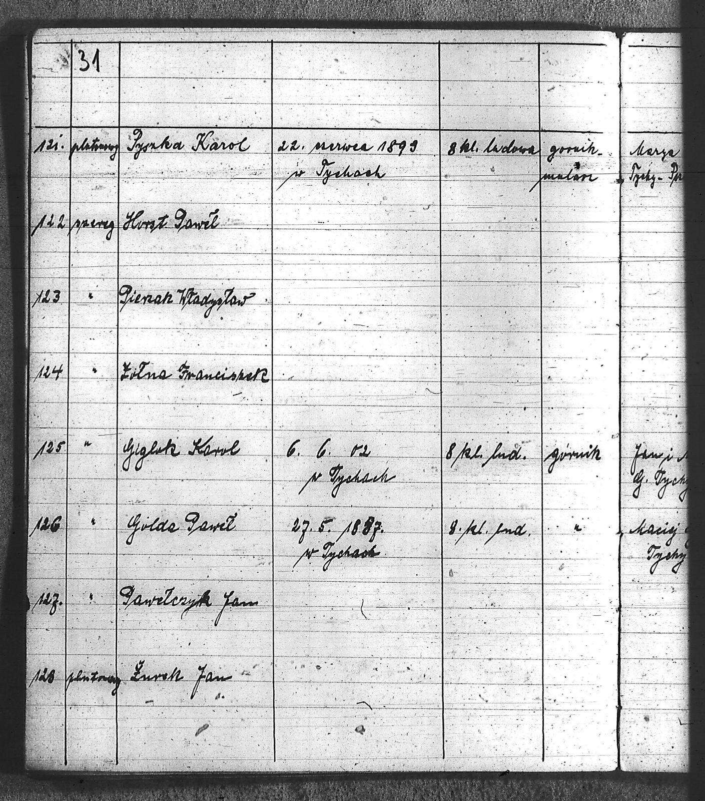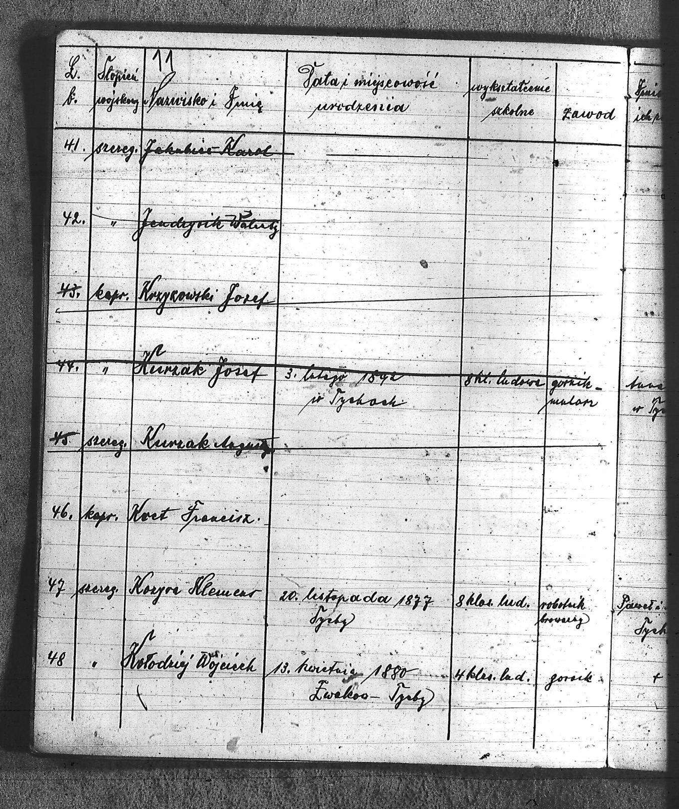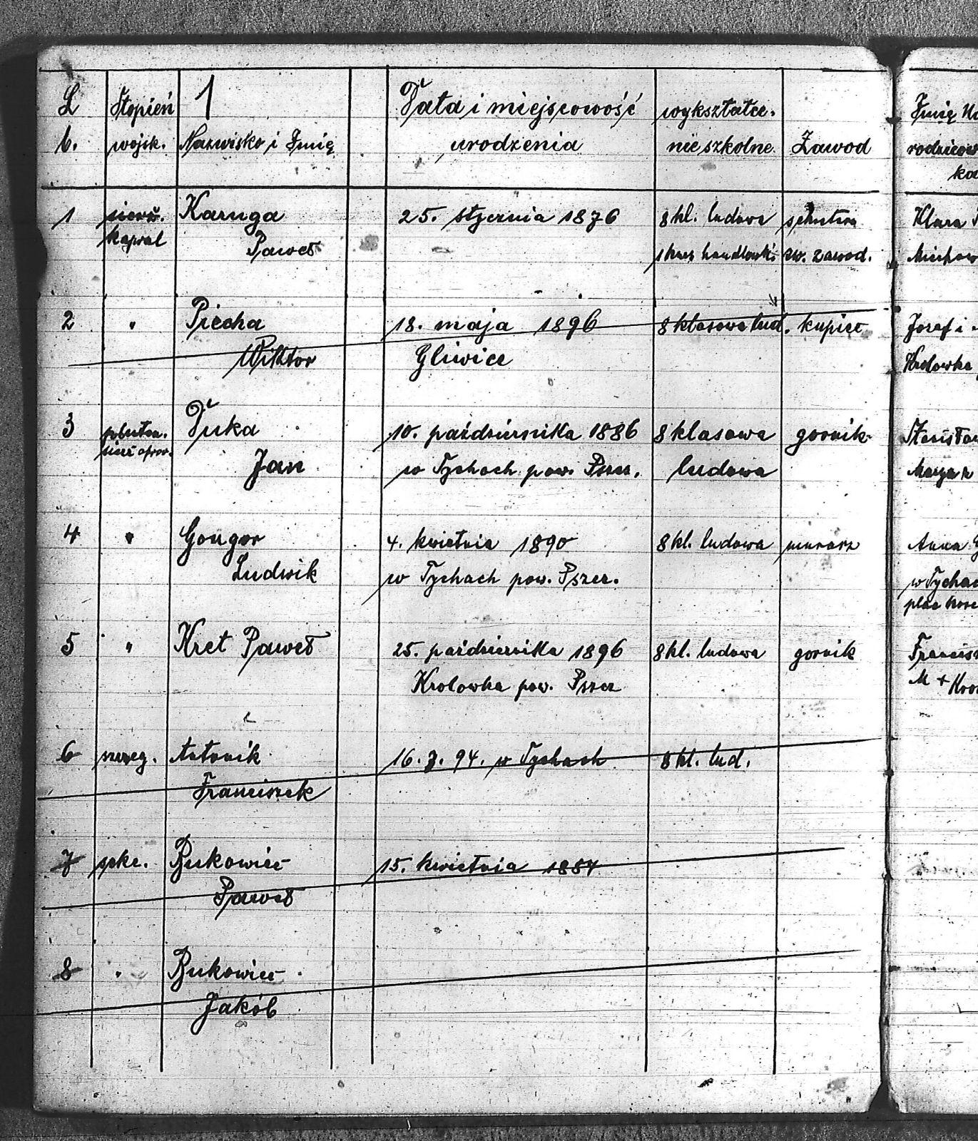 Bączyk, Józef; Bołdys, Teodor; Bończyk, Jan; Brandys, Jan; Buchalik, Franciszek; Carnynoga, Augustyn; Ciałoń, Antoni; Cimała, Augustyn; Cipa, Teofil; Czech, Franciszek; Czempas, Jan; Czernik, Alojzy; Czyba, Stefan; Drobik, Wilhelm; Drożdż, Igancy; Duka, Jan; Dziubany, Jan; Garncorz, Antoni; Giglok, Karol; Golda, Ludwik; Golda, Paweł; Gongor, Ludwik; Grajcarek, Adolf; Grzandziel, Adolf; Hachuła, Paweł; Horst, Paweł; Jakubowski, Stefan; Kapias, Franciszek; Karuga, Paweł; Kiełtyka, Teodor; Klisz, Aleksy; Kocurek, Walenty; Kołodziej, Wojciech; Kosman, Alfons; Kozyra, Klemens; Kret, Franciszek; Kret, Paweł; Krupa, Józef; Krzyżowski, Franciszek; Krzyżowski, Jan; Krzyżowski, Karol; Krzyżowski, Konrad; Krzyżyk, Karol; Kuc, Walenty; Kuchta, Andrzej; Kupiec, Robert; Latusek, Franciszek; Loska; Loska, Karol; Lubecki, Sylwester; Lysko, Paweł; Markiton, Jan; Martinus, Leopold; Mrozik, Maciej; Mucha, Wawrzyn; Mysior, Paweł; Nędza, Józef; Niesłańczy, Ludwik; Niezgoda, Franciszek; Nogły, Karol; Pala, Jakub; Pawełczyk, Jan; Piecha, Jan; Pierzak, Władysław; Pilszek, Jan; Piwałek, Franciszek; Prusek, Adam; Pustelnik, Jerzy; Pysz, Ludwik; Pyszka, Karol; Rózga, Józef; Ryt, Franciszek; Siekiera, Jan; Sitek, Jan; Skopczyk, Emil; Słomka, Józef; Staś, Teodor; Strüby, Fryderyk; Szafran, Jan; Szczygieł, Wiktor; Szczyrba, Tomasz; Szmajduch, Franciszek I; Szmajduch, Franciszek II; Ślosarczyk, Jan; Wencel, Franciszek; Wikarek, Bernard; Wilgus, Fryderyk; Wilk, Józef; Wojciech, Józef; Wojciech, Klemens; Wojtyka, Walenty; Wojtynek, Józef; Wrona, Mikołaj; Zajonc, Wojciech; Zimnol, Jakub; Zolich, Mateusz; Żmija, Józef; Żołna, Franciszek; Żurek, Jan; Żychon, Jan; |