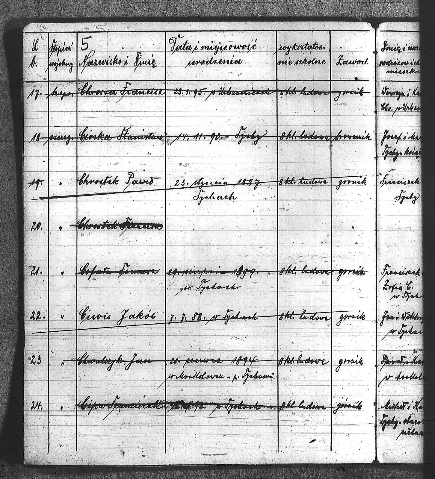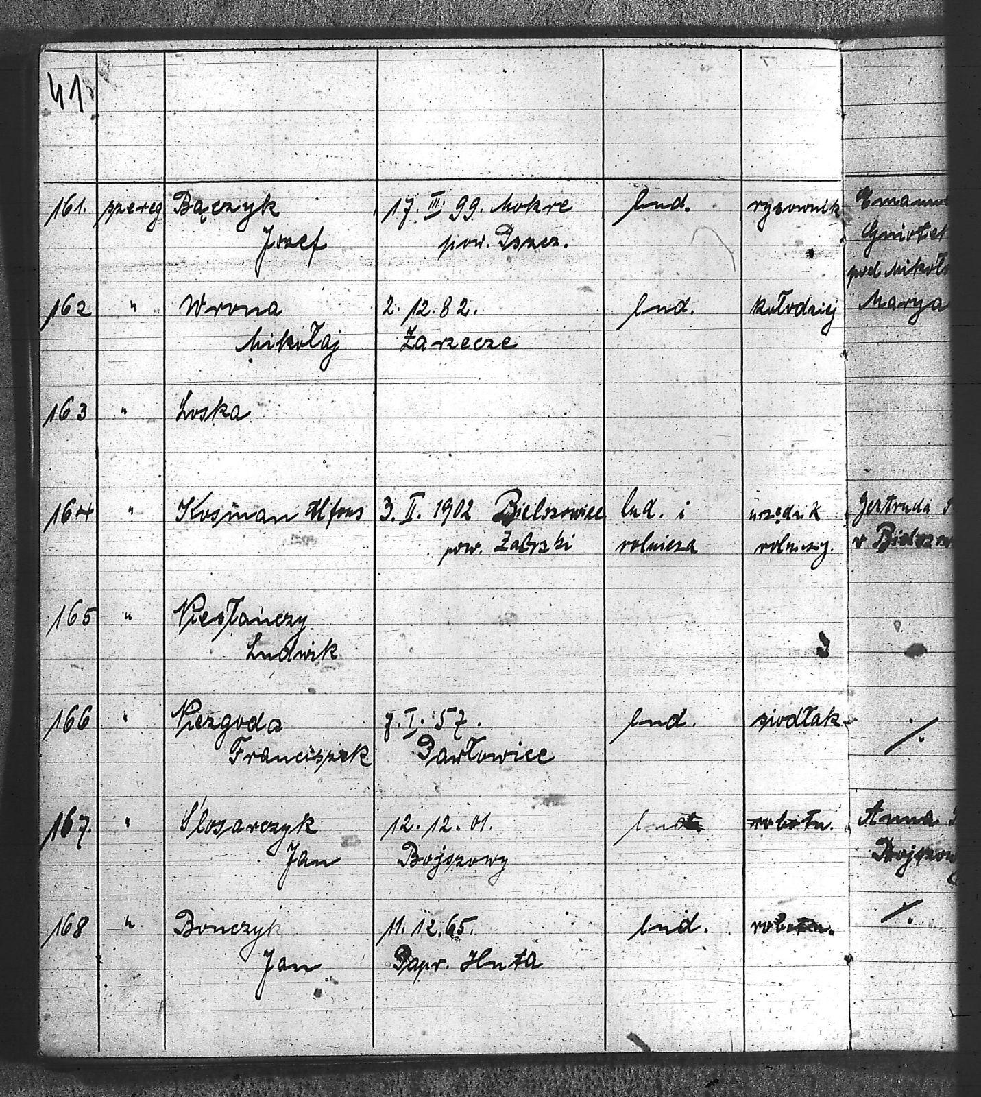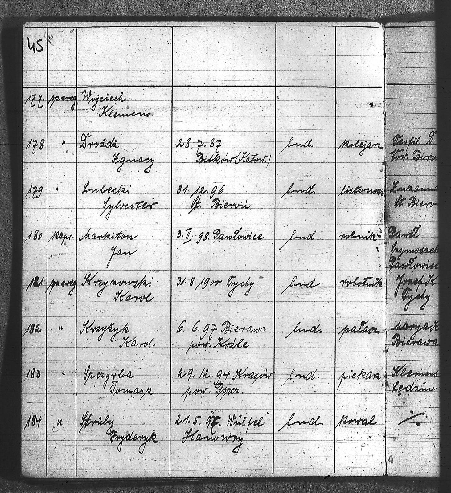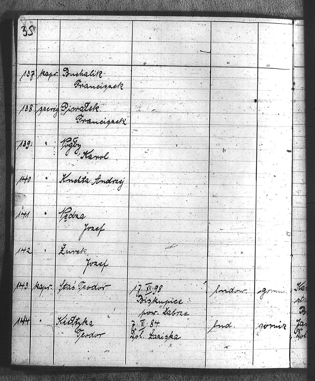 Bączyk, Józef; Bołdys, Teodor; Bończyk, Jan; Brandys, Jan; Buchalik, Franciszek; Carnynoga, Augustyn; Ciałoń, Antoni; Cimała, Augustyn; Cipa, Teofil; Czech, Franciszek; Czempas, Jan; Czernik, Alojzy; Czyba, Stefan; Drobik, Wilhelm; Drożdż, Igancy; Duka, Jan; Dziubany, Jan; Garncorz, Antoni; Giglok, Karol; Golda, Ludwik; Golda, Paweł; Gongor, Ludwik; Grajcarek, Adolf; Grzandziel, Adolf; Hachuła, Paweł; Horst, Paweł; Jakubowski, Stefan; Kapias, Franciszek; Karuga, Paweł; Kiełtyka, Teodor; Klisz, Aleksy; Kocurek, Walenty; Kołodziej, Wojciech; Kosman, Alfons; Kozyra, Klemens; Kret, Franciszek; Kret, Paweł; Krupa, Józef; Krzyżowski, Franciszek; Krzyżowski, Jan; Krzyżowski, Karol; Krzyżowski, Konrad; Krzyżyk, Karol; Kuc, Walenty; Kuchta, Andrzej; Kupiec, Robert; Latusek, Franciszek; Loska; Loska, Karol; Lubecki, Sylwester; Lysko, Paweł; Markiton, Jan; Martinus, Leopold; Mrozik, Maciej; Mucha, Wawrzyn; Mysior, Paweł; Nędza, Józef; Niesłańczy, Ludwik; Niezgoda, Franciszek; Nogły, Karol; Pala, Jakub; Pawełczyk, Jan; Piecha, Jan; Pierzak, Władysław; Pilszek, Jan; Piwałek, Franciszek; Prusek, Adam; Pustelnik, Jerzy; Pysz, Ludwik; Pyszka, Karol; Rózga, Józef; Ryt, Franciszek; Siekiera, Jan; Sitek, Jan; Skopczyk, Emil; Słomka, Józef; Staś, Teodor; Strüby, Fryderyk; Szafran, Jan; Szczygieł, Wiktor; Szczyrba, Tomasz; Szmajduch, Franciszek I; Szmajduch, Franciszek II; Ślosarczyk, Jan; Wencel, Franciszek; Wikarek, Bernard; Wilgus, Fryderyk; Wilk, Józef; Wojciech, Józef; Wojciech, Klemens; Wojtyka, Walenty; Wojtynek, Józef; Wrona, Mikołaj; Zajonc, Wojciech; Zimnol, Jakub; Zolich, Mateusz; Żmija, Józef; Żołna, Franciszek; Żurek, Jan; Żychon, Jan; |