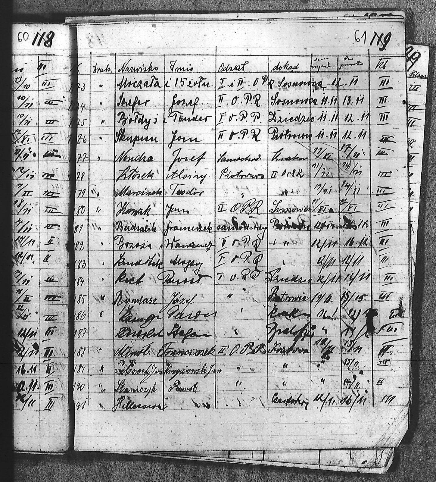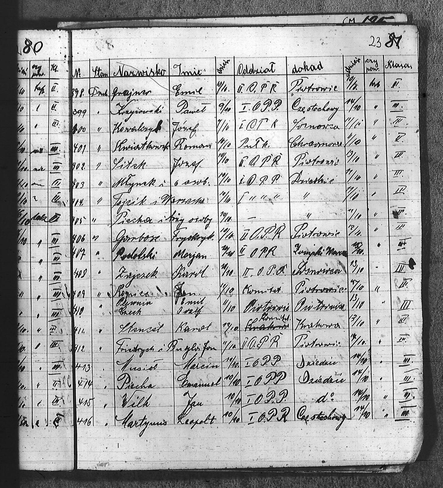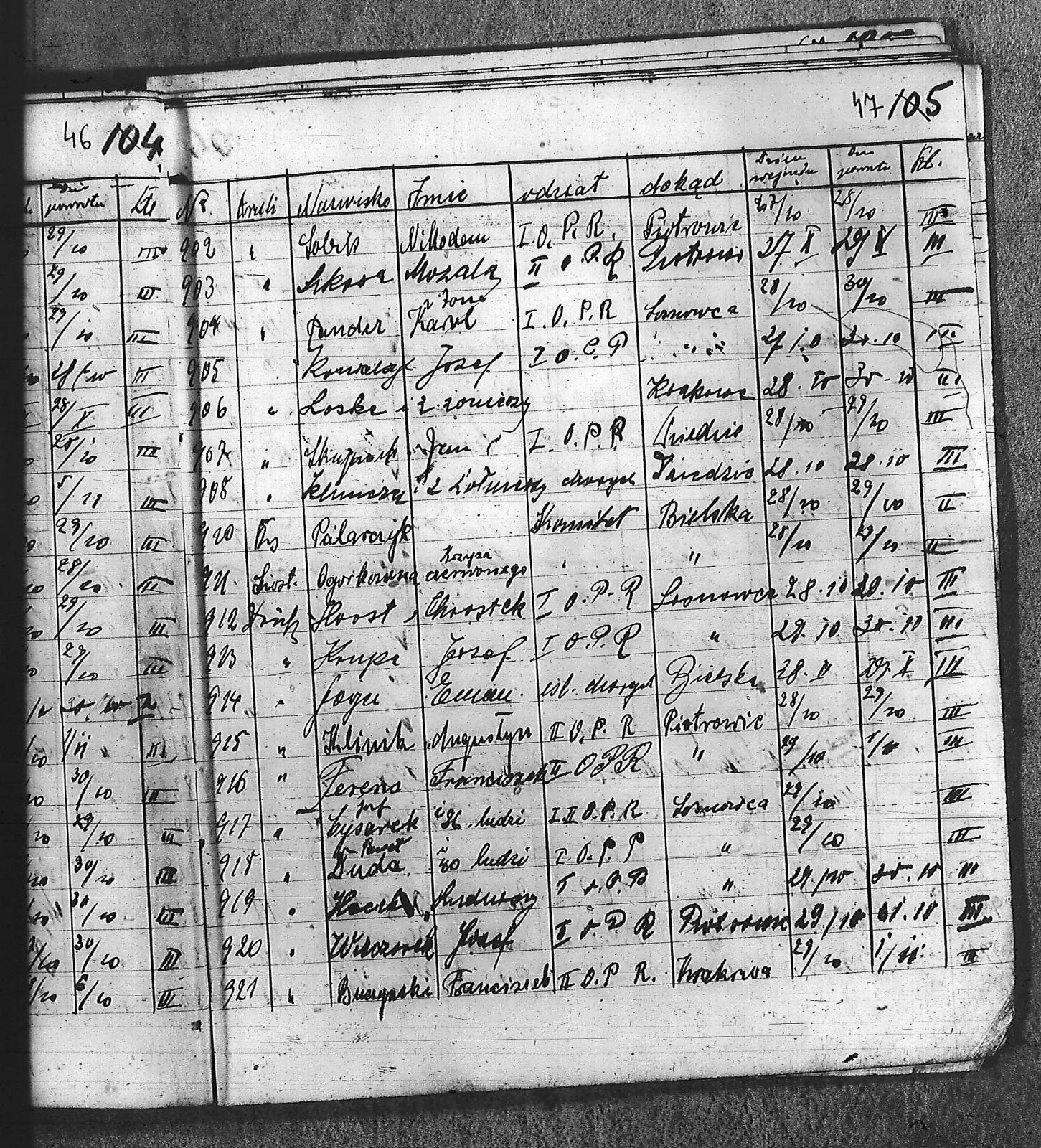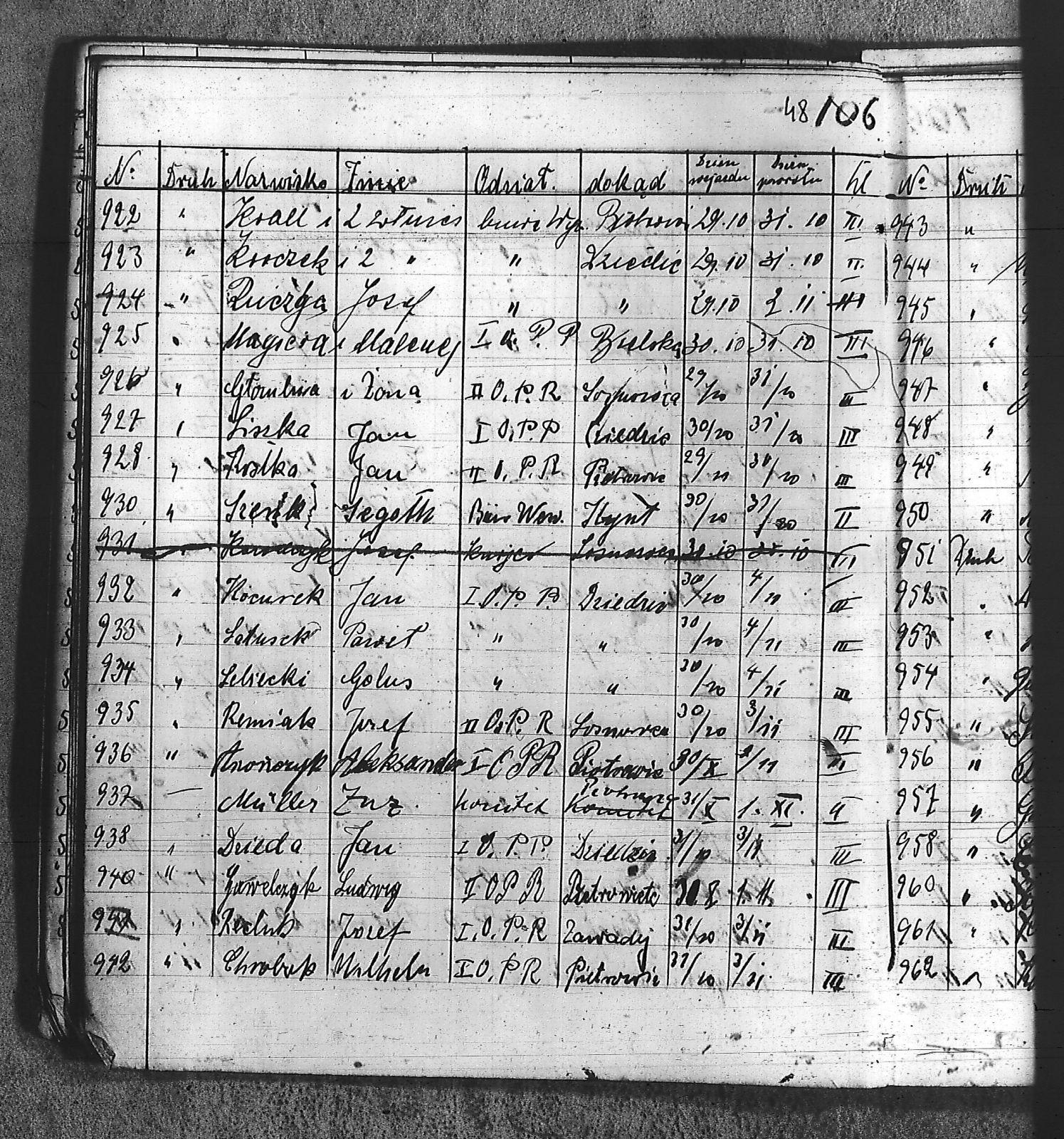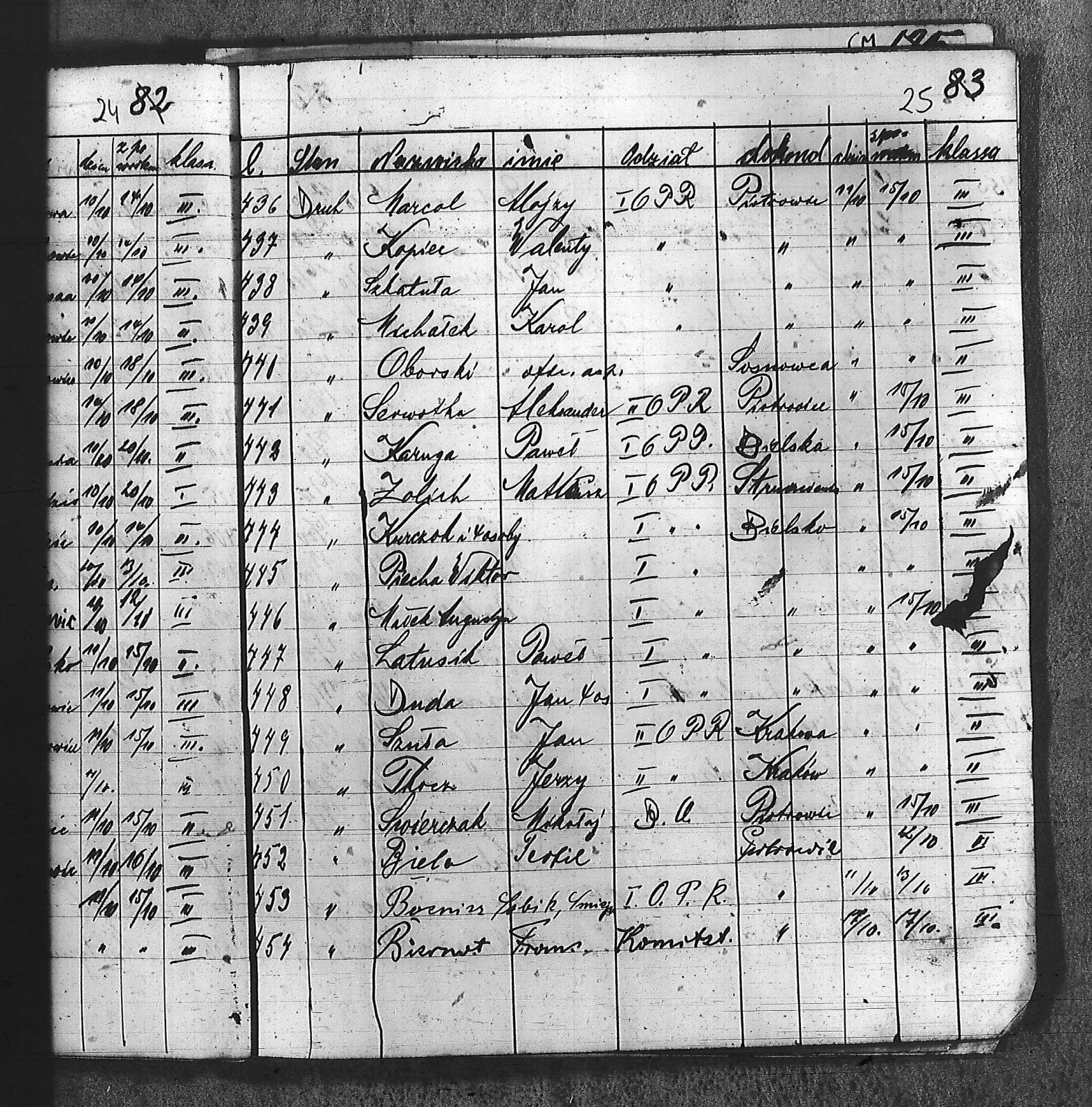 [nieczytelne], Andrzej; [nieczytelne], Józef; [nieczytelne], Ludwik; [nieczytelne], Martha; [nieczytelne], Stefan; [nieczytelnie], Alojzy; Adamczyk, Robert; Adamczyk, Zygfryd; Adamek, Klemens; Adamicki, Ludwig; Anas; Anas, Karol; Anderski, Karol; Andrzejewski; Anończyk, Aleksander; Antonczyk, Aleksander; Aturtowski; Babisek; Babisz; Babisz, Eugeniusz; Balcar; Balcar, Augustyn; Balcar, Józef; Balus, Jan; Bałecki, Józef; Banaś, Karol; Banerek; Banicki; Banisz, Jan; Banko, Józef; Baran; Barnabas, Franc.; Barnabas, Franciszek; Baron; Baron, Konrad; Basista; Basista, Jan; Basista, Maks; Basista, Paweł; Baszton, Józef; Batels; Bauerek; Bąk; Bąk, Emanuel; Belka, Wilem; Benedikt; Białecki, Józef; Biandes; Biela, Grzogorz; Biela, Teofil; Bielaczek; Bielaczek, Augustyn; Bielankówna, ; Bielas; Bienia; Bienia, Ignacy; Biermot, Franciszek; Biernat, Franc.; Biernot, Franc.; Binoszek, Mateusz; Birda, Theodor; Blacha; Blacha, Emanuel; Blałecki; Bluszcz; Bluszcz, Karol; Boak, Edmund; Bochynek, Alojzy; Bochynek, Walenty; Boczoń, Jan; Bodzinski, Adam; Bogalski, Edward; Bok, Paweł; Bokraba, Józef; Bołdys; Bołdys, Teodor; Borak, Karol; Borkowski; Borkowski, Edward; Bornisz; Bozowski; Brachamski; Brachmański; Brandes, Ludwik; Brandys; Brandys, Franciszek; Brandys, Ludwik; Brayer, Edward; Bromboszcz; Bromboszcz, Wincenty; Brzoza; Brzoza, Franc.; Brzoza, Franciszek; Brzoza, Jan; Brzozowski, Michał; Bśm, Rudolf; Buba, Jan; Buchalik; Buchta, Jakub; Buczeński; Buczeński, Franciszek; Buczęski, Rudolf; Buczkowny, Tomasz; Buczyński; Buczyński, Franciszek; Budzalik, Franciszek; Bugla, Jan; Bugla, Konstantyn; Bukaczek, Ludwik; Buła; Buła, Jan; Buła, Janusz; Buterek, Jan; Bytomski, Paweł; Canibol, Jan; Caniboł, Jan; Chłódek, Józef; Choławski, Tadeusz; Chrobok; Chrobok, Rudolf; Chrobok, Wilhelm; Chrocz, Józef; Chrocz, Wilem; Chrostek; Chrostka, Józef; Chroszcz, Wilhelm; Chroszcz, Wilhlem; Chroztek, Józef; Chwalczyk, Jan; Chybiński; Ciciński, Marian; Cienciała, Franc.; Cieńciała, Franciszek; Cieślik; Cieślik, Józef; Cofałka, Karol; Comiboł; Copalla, Franciszek; Cygan; Cysarek; Cysarek, Józef; Czaja, Wiktor; Czajka, Robert; Czaplewski; Czaplewski, Jan; Czarnecki, Wincenty; Czarnota, Piotr; Czarnynoga, Paweł; Czech; Czech, Emil; Czech, Józef; Czynecki, Walenty; Czysz, Franciszek; Czyż, Franciszek; Danek, Antoni; Daniecki; Danocki, Stanisław; De MehleN; Depta; Depta, Wincenty; Dębiński; Dilecki, Lucjan; Dinda, Stanisław; Dłubis, Franc.; Dłubis, Franciszek; Dobrzeński, Roman; Drodz, Ignacy; Drosdz, Ignacy; Drozda, Ignacy; Dróżdż; Drzewicki, Antoni; Drzyzga; Dubisz, Bolesław; Dubisz, Robert; Duda, Franciszek; Duda, Jan; Duda, Paweł; Dudek; Duka, Jan; Dymek; Dziczonowski; Dzider, Jan; Dzieda, Jan; Dziewok; Dzieżotrywski, Stanisław; Dzirkowski; Dziurosz, Antoni; Dziżka; Faber, Józef; Felman, Stefan; Ferenc; Ferenc, Franciszek; Filipek, Marian; Firot, Józef; Firut, Józef; Firuth, Józef; Fizia; Fizia, Aleksy; Fizia, Paweł; Foja, Emanuel; Fojcik; Fonin; Fridryk, Wincenty; Friedrich, Jan; Friedrych, ; Frohlich, Alojzy; Frotorz, Bronisław; Frydrych, Ignacy; Fuchng, Albin; Fulkowa, Zuzana; Fułyk; Furmanek, Michał; Furut, Józef; Gabor, Alojzy; Gaidar, Emil; Gaidas; Gajowy; Gajowy, Piotr; Gakan, Jan; Gałka, Jan; Gamich, Jan; Gamok, Jan; Ganel, Jan; Gangor, Ludwik; Garbas; Garbocz ; Garbocz, Fryderyk; Garbon, Alojzy; Garborz, Fryderyk; Garbosz, Franciszek; Garbosz, Fryderyk; Gasz, Adolf; Gauka, Henryk; Gaurok, Jan; Gawełczyk, Ludwik; Gawęda, Adolf; Gawęda, Paweł; Gawiek, Jan; Gawliczek, Jan; Gezrenta, Paweł; Glandan, Marian; Glenc; Glenc, Karol; Glenz, Karol; Gliwa, Józef; Głombina, ; Głombion, Franciszek; Głyk; Godek, Stanisław; Gojowy ; Gojowy, Teodor; Golędzinowski; Golug, Robert; Golus ; Golus, Ludwik; Gołembicki, Adam; Gomich ; Gorgal, Emil; Gorzawski; Gorzawski, August; Góralczyk; Góralczyk, Florian; Góralczyk, Franciszek; Górski; Górski, Janusz; Graborz, Jan; Graicarek, Adolf; Grajcarek, Adolf; Grajner, Emil; Grajnert; Gralak, Ludwik; Gralczyk, Florian; Gredmik; Grimm, Józef; Grobelny; Grobelny, Alojzy; Grobicki, Wacław; Grodnicki, Wacław; Grodon, Karol; Grumann; Gryblas, Czesław; Grychtoł, Herman; Grycmans, Marcinus; Grydlolik, Wincenty; Grym, Józef; Gryń, Józef; Grzesiok; Grzyb, Ludwik; Gul, Konrad; Gut, Karol; Gwóźdź; Hachuła; Hallerowa; Hallerowna; Hallerówna; Hałdys, Józef; Haman; Hamercok, Józef; Hanacz, Wilem; Hanak, Igancy; Hanurka, Franciszek; Haśnik, Leopold; Heblik; Heblik, Augustyn; Helmann, Jan; Hercog; Hercog, Andrzej; Hercog, Jan; Herman; Herman, Alojzy; Herman, Henryk; Herman, Ignacy; Hermann, Henryk; Herok, Antoni; Hilla, Walenty; Hocek, Ludwik; Hollek; Hoła; Hoła, Alojzy; Hoła, Franciszek; Horst; Hosde, Jan; Hotowko, Tadeusz; Howanies; Hranek; Hrazin, Jan; Hrobok, Józef; Hroscha, Wilim; Ikra, Maksymilian; Iksal, Maksymilian; Imielnicki; Iwanicki; Iwanicki, Franciszk; Jabor; Jabor, Alojzy; Jakubowski, Antoni; Jakubowski, Jędrzej; Jakubowski, Stefan; Janczyk, Hektor; Janeta, Franciszek; Jankrzyk; Janota, Franciszek; Jansz, Wiktor; Jarczyk, Franciszek; Jarczyński, Stefan; Jarczys, Franciszek; Jarkulski, Karol; Jaromin; Jaromin, Oton; Jarząbek; Jarząbek, Alojzy; Jarzombek, Alojzy; Jarzumtycki; Jarzyna; Jasik, Jan; Jasinta; Jasista, Alojzy; Jaworski, Wacław; Jaworski, Wiktor; Jendrzejczyk, Antoni; Jenszmyk; Jerkulski; Jerzembek; Joreminek, Piotr; Jorgen, Mateusz; Jukosz, Władysław; Julek, Augustyn; Juraszczyk, Jerzy; Jureczko, Karol; Jureczko, Wilem; Jureczko, Wilem, Marian; Jurkukowski; Jurzima; Kaczmarczyk; Kaczmarek, Stanisław; Kaczor, Wiktor; Kagioński, Stefan; Kaina, Alfred; Kaintroh; Kalemba, Henryk; Kalinowski; Kalinowski, Jan; Kama, Alfred; Kama, Alojzy; Kampik, Konstanty; Kamyk; Kanc, Alojzy; Kania, Alojzy; Kanicki, Karol; Kaniecki, Karol; Kanik; Kanniszala; Kapias; Kapias, Franc.; Kapias, Franciszek; Kapras; Kapuścicki, Józef; Karasel; Karasicki; Karciniarczyk, Józef; Karemarczyk, 