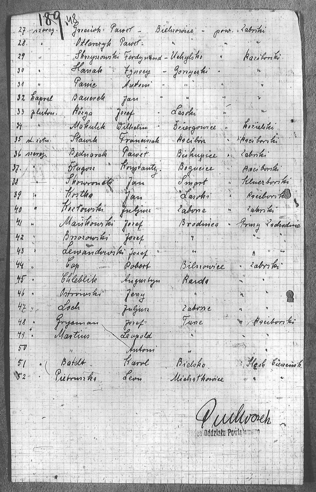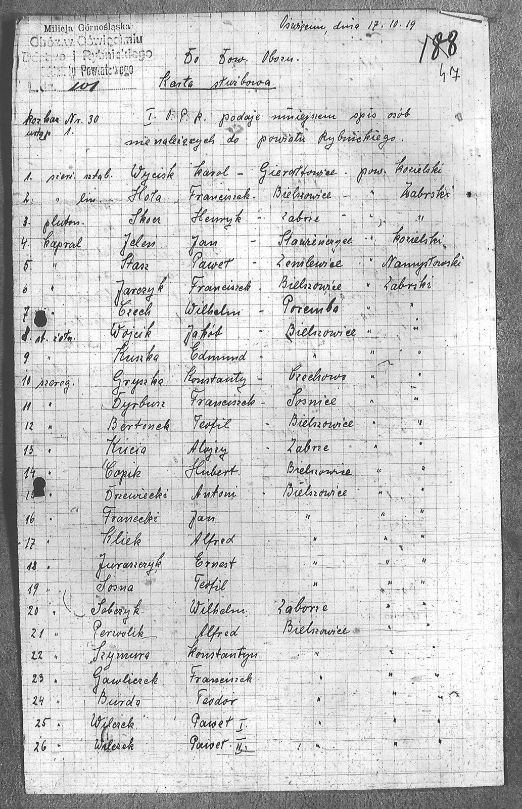 Banerek, Jan; Bartonek, Teofil; Bednarek, Paweł; Betelt, Karol; Brzozowski, Józef; Burda, Teodor; Cap, Robert; Chleblik, Augustyn; Copik, Hubert; Czech, Wilhelm; Długosz, Konstanty; Drzewiecki, Antoni; Dyrbusz, Franciszek; Franecki, Jan; Gawliczek, Franciszek; Grycman, Józef; Gryszka, Konstanty; Grzesiok, Paweł; Hanak, Ignacy; Hoła, Franciszek; Jarczyk, Franciszek; Jeleń, Jan; Juraszczyk, Ernest; Klick, Alfred; Kostka, Jan; Kozłowski, Juliusz; Kucia, Alojzy; Kuszka, Edmund; Lewandowski, Józef; Loch, Juliusz; Makulik, Wilhelm; Mańkowski, Józef; Martinus, Antoni; Martinus, Leopold; Ostrowski, Jerzy; Otlarczyk, Paweł; Panic, Antoni; Perwolik, Alfred; Pietruszka, Leon; Rózga, Józef; Skocz, Henryk; Skowronek, Jan; Skrzyszowski, Ferdynand; Sławik, Franciszek; Sobczyk, Wilhelm; Sosna, Teofil; Stasz, Paweł; Szymura, Konstantyn; Wilczek, Paweł I; Wilczek, Paweł II; Wójcik, Jakub; Wycisk, Karol; |