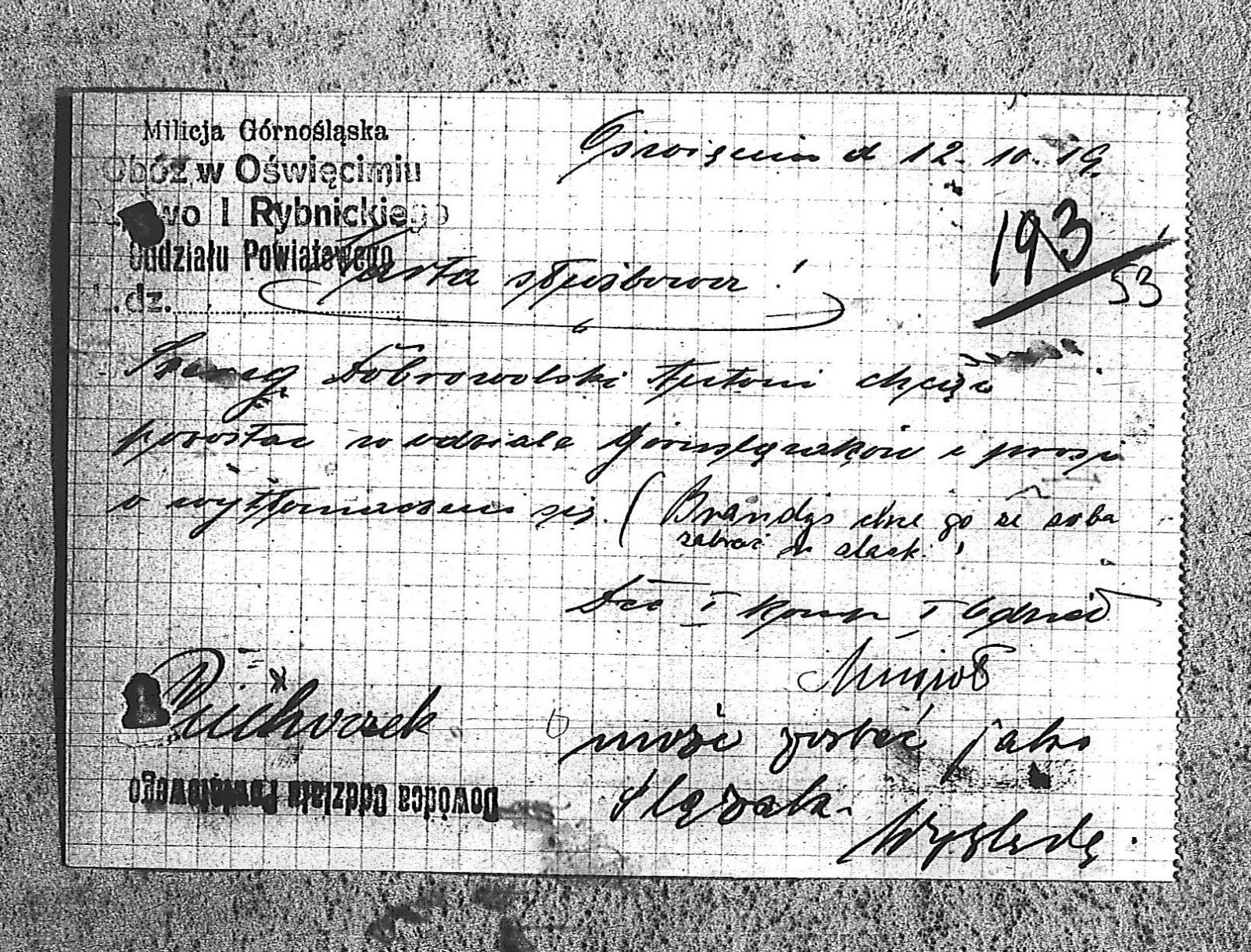 | Instytucje | Dowództwo I Rybnickiego Oddziału Powiatowego; Milicja Górnośląska; Milicja Górnośląska. Obóz w Oświęcimiu |