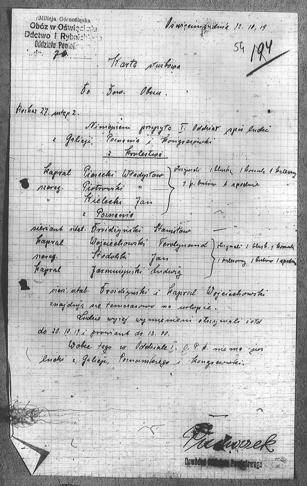 | Tytuł | Karta służbowa do dowództwa obozu |