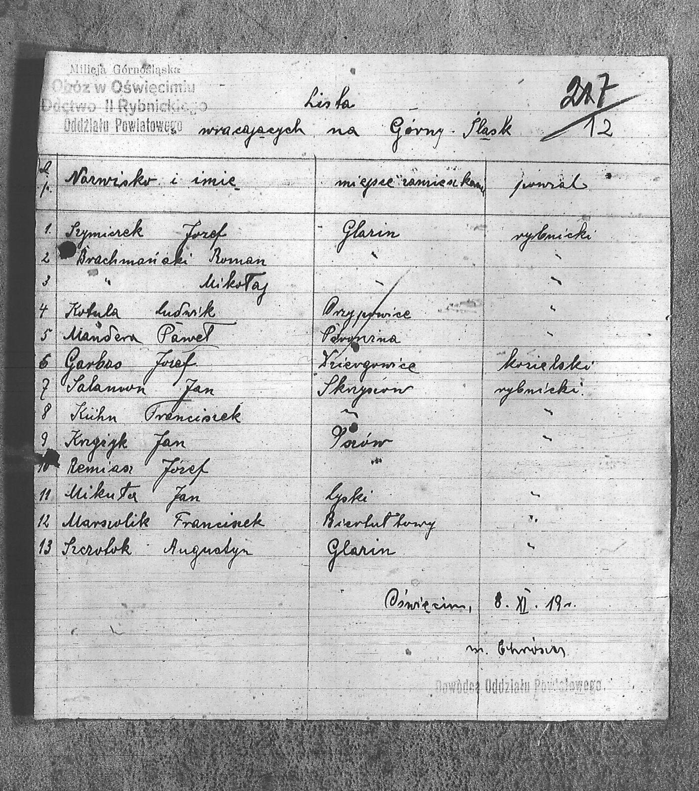 | Instytucje | Dowództwo II Rybnickiego Oddziału Powiatowego; Milicja Górnośląska; Milicja Górnośląska. Obóz w Oświęcimiu |
