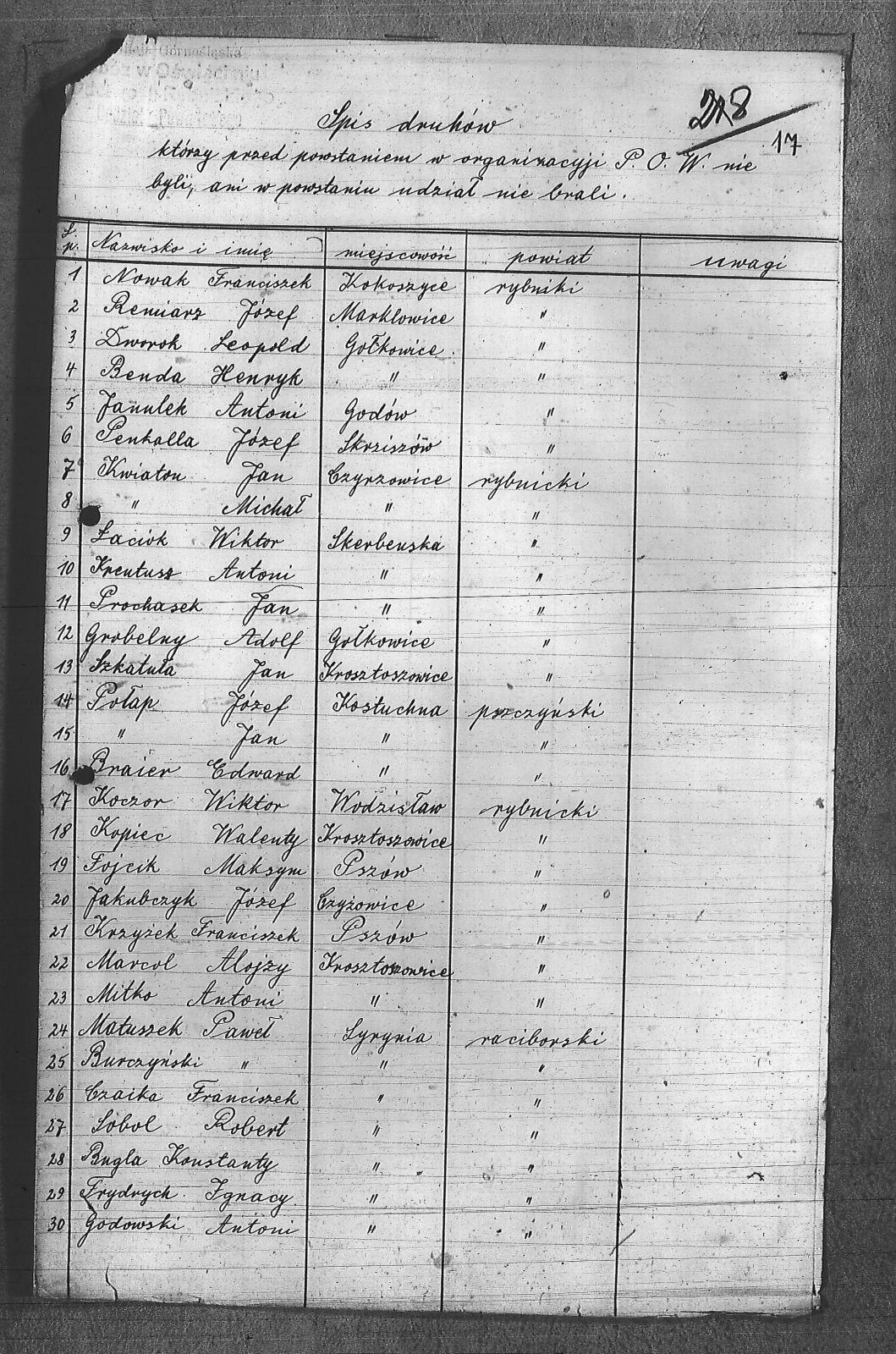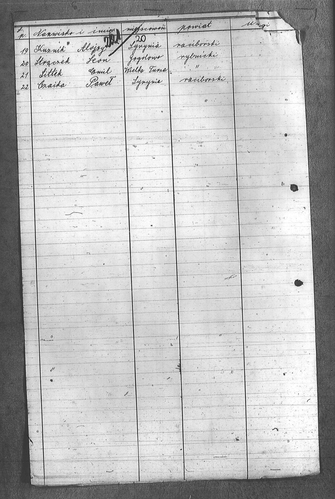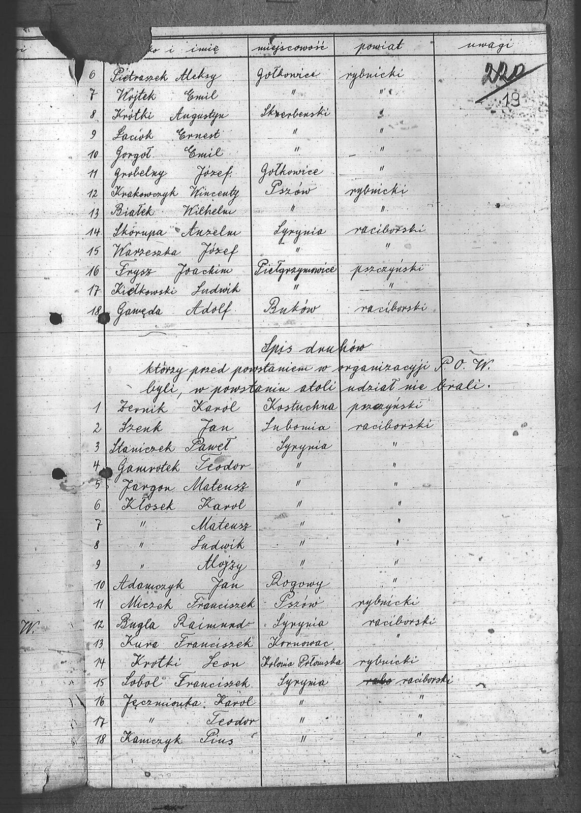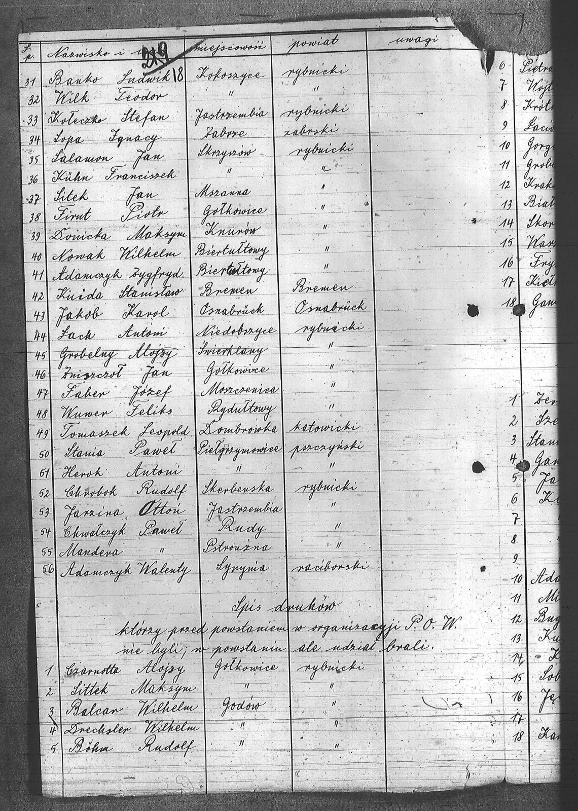 Adamczyk, Jan; Adamczyk, Walenty; Adamczyk, Zygfryd; Balcar, Wilhelm; Banko, Ludwik; Benda, Henryk; Białek, Wilhelm; Böhm, Rudolf; Braier, Edward; Bugla, Konstanty; Bugla, Raimund; Burczyński, Paweł; Chrobok, Rudolf; Chwałczyk, Paweł; Czaika, Paweł; Czajka, Franciszek; Czarnotta, Alojzy; Donicka, Maksymilian; Drechsler, Wilhelm; Dworok, Leopold; Faber, Józef; Firut, Piotr; Fojcik, Maksym; Frydrych, Ignacy; Frysz, Joachim; Gamrotek, Teodor; Gawęda, Adolf; Godowski, Antoni; Gorgoł, Emil; Grobelny, Adolf; Grobelny, Alojzy; Grobelny, Józef; Herok, Antoni; Jakub, Karol; Jakubczyk, Józef; Janulek, Antoni; Jargon, Mateusz; Jarzina, Otton; Jęczmionka, Karol; Jęczmionka, Teodor; Kamczyk, Pius; Kiełkowski, Ludwik; Kłosek, Alojzy; Kłosek, Karol; Kłosek, Ludwik; Kłosek, Mateusz; Koczor, Wiktor; Kołeczko, Stefan; Kopiec, Walenty; Krakowczyk, Wincenty; Krentusz, Antoni; Krotki, Leon; Krótki, Augustyn; Krzyżek, Franciszek; Kühn, Franciszek; Kuida, Stanisław; Kura, Franciszek; Kuznik, Alojzy; Kwiatoń, Jan; Kwiatoń, Michał; Łach, Antoni; Łaciok, Ernest; Łaciok, Wiktor; Łopa, Ignacy; Mandera, Paweł; Marcol, Alojzy; Matuszek, Paweł; Miczek, Franciszek; Mitko, Antoni; Nowak, Franciszek; Nowak, Wilhlem; Penkalla, Józef; Pietraszek, Aleksy; Połap, Jan; Połap, Józef; Prochasek, Jan; Remiasz, Józef; Salamon, Jan; Sitek, Jan; Sittek, Emil; Sittek, Maksymilian; Skorupa, Anzelm; Sobol, Franciszek; Sobol, Robert; Stania, Paweł; Staniczek, Paweł; Strączek, Leon; Szenk, Jan; Szkatuła, Jan; Tomaszek, Leopold; Warzeszka, Józef; Wilk, Teodor; Wojtek, Emil; Wuwer, Feliks; Zernik, Karol; Zniszczoł, Jan; |