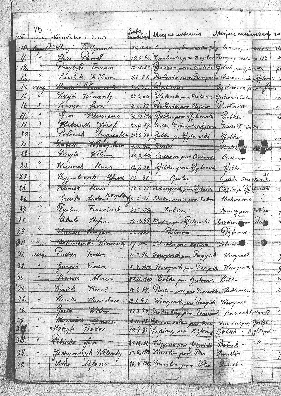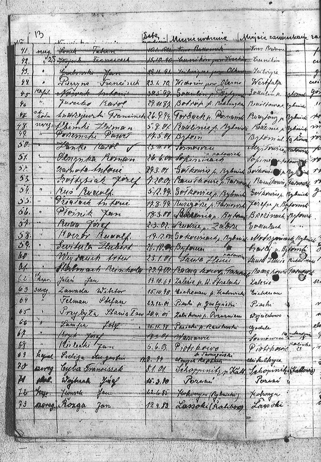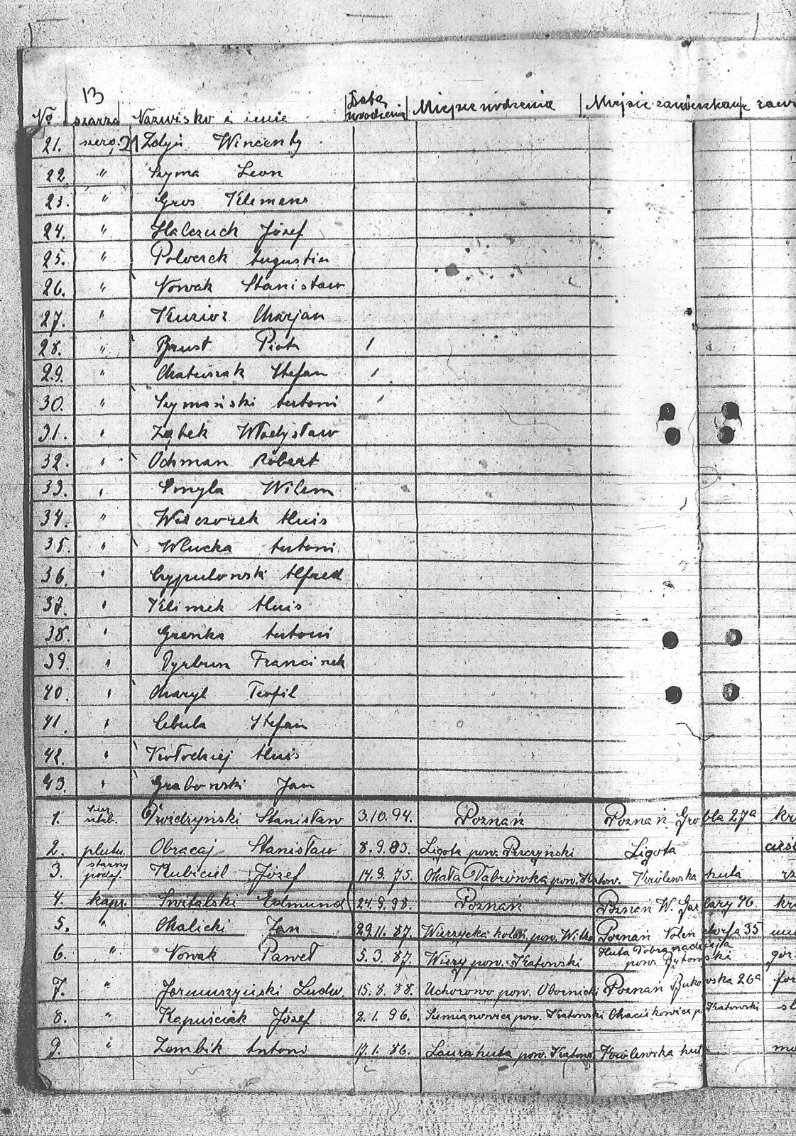 Abimki, Herman; Andrzejewski, Franciszek; Banach, Marek; Bąbczyński, Wacław; Bielhzowic, Wincenty; Biernacki, Eugeniusz; Błaszczak, Józef; Brust, Piotr; Cebula, Stefan; Cichulowski, Józef; Cyba, Franciszek; Czarnota, Antoni; Czypulowski, Alfred; Deja, Konstanty; Drożdżyński, Stanisław; Dróżdżyński, Stanisław; Dyrbusz, Franciszek; Felman, Stefan; Gesior, Stanisław; Gołąbek, Wiktor; Grabianowski, Bolesław; Grabowski, Jan; Grek, Maksymilian; Grenka, Antoni; Greszka, Konstanty; Gros, Klemens; Grześkowiak, Antoni; Gurgoń, Teodor; Halczuch, Józef; Halczyk, Józef; Hiszpański, Jan; Jabłoński, Stanisław; Jachymczyk, Walenty; Jagiełka, Franciszek; Jakubowski, Andrzej; Jakubowski, Józef; Jambor, Bronisław; Jambor, Stanisław; Jarmuczyński, Ludwik; Jarmuszyński, Ludwik; Jeleń, Jan; Jędrzejczak, Franciszek; Jureczko, Karol; Kalek, Wiktor; Kapusta, Kazimierz; Kapuściak, Józef; Kiślecki, Jan; Klimek, Alois; Klimek, Alojzy; Kmieæ, Walenty; Kmieć, Walenty; Koczór, Rudolf; Koła, Władysław; Kołodziej, Alois; Kołodziej, Alojzy; Kospzyk, Józef; Krakowiecki, Józef; Królikowski, Bernard; Krząstek, Antoni; Kubiciel, Józef; Kuś, Rudolf; Kuzior, Marjan; Libek, Wacław; Łakomy, Marcin; Ławiński, Sylwester; Malendziak, Edmund; Malicki, Jan; Maryl, Teofil; Matuszak, Stefan; Matuszek, Stefan; Mielczarski, Antoni; Miniszewski, Józef; Mosznk, Teodor; Niedbał, Marian; Nowak, Franciszek; Nowak, Paweł; Nowak, Stanisław; Obracaj, Stanisław; Ochman, Robert; Ociepa, Jan; Ogoza, Stefan; Perduch, Józef; Pflamn, Antoni; Piątrzyński, Adam; Pierzyna, Franciszek; Pietrzyk, Ferdynand; Pleśnik, Jan; Polewski, Stanisław; Poloczek, Augustin; Poloczek, Augustyn; Potempski, Stanisław; Potępski, Stanisław; Przybyla, Tomasz; Przybyła, Stanisław; Przybyła, Tomasz; Przygoda, Józef; Psiuk, Władysław; Pucher, Teodor; Rataj, Józef; Rozga, Jan; Rybak, Stanisław; Sitko, Alfons; Siwek, Władysław; Skrocki, Dominik; Skrodzki, Dominik; Słomka, Stanisław; Smoszek, Bolesław; Smyla, Wilem; Smyla, Wilhelm; Sosnoski, Feliks; Sosnowski, Feliks; Stachowiak, Franciszek; Stasz, Paweł; Strays, Ferdynand; Strzatkowski, Stanisław; Strzyś, Ferdynand; Szablewski, Antoni; Szeslik, Augustyn; Szinlek, Wilem; Szinlik, Wilem; Szkaplewicz, Jakub; Szkaradek, Franciszek; Szołtysiak, Józef; Szulik, Wilem; Szymański, Antoni; Szyna, Leon; Szyszkowski, Jan; Świtalski, Edmund; Tolorek, Hugon; Tomala, Antoni; Tritt, Wojciech; Utrata, Julian; Wąpierski, Aleksander; Weszczyński, Józef; Wieczorek, Alois; Wlucha, Antoni; Wojtczak, Józef; Wycisk, Karol; Zarski, Jan; Zawada, Wiktor; Ząbek, Władyslaw; Ząbek, Władysław; Zbączyniak, Józef; Zdyń, Wincenty; Zembik, Antoni; Zieliński, Paweł; Ziemkowski, Walenty; Żemła, Kazimierz; |
