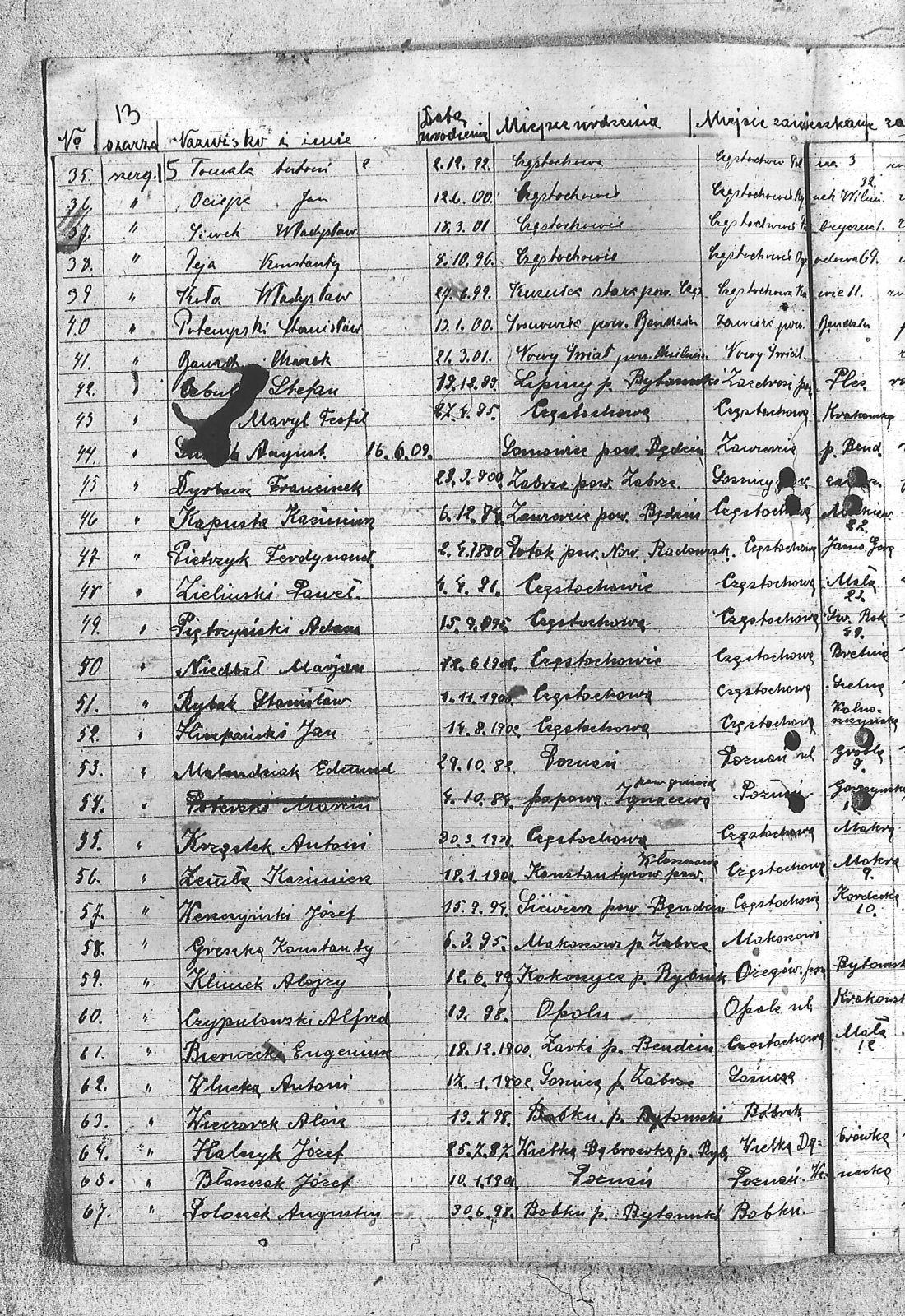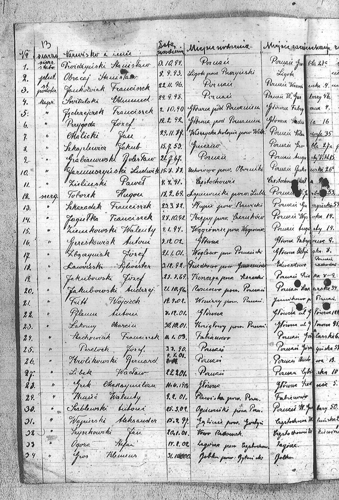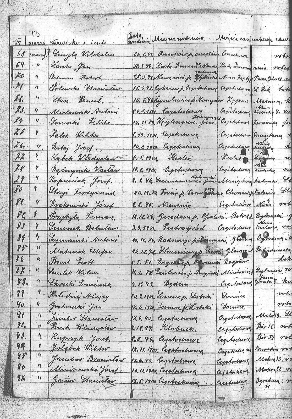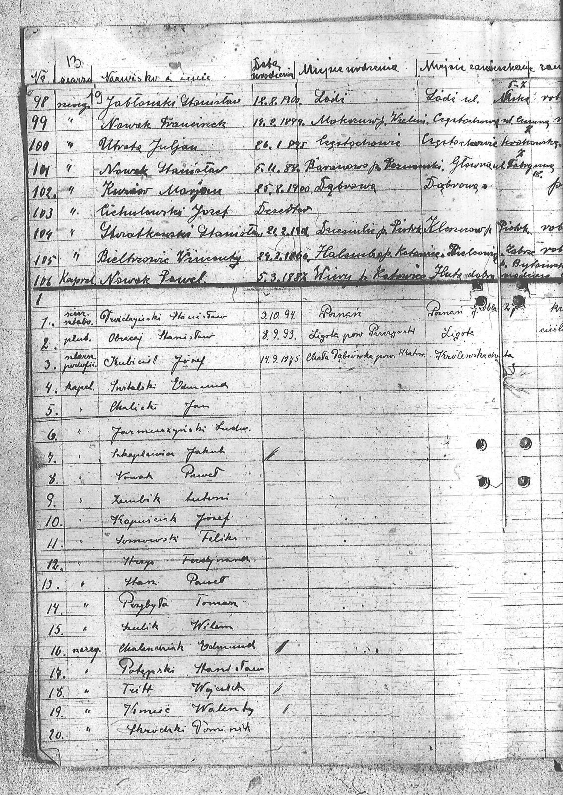 Abimki, Herman; Andrzejewski, Franciszek; Banach, Marek; Bąbczyński, Wacław; Bielhzowic, Wincenty; Biernacki, Eugeniusz; Błaszczak, Józef; Brust, Piotr; Cebula, Stefan; Cichulowski, Józef; Cyba, Franciszek; Czarnota, Antoni; Czypulowski, Alfred; Deja, Konstanty; Drożdżyński, Stanisław; Dróżdżyński, Stanisław; Dyrbusz, Franciszek; Felman, Stefan; Gesior, Stanisław; Gołąbek, Wiktor; Grabianowski, Bolesław; Grabowski, Jan; Grek, Maksymilian; Grenka, Antoni; Greszka, Konstanty; Gros, Klemens; Grześkowiak, Antoni; Gurgoń, Teodor; Halczuch, Józef; Halczyk, Józef; Hiszpański, Jan; Jabłoński, Stanisław; Jachymczyk, Walenty; Jagiełka, Franciszek; Jakubowski, Andrzej; Jakubowski, Józef; Jambor, Bronisław; Jambor, Stanisław; Jarmuczyński, Ludwik; Jarmuszyński, Ludwik; Jeleń, Jan; Jędrzejczak, Franciszek; Jureczko, Karol; Kalek, Wiktor; Kapusta, Kazimierz; Kapuściak, Józef; Kiślecki, Jan; Klimek, Alois; Klimek, Alojzy; Kmieæ, Walenty; Kmieć, Walenty; Koczór, Rudolf; Koła, Władysław; Kołodziej, Alois; Kołodziej, Alojzy; Kospzyk, Józef; Krakowiecki, Józef; Królikowski, Bernard; Krząstek, Antoni; Kubiciel, Józef; Kuś, Rudolf; Kuzior, Marjan; Libek, Wacław; Łakomy, Marcin; Ławiński, Sylwester; Malendziak, Edmund; Malicki, Jan; Maryl, Teofil; Matuszak, Stefan; Matuszek, Stefan; Mielczarski, Antoni; Miniszewski, Józef; Mosznk, Teodor; Niedbał, Marian; Nowak, Franciszek; Nowak, Paweł; Nowak, Stanisław; Obracaj, Stanisław; Ochman, Robert; Ociepa, Jan; Ogoza, Stefan; Perduch, Józef; Pflamn, Antoni; Piątrzyński, Adam; Pierzyna, Franciszek; Pietrzyk, Ferdynand; Pleśnik, Jan; Polewski, Stanisław; Poloczek, Augustin; Poloczek, Augustyn; Potempski, Stanisław; Potępski, Stanisław; Przybyla, Tomasz; Przybyła, Stanisław; Przybyła, Tomasz; Przygoda, Józef; Psiuk, Władysław; Pucher, Teodor; Rataj, Józef; Rozga, Jan; Rybak, Stanisław; Sitko, Alfons; Siwek, Władysław; Skrocki, Dominik; Skrodzki, Dominik; Słomka, Stanisław; Smoszek, Bolesław; Smyla, Wilem; Smyla, Wilhelm; Sosnoski, Feliks; Sosnowski, Feliks; Stachowiak, Franciszek; Stasz, Paweł; Strays, Ferdynand; Strzatkowski, Stanisław; Strzyś, Ferdynand; Szablewski, Antoni; Szeslik, Augustyn; Szinlek, Wilem; Szinlik, Wilem; Szkaplewicz, Jakub; Szkaradek, Franciszek; Szołtysiak, Józef; Szulik, Wilem; Szymański, Antoni; Szyna, Leon; Szyszkowski, Jan; Świtalski, Edmund; Tolorek, Hugon; Tomala, Antoni; Tritt, Wojciech; Utrata, Julian; Wąpierski, Aleksander; Weszczyński, Józef; Wieczorek, Alois; Wlucha, Antoni; Wojtczak, Józef; Wycisk, Karol; Zarski, Jan; Zawada, Wiktor; Ząbek, Władyslaw; Ząbek, Władysław; Zbączyniak, Józef; Zdyń, Wincenty; Zembik, Antoni; Zieliński, Paweł; Ziemkowski, Walenty; Żemła, Kazimierz; |