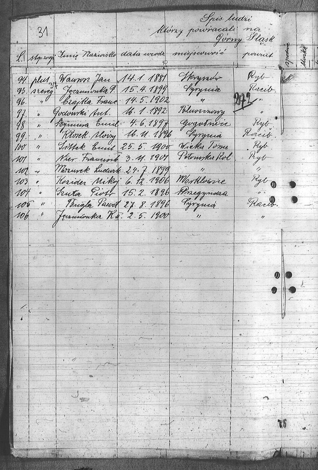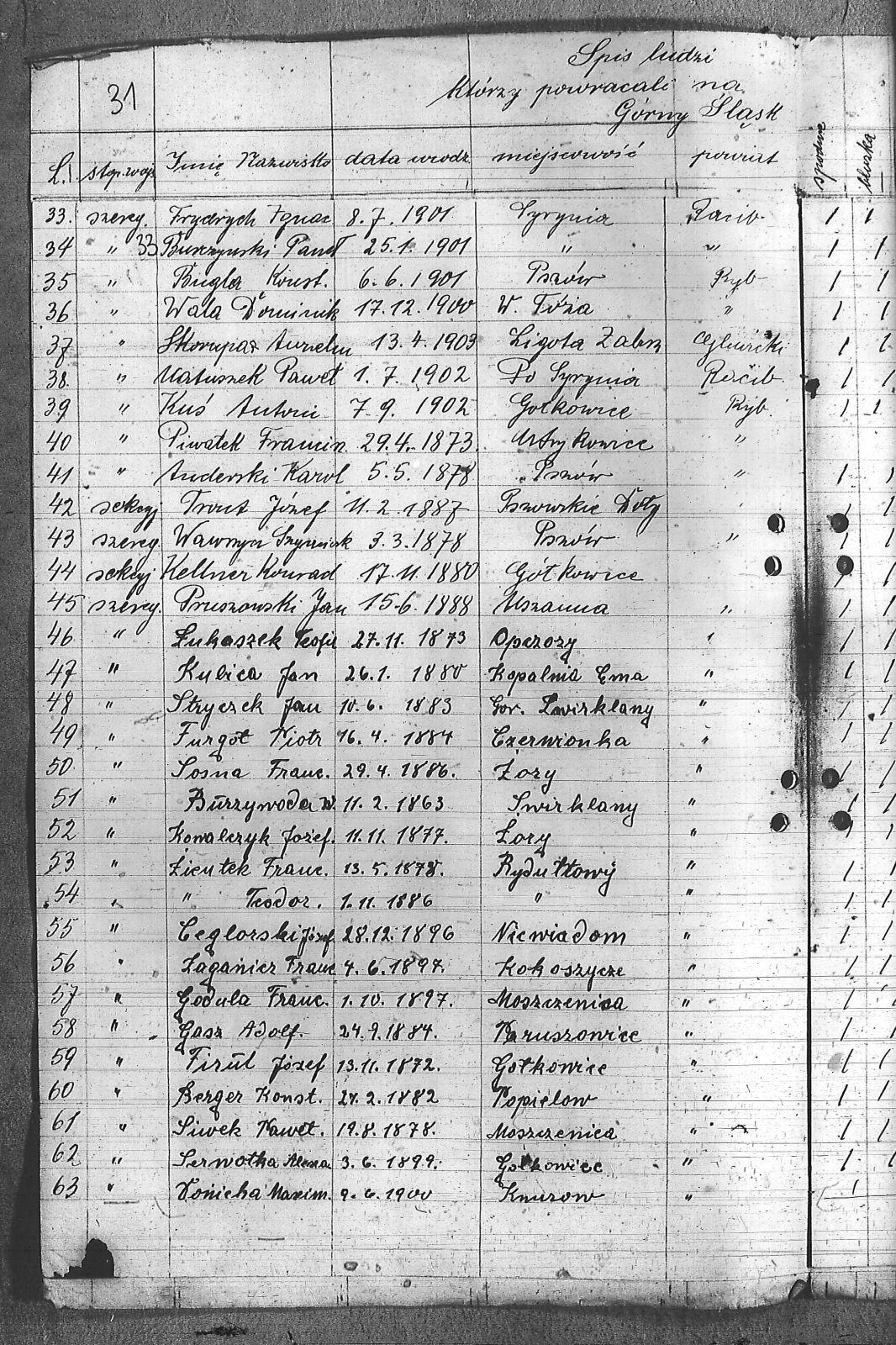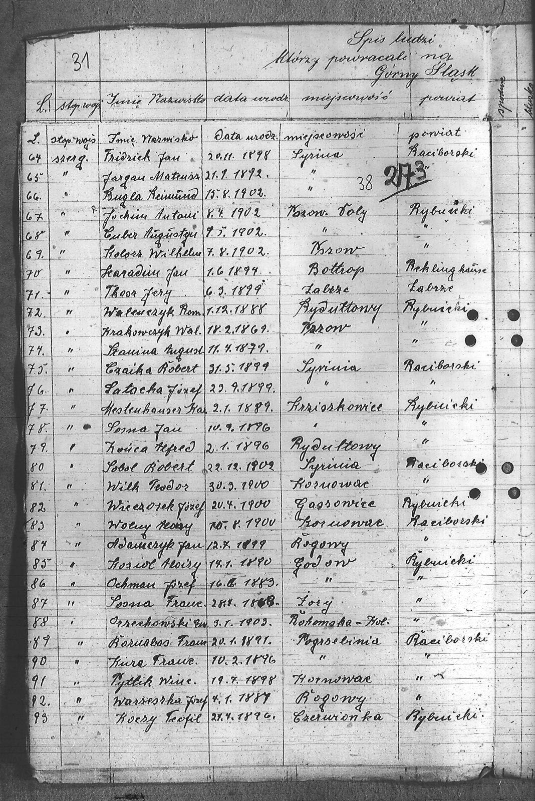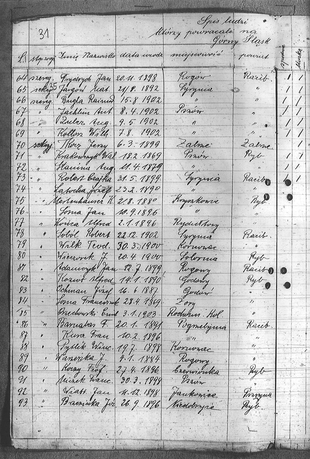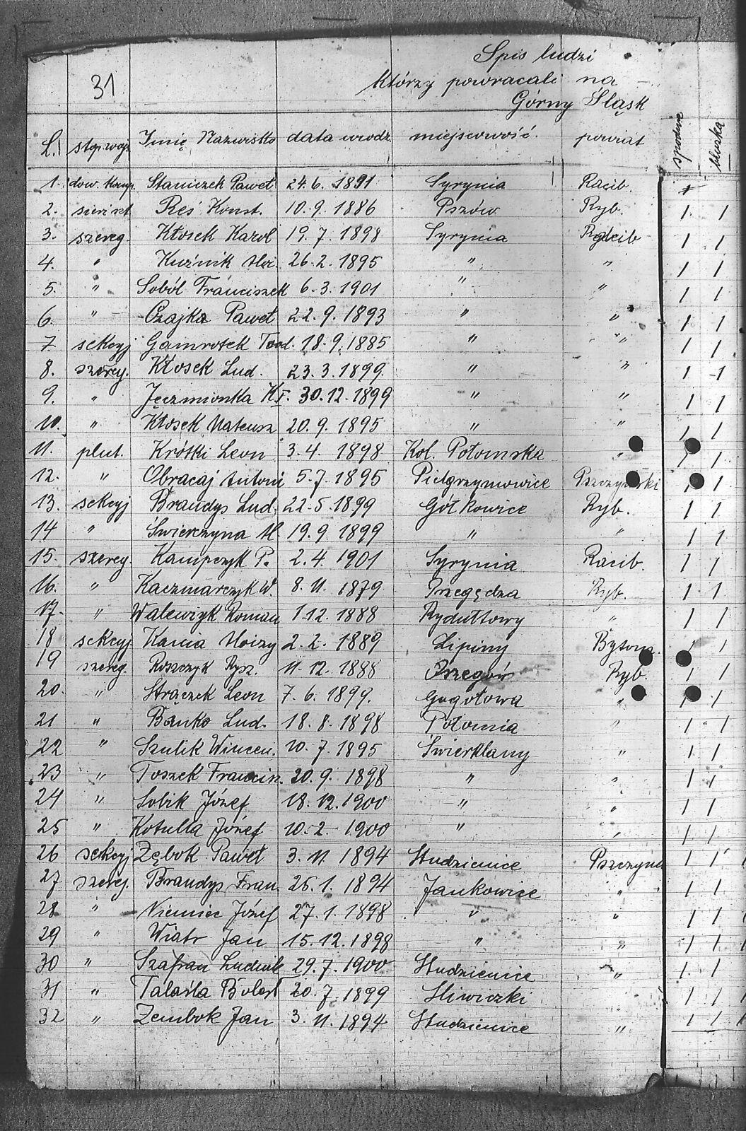 Adamczyk, Jan; Anderski, Karol; Banko, Ludwik; Barnabas, F.; Barnabas, Franc.; Berger, Konst.; Brandys, Franciszek; Brandys, Ludwik; Brzezinka, Józef; Bugla, Konst.; Bugla, Paweł; Bugla, Rajmund; Bugla, Reimund; Burczyński, Paweł; Burzywoda, W.; Ceglorski, Józef; Cuber, Augustyn; Czaika, Robert; Czajka, Franc.; Czajka, Paweł; Czajka, Robert; Donicka, Maksymilian; Firut, Józef; Friedrich, Jan; Frydrych, Ignacy; Frydrych, Jan; Furgoł, Piotr; Gamrotek, Teodor; Gasz, Adolf; Godowski, Antoni; Godula, Franc.; Haradzin, Jan; Jachlim, Ant.; Jargan, Mateusz; Jargoń, Mateusz; Jęczmionka, F.; Jęczmionka, K. I; Jęczmionka, K. II; Jochim, Antoni; Kaczmarczyk, W.; Kampczyk, P.; Kania, Alojzy; Kellner, Konrad; Kłosek, Aloisy; Kłosek, Karol; Kłosek, Lud.; Kłosek, Mateusz; Koczy, Teofil; Kolorz, Wilh.; Kolorz, Wilhelm; Końca, Alfred; Kotula, Józef; Kowalczyk, Józef; Kozider, Mikołaj; Kozioł, Alfred; Kozioł, Aloisy; Krakowczyk, Wal.; Krótki, Leon; Kubica, Jan; Kura, Fran.; Kura, Franc.; Kuś, Antoni; Kuźnik, Alois; Latocha, Józef; Łukaszek, Teofil; Matuszek, Paweł; Mazurek, Ludwik; Merlenhauser, K.; Mestenhauser, Kar.; Miczek, Franc.; Niemiec, Józef; Nier, Franciszek; Obracaj, Antoni; Ochman, Józef; Orzechowski, Em.; Orzechowski, Emil; Piwatek, Franciszek; Pruszowski, Jan; Pytlik, Winc.; Reś, Konst.; Roszczyk, Ryszard; Serwotka, Aleksander; Sittek, Emil; Siwek, Paweł; Skorupa, Anzelm; Sobik, Józef; Sobol, Robert; Soból, Franciszek; Soból, Robert; Sosna, Franc.; Sosna, Franciszek; Sosna, Jan; Staniczek, Paweł; Stanina, Aug.; Stanina, August.; Strączek, Leon; Stryczek, Jan; Szafran, Ludwik; Szulik, Wincenty; Szuła, Piotr; Szymiczek, Wawrzyn; Szymura, Emil; świerczyna, H.; Talaśla, Bolesław; Tkocz, Jerzy; Toszek, Franciszek; Tront, Józef; Wala, Dominik; Walenczyk, Rom.; Walenżyk, Roman; Warzeszka, J.; Warzeszka, Józef; Wawrosz, Jan; Wiatr, Jan; Wieczorek, J.; Wieczorek, Józef; Wilk, Teod.; Wilk, Teodor; Wolny, Aloisy; Zaganicz, Franc.; Zembok, Jan; Zębok, Paweł; Zientek, Franc.; Zientek, Teodor; Zuber, Aug.; |