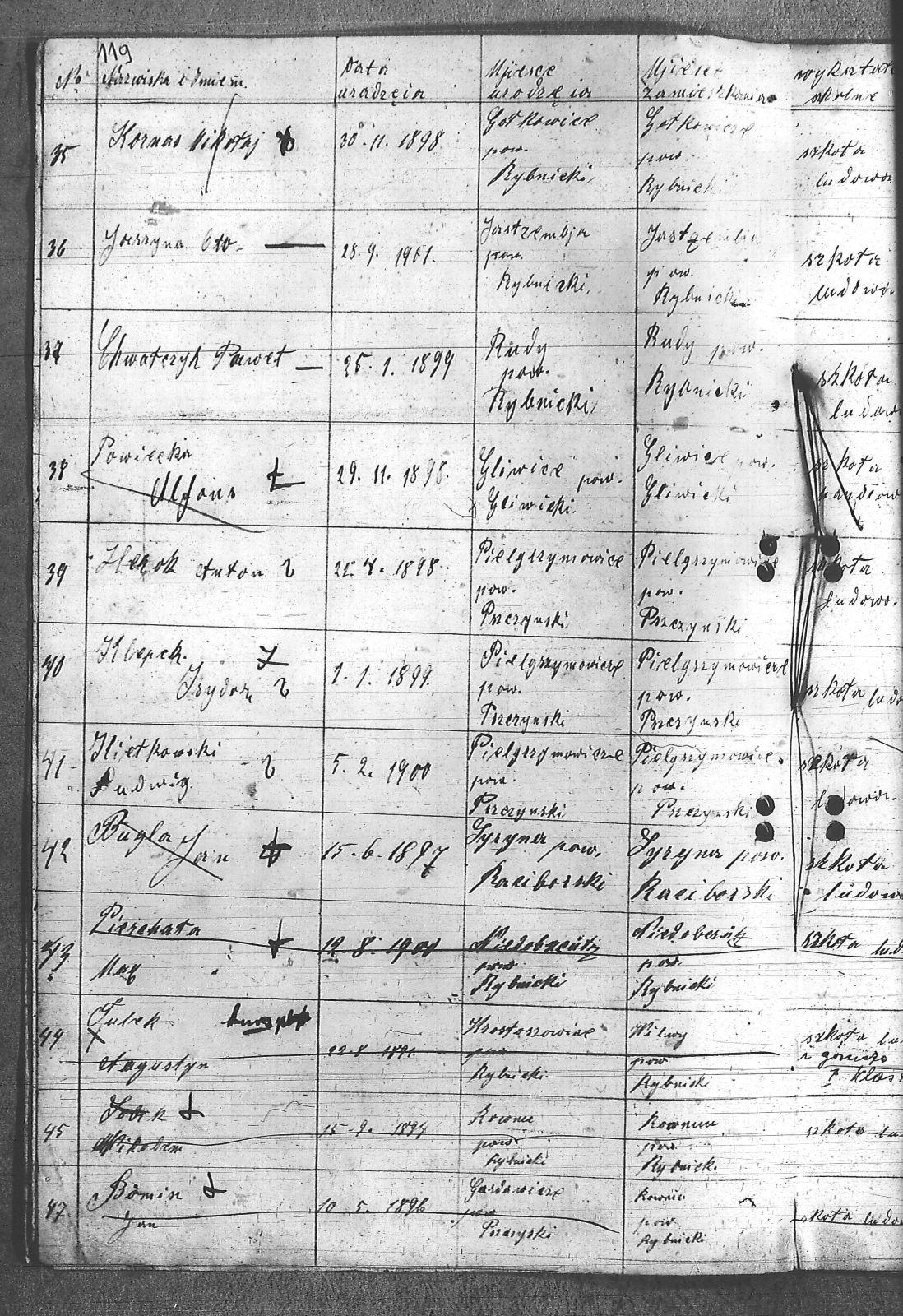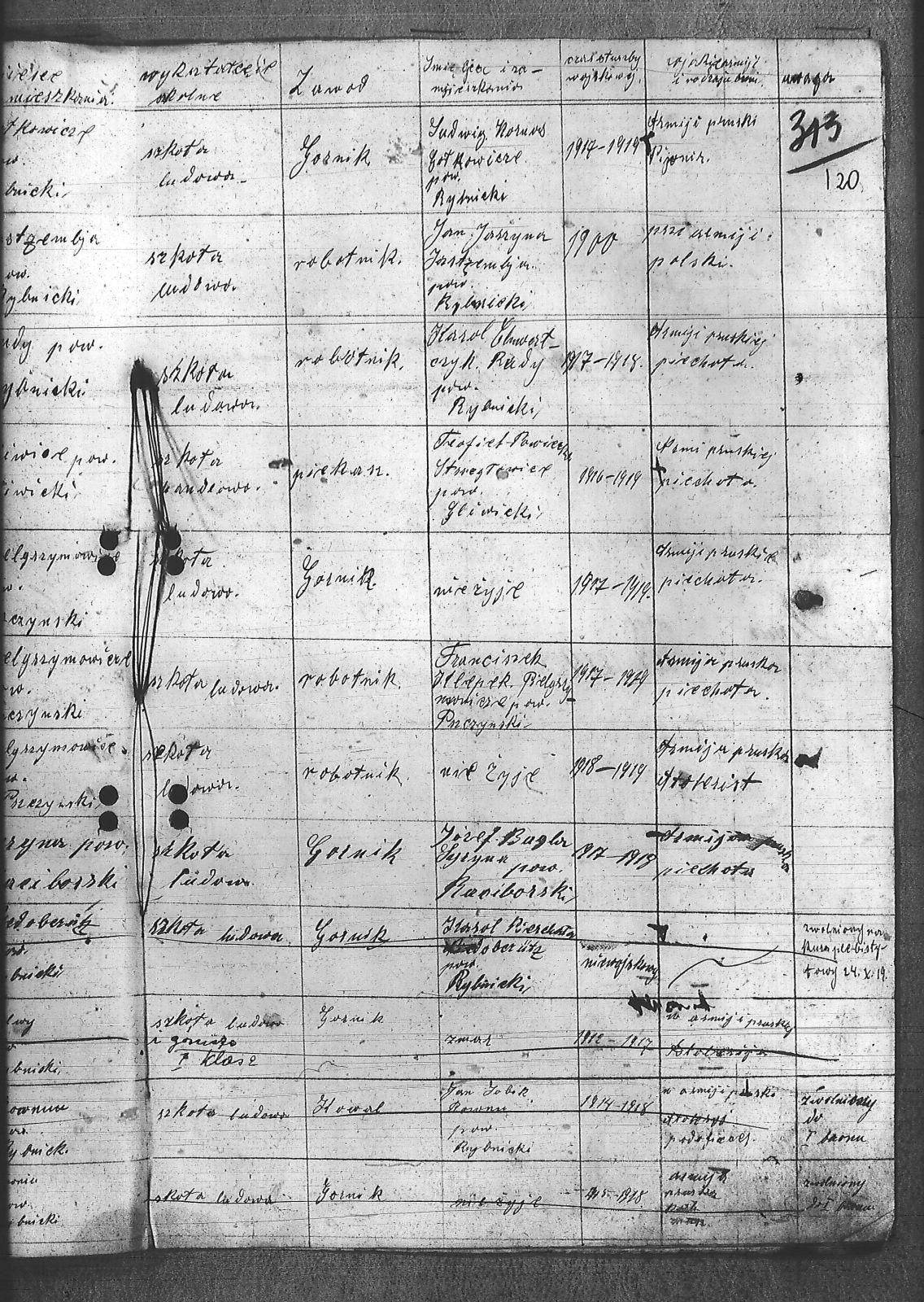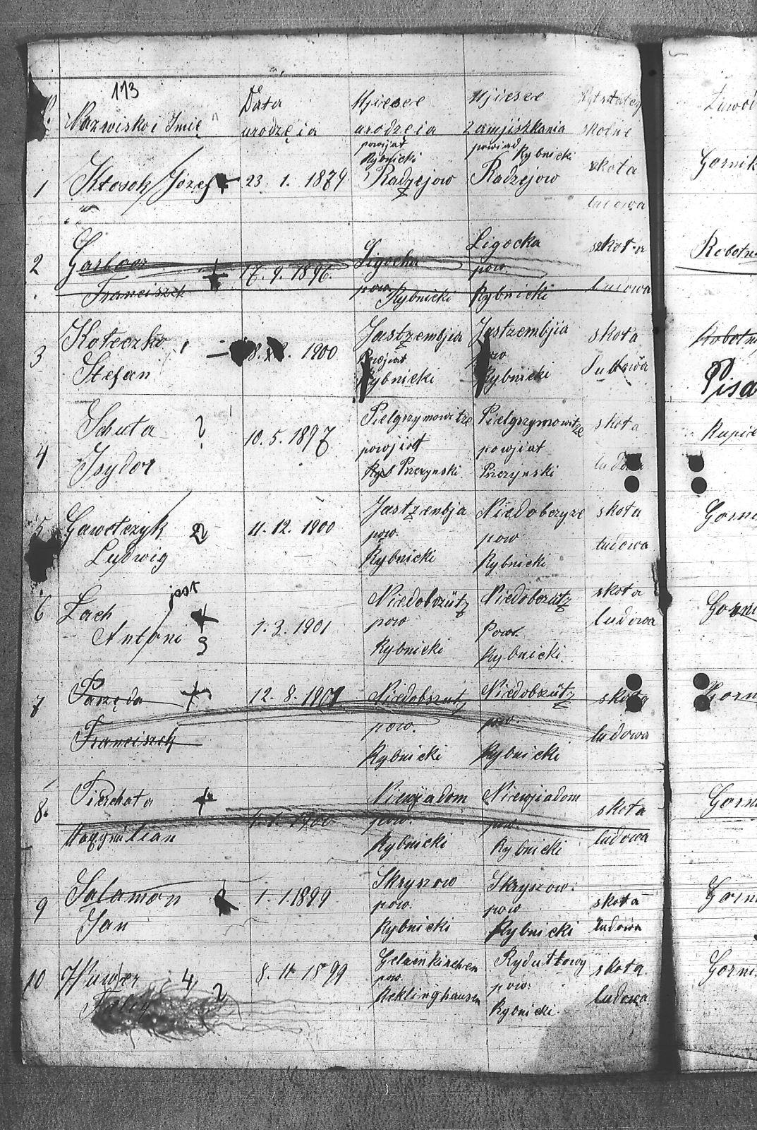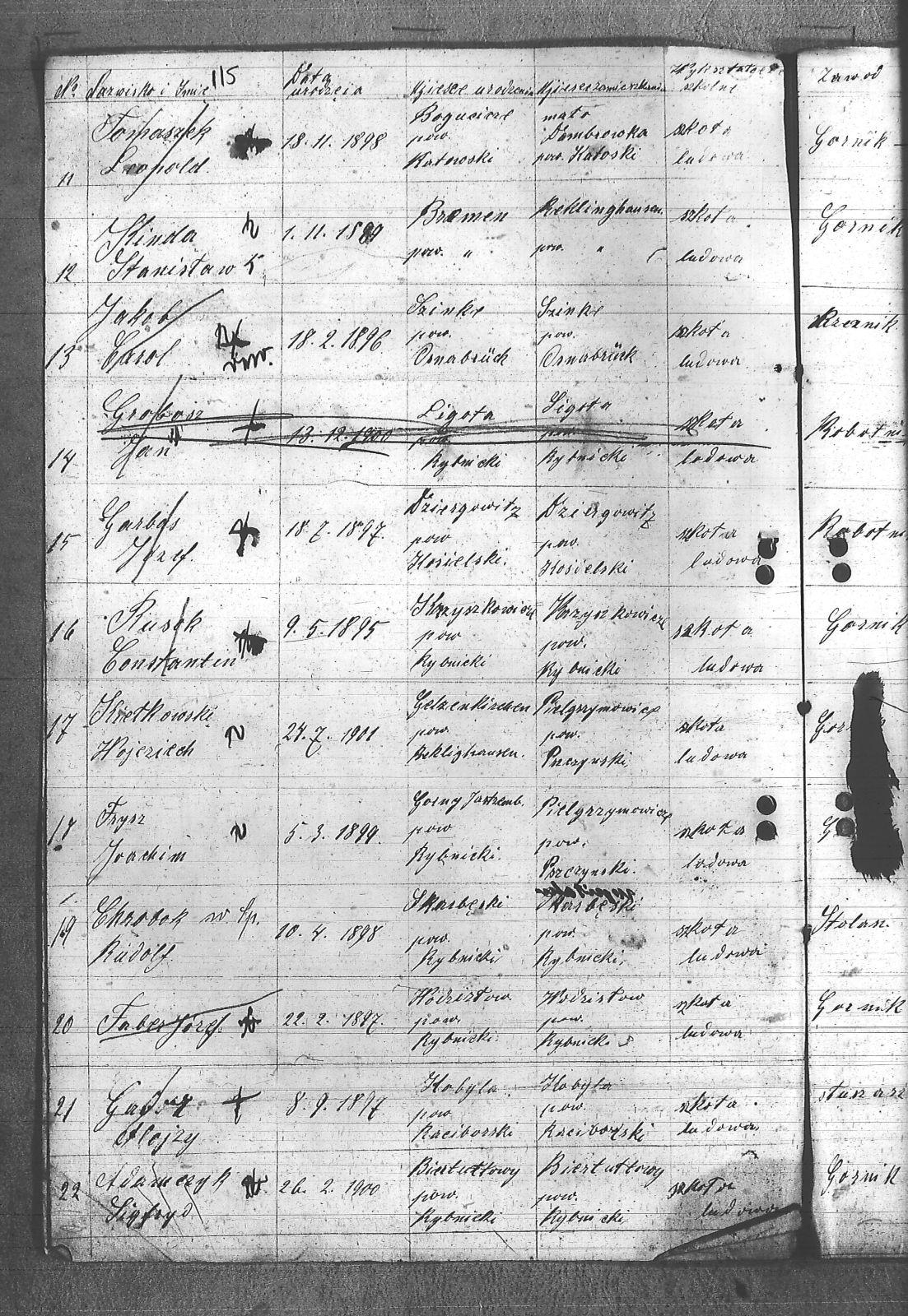 Adamczyk, Walenty; Adamczyk, Zygfryd; Baszton, Józef; Bluszcz, Karol; Bugla, Jan; Chrobok, Rudolf; Chwałczyk, Paweł; Czajka, Robert; Donicka, Maksymilian; Faber, Józef; Firut, Piotr; Fridrich, Wincenty; Frysz, Joachim; Gabor, Alojzy; Gaflik, Augustyn; Garbas, Józef; Gawełczyk, Ludwig; Gawenda, Adolf; Grobelny, Aloizy; Henzel, Franciszek; Herok, Antoni; Hoła, Alojzy; Huwer, Feliks; Jakub, Karol; Jarzyna, Ottoń; Kiełkowski, Ludwig; Kiełkowski, Wojciech; Kinda, Stanisław; Kisz, Franciszek; Klepek, Izydor; Klinik, Augustyn; Kłosek, Józef; Kołeczko, Stefan; Kornas, Dominik; Kornas, Mikołaj; Kuhs, Willus; Latocha, Józef; Łach, Antoni; Mandera, Paweł; Matuszek, Alojzy; Moczała, Maksymilian; Nowak, Wilhelm; Powiecka, Alfons; Powiecka, Alfred; Rusok, Constantin; Ruszański, Antoni; Salamon, Jan; Schäefer, Józef; Sietek, Jan; Sopa, Ignacy; Stania, Paweł; Stasiowski, Jan; Suchota, Izydor; Szebesta, Józef; Szybesta, Wiktor; Talajko, Bolesła; Tomaszek, Leopold; Walla, Antoni; Wieczorek, Józef; Zielezny, Konstantyn; Zniszcoł, Jan; |