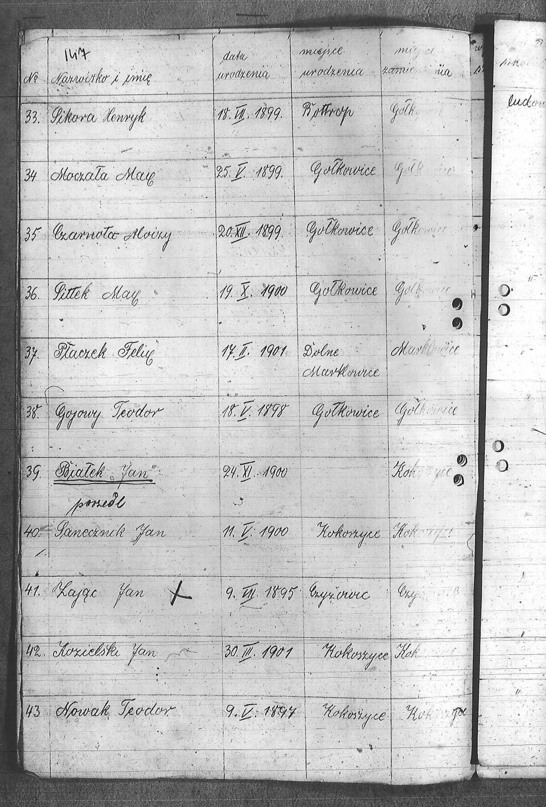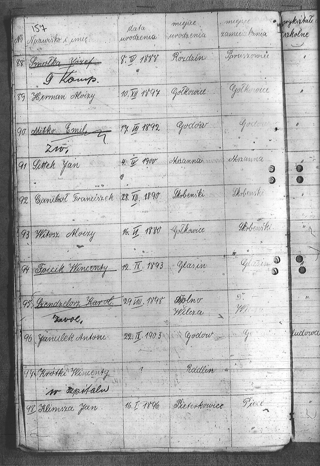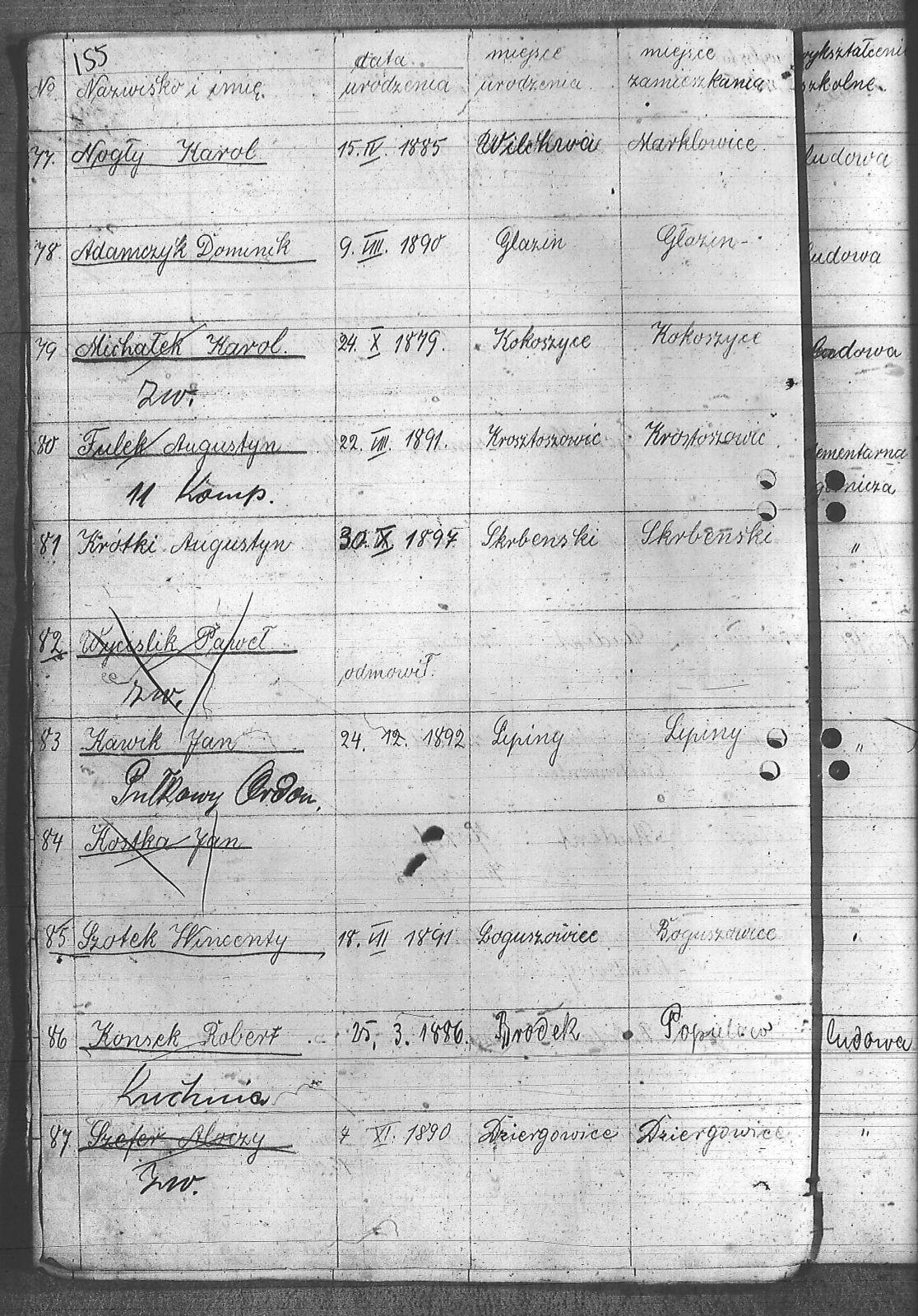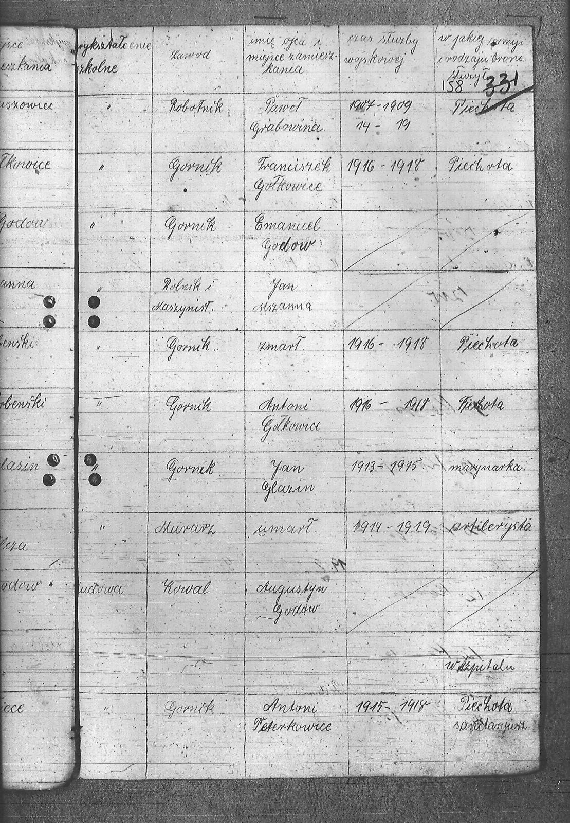 Adamczyk, Dominik; Adamczyk, Ludwik; Balcar, Augustyn; Balcar, Wilhelm; Bania, Stanisław; Benda, Henryk; Białek, Jan; Bohm, Rudolf; Brachmański, Mikołaj; Brachmański, Roman; Brzoza, Franciszek; Brzoza, Józef; Buchalik, Franciszek; Byszek, Władysław; Caniboł, Franciszek; Czajka, Paweł; Czarnota, Aloizy; Czarnota, Piotr; Czech, Józef; Dawiec, Stanisław; Drechsler, Wilhelm; Ferenc, Franciszek; Ferenc, Józef; Foicik, Roman; Foicik, Wincenty; Fulek, Augustyn; Gajowy, Piotr; Glassner, Tradel; Gojowy, Teodor; Gorgol, Emil; Góra, Marcin; Grobelny, Józef; Guzikowski, Jan; Herman, Aloizy; Janetta, Franciszek; Janulek, Antoni; Jęczmionka, Karol; Kampczyk, Pius; Kawałkiewicz, Stefan; Kawik, Jan; Klimsza, Jan; Kłosek, Karol; Kłosek, Ludwik; Kłosek, Mateusz; Konsek, Robert; Kozielski, Jan; Krenzel, Julian; Krótki, Augustyn; Krótki, Wincenty; Kubica, Aloizy; Kuźnik, Aloizy; Łaciak, Ernest; Madej, Brunon; Maizner, Emil; Maizner, Józef; Meizner, Franciszek; Meizner, Karol; Michalski, Jakub; Michałek, Karol; Mitko, Emil; Moczała, Józef; Moczała, Maksymilian; Musioł, Augustyn; Musioł, Franciszek; Myszkowski, Mieczysław; Nagrabka, Stanisław; Nendza, Józef; Nogły, Karol; Nowak, Teodor; Patas, Franciszek; Penkalla, Alojzy; Pietraszek, Alex; Pietraszek, Józef; Plewnia, Emil; Płaczek, Felix; Płaczek, Józef; Popek, Ernest; Potysz, Jan; Potysz, Rudolf; Prachowski, Aloizy; Ratajczak, Walenty; Reclik, Józef; Ruśniok, Jan; Salamon, Aloizy; Sanecznik, Jan; Siejak, Aleksander; Sieroszyński, Jan; Sikora, Henryk; Sitek, Józef; Sittek, Jan; Sittek, Max; Skupień, Jan; Smietana, Wawrzyn; Smołka, Józef; Sobol, Franciszek; Sondel, Karol; Staniczek, Paweł; Sternadel, Ernest; Stopiński, Karol; Sulewski, Stanisław; Surma, Piotr; Szefer, Aloizy; Szendzielorz, Karol; Szostek, Jan; Szotek, Wincenty; Szymiczek, Józef; Wajda, Kazimierz; Wala, Antoni; Warzecha, Szymon; Wawrosz, Franciszek; Wawrosz, Jan; Witosz, Alojzy; Wojtek, Emil; Zając, Edward; Zając, Jan; Zając, Józef; Zbieszczyk, Wilhelm; Zimocha, Jakub; Zych, Stanisław; |