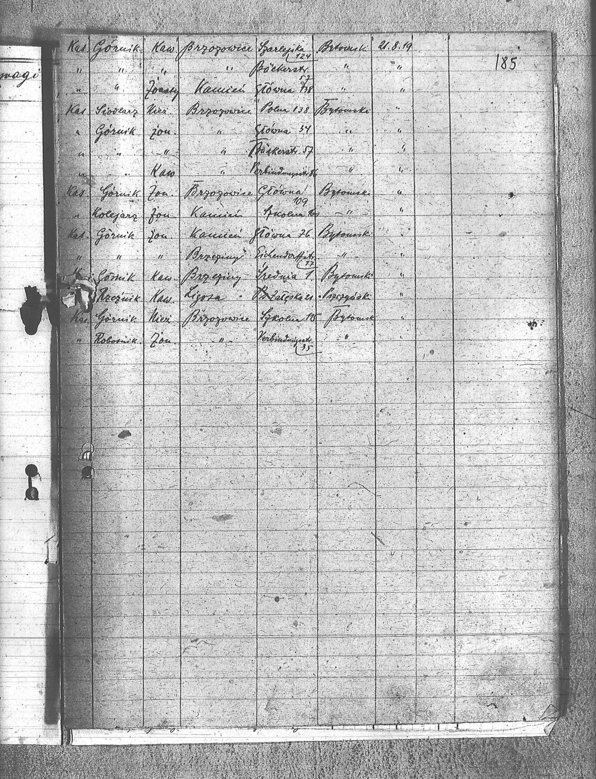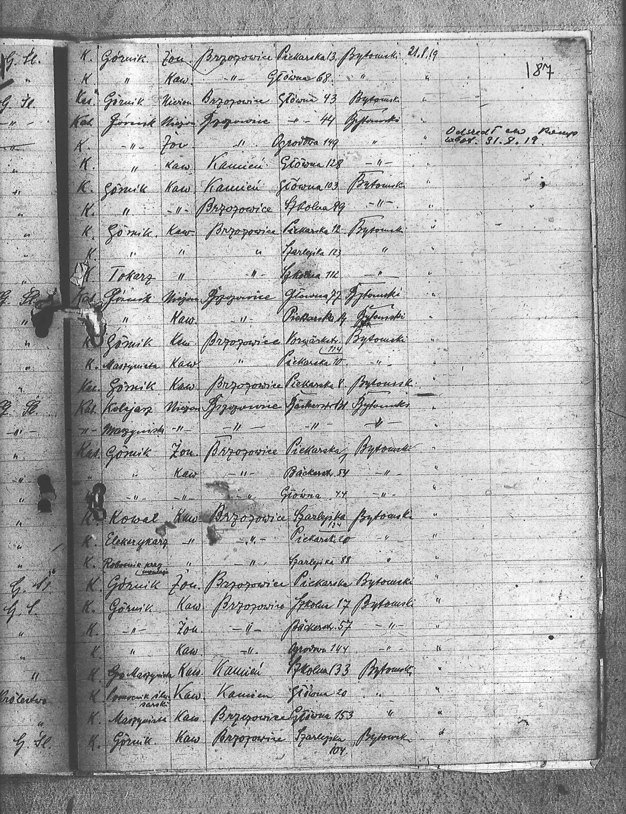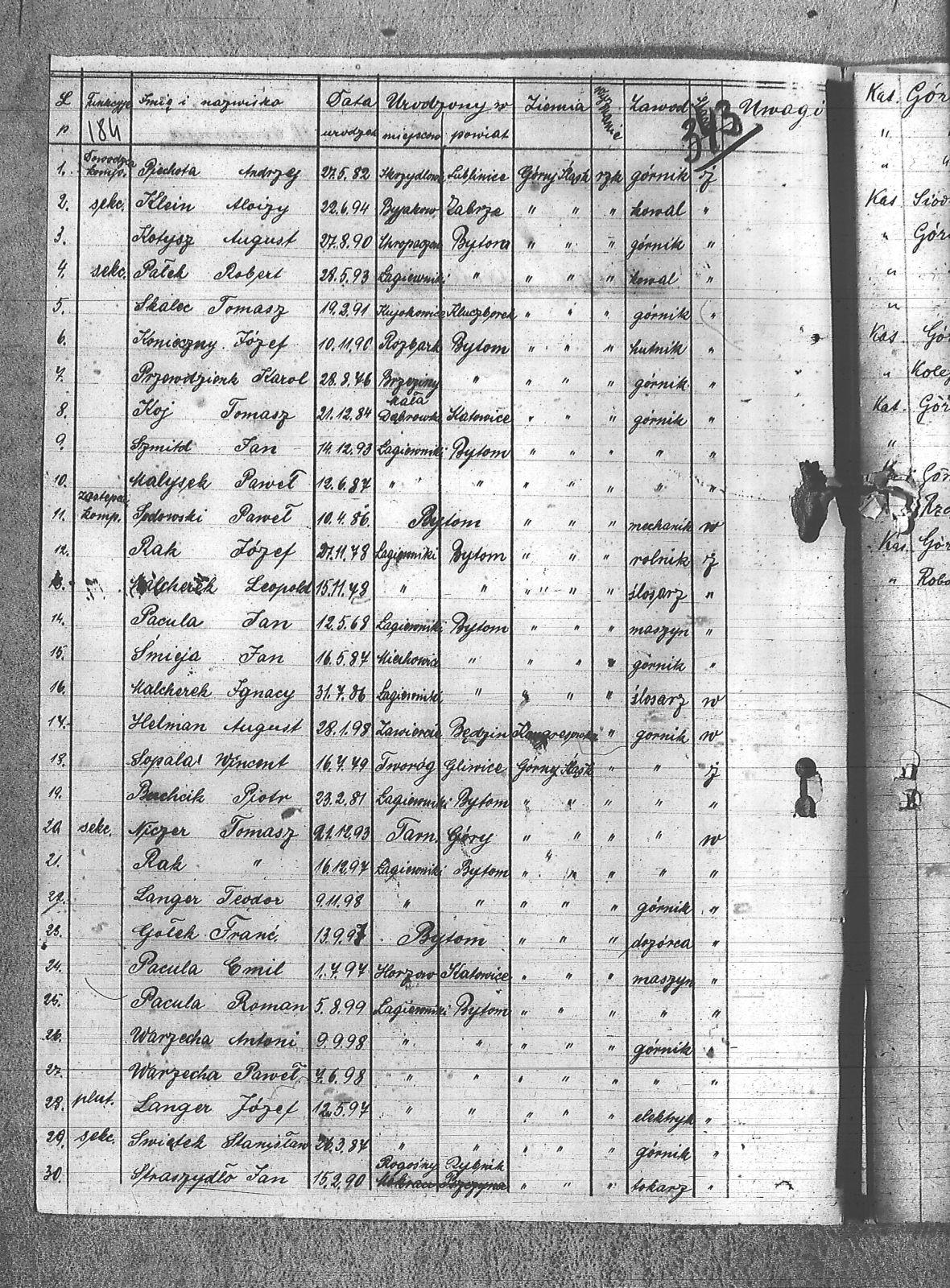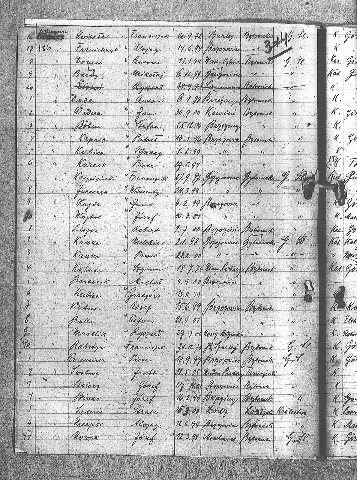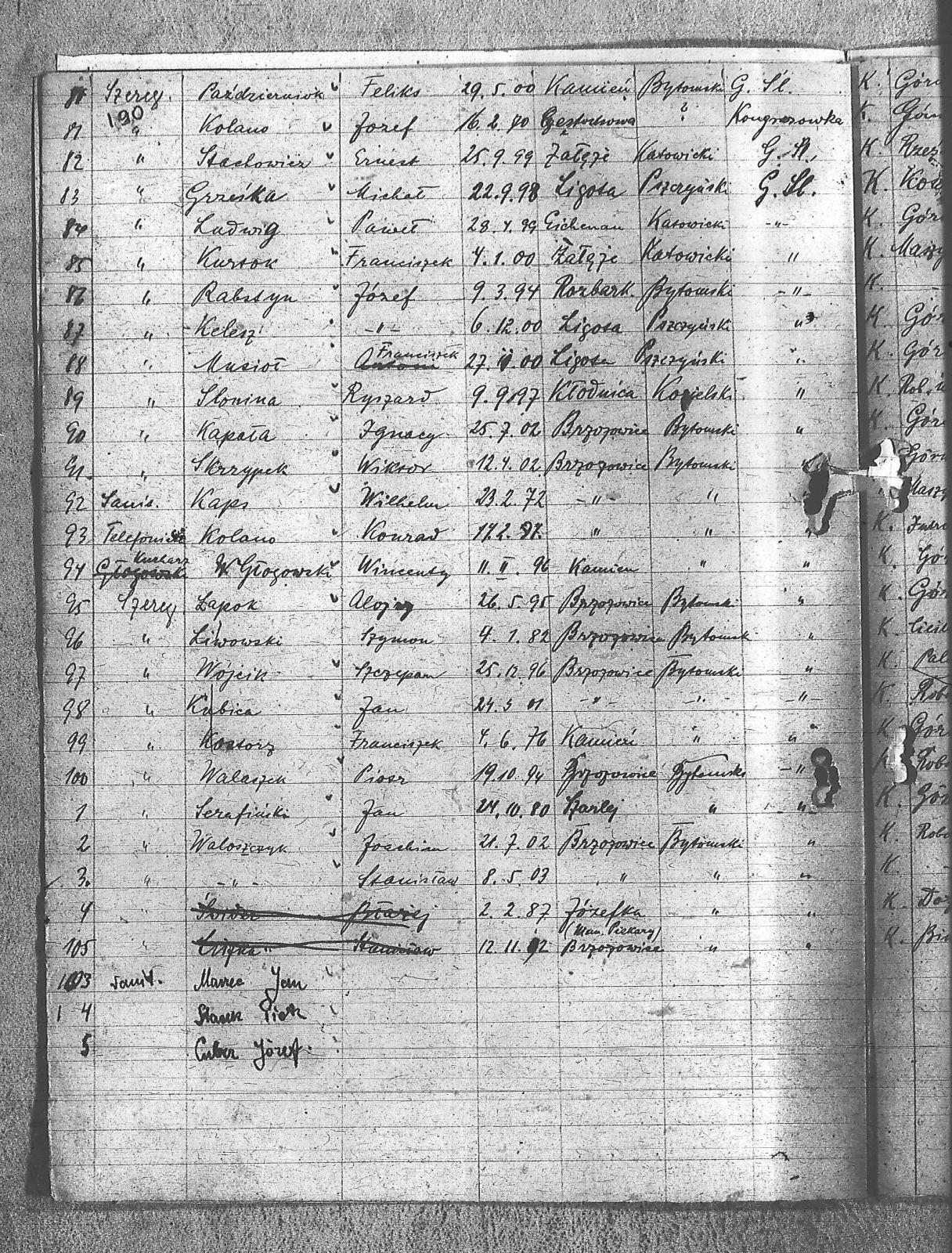 Bachcik, Piotr; Baron, Mikołaj; Bartosik, Michał; Bebiółka, Ignacy; Białas, Karol; Binas, Józef; Böhm, Stefan; Bulla, Alfons; Ciechowski, Teodor; Cuber, Józef; Domin, Antoni; Duda, Antoni; Franielczyk, Alojzy; Franielczyk, Mikołaj; Gałek, Franicszek; Głogowski, Wincenty; Grześka, Michał; Hajda, Jan; Hajduga, Ludwik; Herman, August; Hotnisz, Józef; Jureczek, Wincenty; Kaczmarczyk, Franciszek; Kamieński, Franciszek; Kapała, Ignacy; Kapała, Paweł; Kaps, Wilhelm; Kawka, Melchior; Kawka, Paweł; Kelesz, Józef; Kempiński, Piotr; Klein, Aloizy; Kloza, Paweł; Koj, Tomasz; Kolano, Józef; Kolano, Konrad; Konieczny, Józef; Kostorz, Franciszek; Koszentka, Wawrzyn; Kot, Herman; Kotysz, August; Krzenciera, Piotr; Kubica, Adolf; Kubica, Grzegorz; Kubica, Ignacy; Kubica, Jan; Kuczok, Piotr; Kuhna, Szymon; Kupny, Adolf; Kurtok, Franciszek; Langer, Józef; Langer, Teodor; Lasok, Franciszek; Liszka, Robert; Liwowski, Szymon; Ludwig, Paweł; Łapok, Alojzy; Majcher, Paweł; Malcherek, Ignacy; Malcherek, Leopold; Marzec, Jan; Maselik, Ryszard; Matejczyk, Maksymilian; Matysek, Paweł; Musioł, Franciszek; Niczer, Tomasz; Nieszpór, Alojzy; Nowok, Józef; Ogaza, Józef; Pacuła, Emil; Pacuła, Jan; Pacuła, Roman; Pałek, Robert; Pawełczyk, Wincenty; Październik, Feliks; Pecz, Jan; Pelka, Jan; Piechota, Andrzej; Piwowar, Jerzy; Pośpiech, Jan; Przewdzienk, Karol; Pytlik, Jan; Rabsztyn, Franciszek; Rabszyn, Józef; Rak, Józef; Rak, Tomasz; Sadowski, Paweł; Serafiński, Jan; Sidezis, Straty; Siwy, Leon; Skalec, Tomasz; Skrzypek, Wiktor; Slonina, Ryszard; Sonka, Henryk; Sopala, Wincent; Sosinka, Karol; Sośnica, Józef; Stachowicz, Ernest; Stania, Piotr; Stasek, Wawrzyn; Stolorz, Józef; Straszydło, Jan; Swoboda, Jakub; Szczygioł, Herman; Szeja, Bernard; Szmitd, Jan; Śmieja, Jan; Świętek, Stanisław; Świtała, Franciszek; Tomala, Franciszek; Tomanek, Ernest; Waloszczyk, Joachim; Waloszczyk, Sylwester; Waloszek, Piotr; Warwas, Piotr; Warzecha, Antoni; Warzecha, Paweł; Widcza, Jan; Wojtol, Józef; Wolaszczyk, Stanisław; Wójcik, Szczepan; Ziaja, Edmund; |