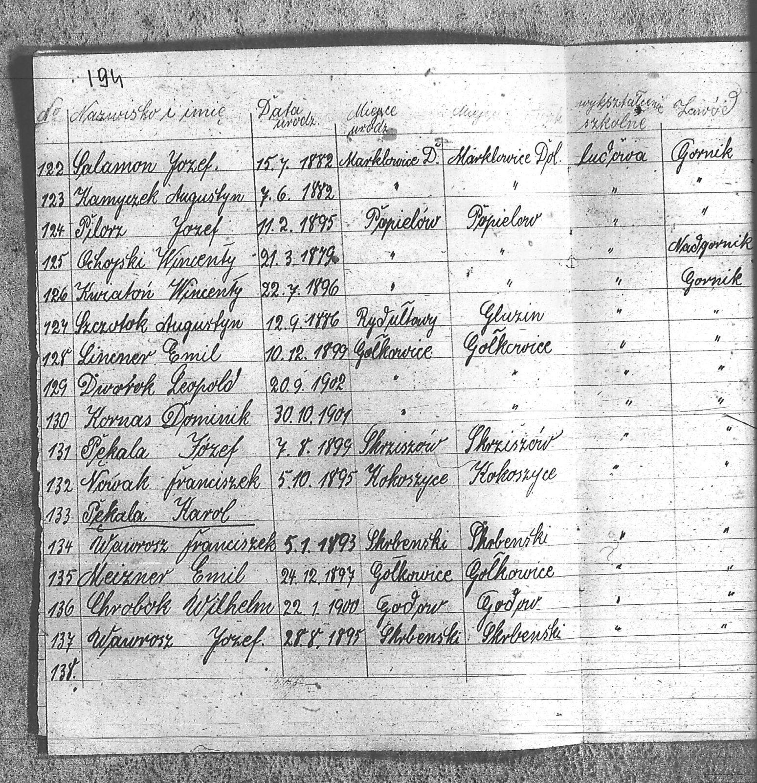 | Osoby | Chrobok, Wilhelm; Dworok, Leopold; Kamyczek, Augustyn; Kornas, Dominik; Kwiatoń, Wincenty; Lincner, Emil; Meizner, Emil; Nowak, Franciszek; Ochojski, Wincenty; Pękala, Józef; Pękala, Karol; Pilorz, Józef; Salamon, Józef; Szczotok, Augustyn; Wawrosz, Franciszek; Wawrosz, Józef; |