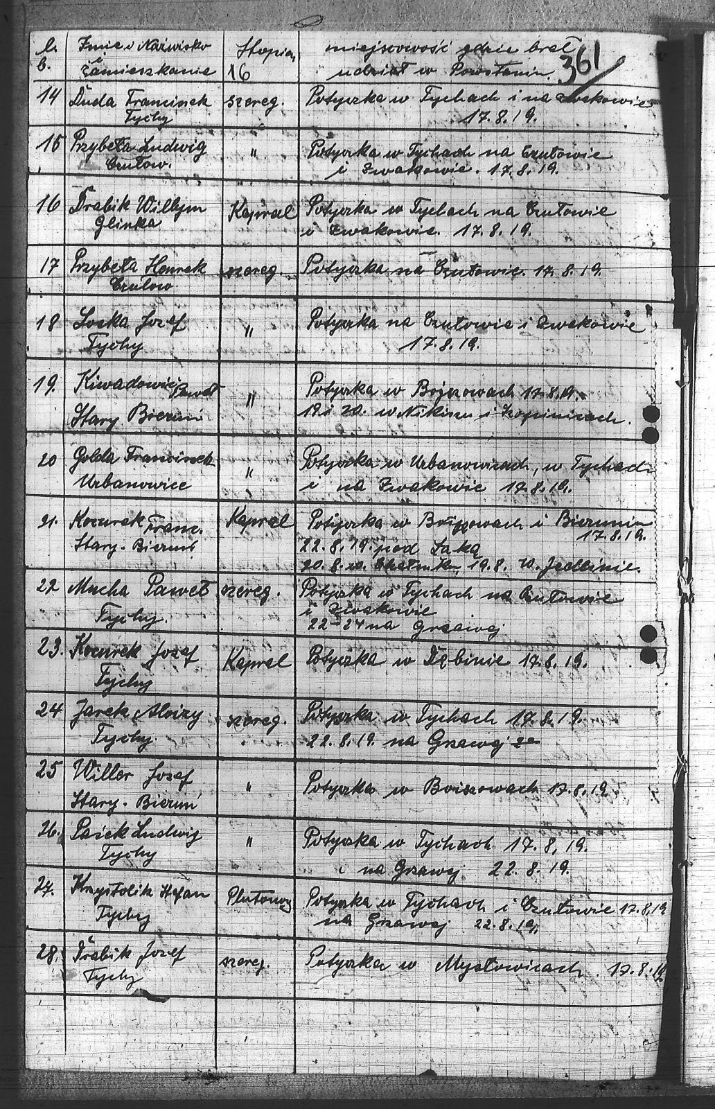 | Osoby | Baron, Jan; Baron, Teodor; Bialik, Józef; Bielas, Willym; Brzęk, Ludwik; Drabik, Józef; Drabik, Willym; Duda, Franciszek; Golda, Franciszek; Grzesica, Józef; Jagoda, Józef; Jarek, Aloizy; Kiwadowić, Paweł; Kocurek, Franc.; Kocurek, Józef; Koczy, Wojciech; Kostyra, Jakub; Krzystolik, Stefan; Loska, Józef; Mucha, Paweł; Paźek, Ludwik; Przybeła, Henryk; Przybeła, Ludwik; Pucher, Józef; Seky, Józef; Sojka, Paweł; Tray, Aloizy; Willer, Józef; |