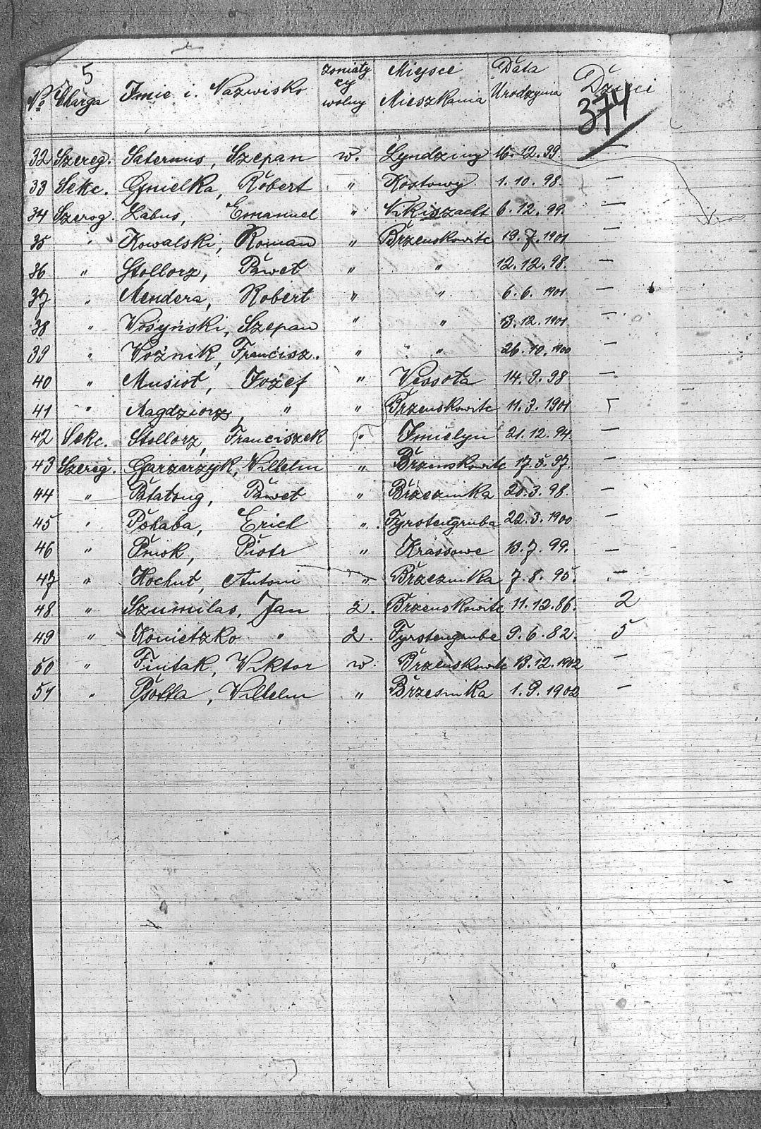 Biecki, Klemens; Blaut, Piotr; Brzozowski, Józef; Fintak, Wiktor; Garzarzyk, Wilhelm; Geppert, Jan; Głyk, Franciszek; Gmielka, Robert; Grzyb, Józef; Habryka, Leon; Hochuł, Antoni; Hochuł, Franciszek; Koniecko, Jan; Konieczny, Klemens; Korus, Jan; Kowalski, Alojzy; Kowalski, Roman; Kowalski, Ryszard; Kutz, Tomasz; Labus, Emanuel; Magdziorz, Józef; Mendera, Robert; Mosler, Jan; Mosler, Walentyn; Musioł, Józef; Musioł, Wilhelm; Patałong, Paweł; Piontek, Franciszek; Pniok, Alojzy; Pniok, Piotr; Pohaba, Erich; Prać, Franciszek; Psota, Wilhelm; Roj, Teodor; Sarna, Jan; Saternus, Szczepan; Sekuła, Augustyn; Stolorz, Franciszek; Stolorz, Paweł; Synowiec, Piotr; Szumilas, Jan; Tusiński, Józef; Urbańczyk, Jan; Woszyński, Szczepan; Woźnik, Franciszek; Wróbel, Paweł; Zgubiś, Franciszek; Zubel, Jan; Żołna, Jan; Żołna, Michał; Żołna, Paweł; |
