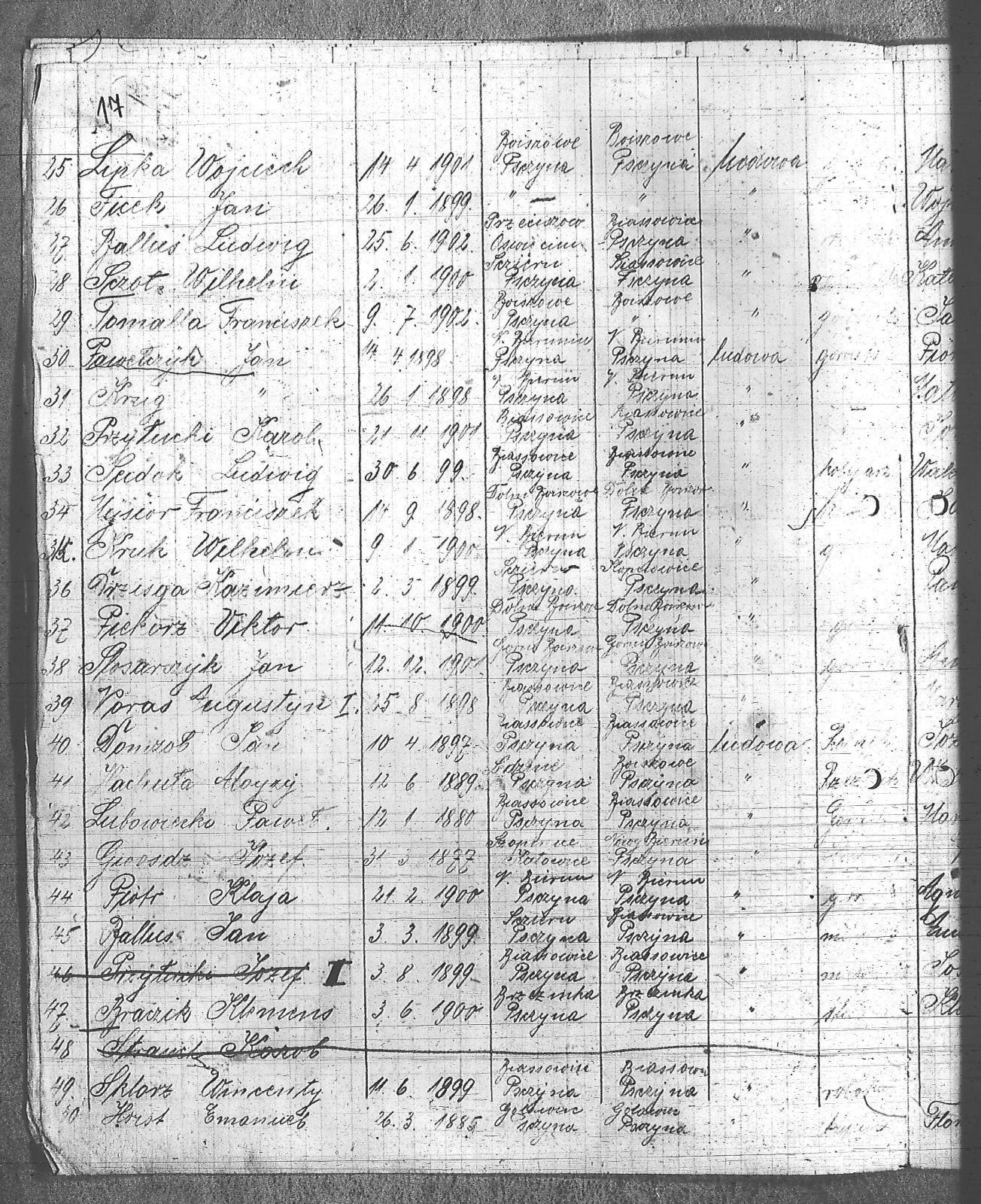 Anderzoold, Franc.; Balus, Jan; Balus, Ludwik; Bogacz, Józef; Bracik, Klemens; Czarnynoga, Augustyn; Doktor, Alojzy; Domżoł, Jan; Drożdż, Ignacy; Drzyzga, Kazimierz; Ficek, Jan; Golus, Robert; Grabowski, Józef; Gwóźdź, Józef; Hachuła, Alojzy; Horst, Emanuel; Jaromin, Jan; Jaromin, Klemens; Klaja, Piotr; Krug, Jan; Kruk, Wilhelm; Krzykowski, Jan; Kula, Franciszek; Kula, Jakub; Ledwik, Karol; Lipka, Wojciech; Lubowiecki, Paweł; Magiera, Franciszek; Mendryla, Stanisław; Mysior, Franciszek; Noras, Augustyn I; Noras, Augustyn II; Pala, Jakub; Pawełczyk, Jan; Piekorz, Wiktor; Pietrański, Adolf; Przyłucki, Karol; Sajdok, Ludwik; Sczoł, Wilhelm; Stachura, Józef; Szklon, Wincenty; Ślusarczyk, Jan; Tomala, Franciszek; Wachstieb, Jakub; Witek, Józef; Zawisza, Józef; Żołna, Paweł; |