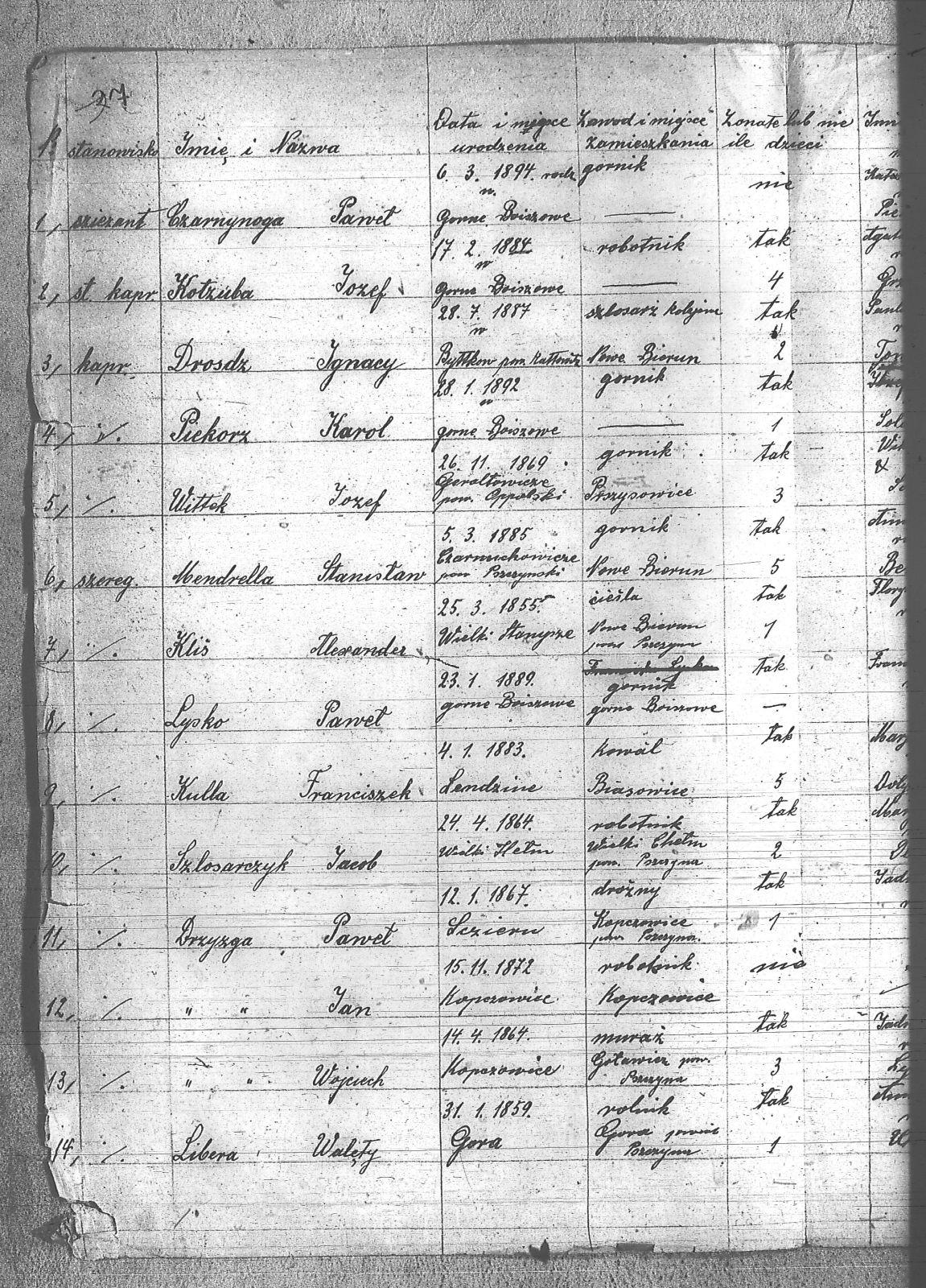 | Osoby | Czarnynoga, Paweł; Dróżdż, Ignacy; Drzyzga, Jan; Drzyzga, Paweł; Drzyzga, Wojciech; Kliś, Aleksander; Kotzuba, Józef; Kula, Franciszek; Libera, Walenty; Lysko, Paweł; Mendrek, Stanisław; Piekorz, Karol; Ślusarczyk, Jakub; Witek, Józef; |