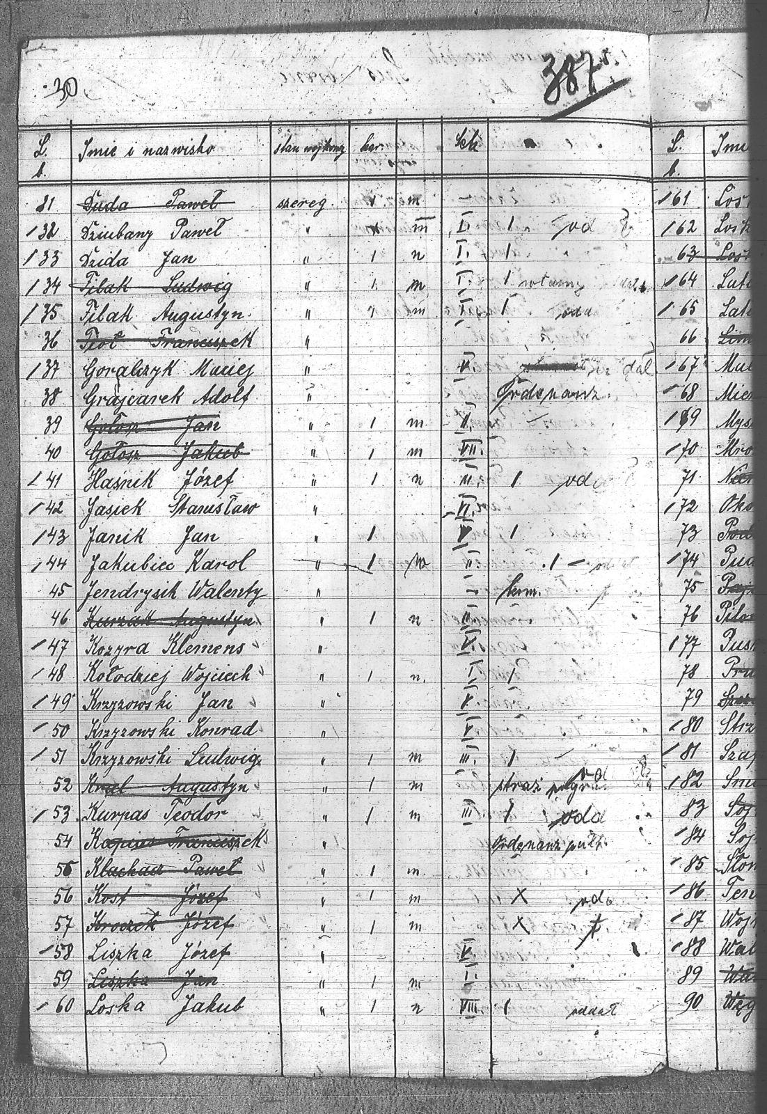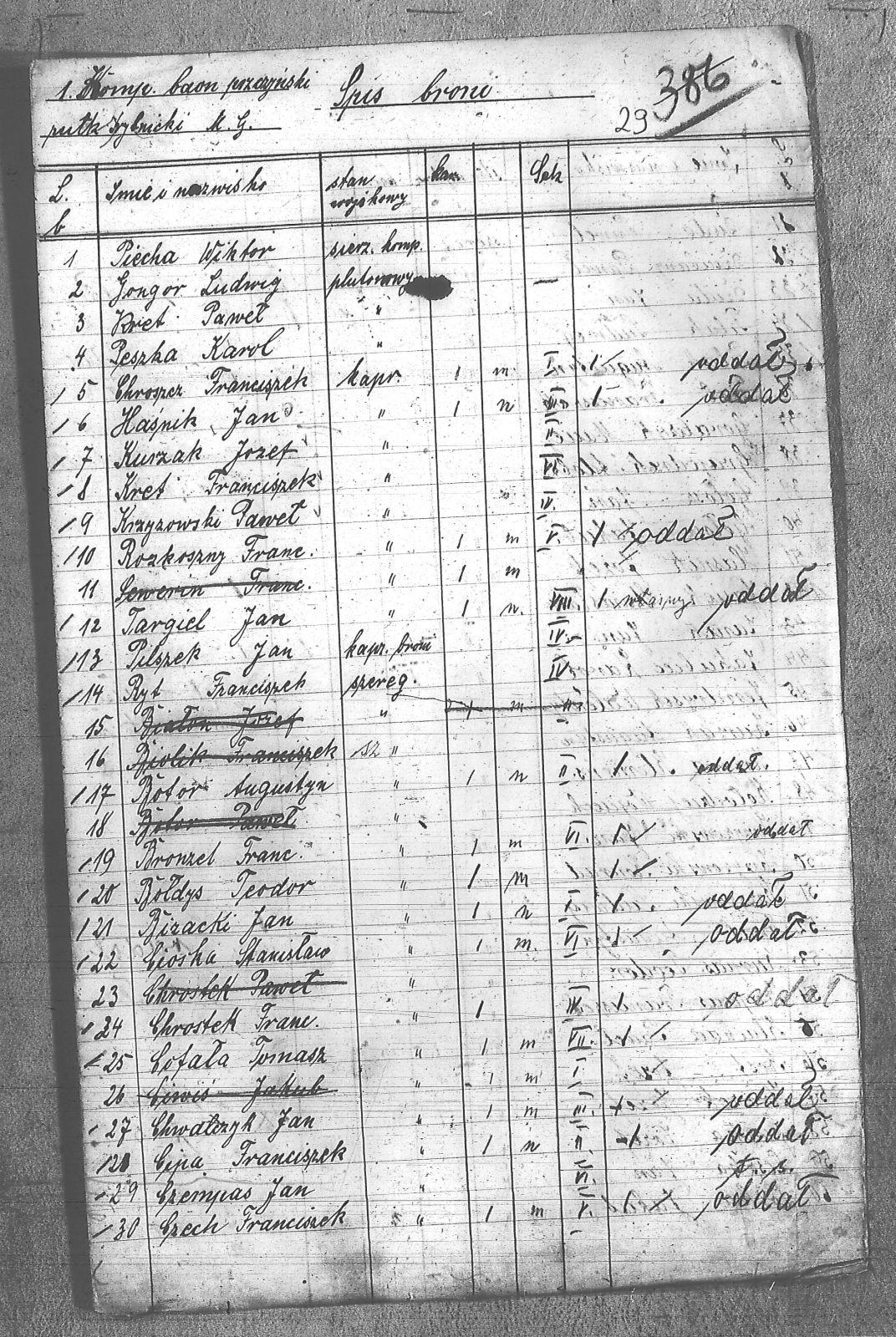 Bizacki, Jan; Bołdys, Teodor; Botor, Augustyn; Bronzel, Franciszek; Chrostek, Franciszek; Chrószcz, Franciszek; Chwalczyk, Jan; Ciałoń, Antoni; Cioska, Stanisław; Cipa, Franciszek; Cofała, Tomasz; Czech, Franciszek; Czempas, Jan; Dzida, Jan; Dziubany, Paweł; Filak, Augustyn; Geglok, Karol; Gongor, Ludwik; Góralczyk, Maciej; Grajcarek, Adolf; Grzondziel, Adolf; Haśnik, Jan; Haśnik, Józef; Jakubiec, Karol; Janik, Jan; Jasiek, Stanisław; Jendrysik, Walenty; Karuga, Paweł; Kołodziej, Wojciech; Komrans, Józef; Kozyra, Klemens; Kret, Franciszek; Kret, Paweł; Krzyżowski, Jan; Krzyżowski, Konrad; Krzyżowski, Ludwik; Krzyżowski, Paweł; Kuczak, Józef; Kurpas, Teodor; Latusik, Franciszek; Latusik, Paweł; Lisoń, Józef; Liszka, Józef; Loska, Jakub; Loska, Jan; Loska, Karol; Loska, Wiktor; Malcharek, Franciszek; Mierny, Michał; Mrozik, Maciej; Myszor, Paweł; Okoń, Józef; Peszka, Karol; Piecha, Wiktor; Pilszek, Jan; Pudełko, Grzegorz; Pustelnik, Jan; Rozkoszny, Franciszek; Ryt, Franciszek; Słomka, Józef; Sojka, Michał; Strzoda, Augustyn; Szafron, Jan; Szczygieł, Wiktor; Szojda, Emanuel; Szojda, Paweł; Śmiłowski, Tomasz; Targiel, Jan; Tendera, Jan; Turczyński, Alojzy; Walter, Józef; Wilgus, Fryderyk; Wojtyka, Walenty; Wojtyszek, Józef; Zimnol, Jakub; Zychoń, Jan; Żołna; |
