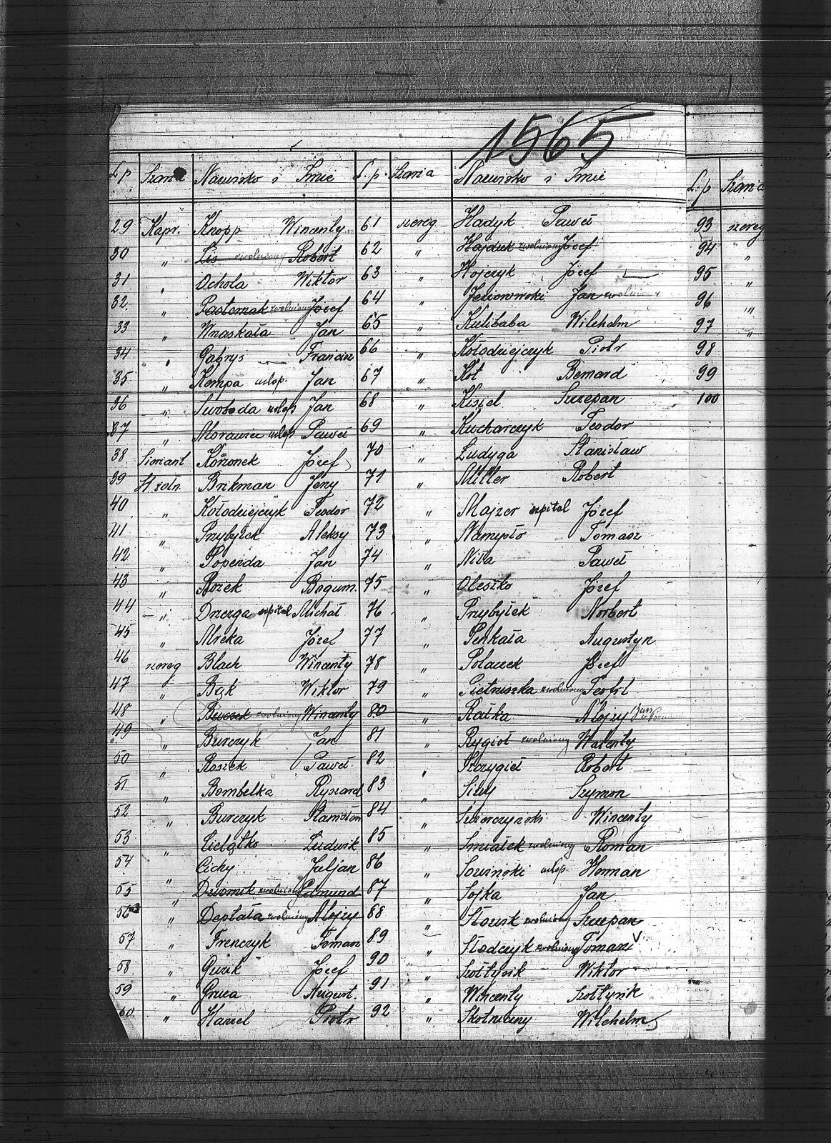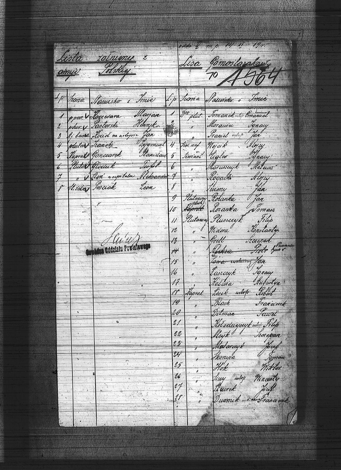 Alzyk, Szczepan; Bąk, Wiktor; Blach, Wincenty; Błach, Franciszek; Bombelka, Ryszard; Brikman, Jerzy; Buczek, Wincenty; Burczyk, Jan; Burczyk, Stanisław; Cichy, Julian; Cielątko, Ludwik; Cigler, Ignacy; Deptała, Alojzy; Ditman, Paweł; Drzezga, Michał; Dwornik, Edmund; Dwornik, Franciszek; Frenczyk, Tomasz; Gabryś, Franciszek; Głodzik, Teofil; Gonczarek, Stanisław; Grell, Szczepan; Gruca, August; Guzik, Józef; Hadyk, Paweł; Hajduk, Józef; Haniel, Piotr; Hojczyk, Józef; Hok, Wiktor; Jeziorowski, Jan; Jurek, Józef; Kałuża, Augustyn; Kisiel, Szczepan; Knopp, Wincenty; Kocioł, Jan; Koczwara, Marian; Kołodziejczyk, Filip; Kołodziejczyk, Piotr; Kołodziejczyk, Teodor; Kompa, Jan; Korzonek, Józef; Kot, Bernard; Kucharczyk, Teodor; Kulibaba, Wilhelm; Laszczyk, Ignacy; Lesik, Robert; Lis, Robert; Łudyga, Stanisław; Majzer, Józef; Malarczyk, Józef; Maruszczyk, Mateusz; Miller, Robert; Morawiec, Ignacy; Morawiec, Paweł; Mreka, Józef; Namysło, Tomasz; Niła, Paweł; Ochola, Wiktor; Oleszko, Józef; Pasternak, Józef; Pasterski, Henryk; Penkała, Augustyn; Pietruszka, Teofil; Pluszczyk, Filip; Polaczek, Józef; Popenda, Jan; Praniel, Jan; Prociak, Leon; Przybyłek, Aleksy; Przybyłek, Norbert; Rałka, Alojzy; Rogacki, Alojzy; Roszek, Paweł; Rozanka, Jan; Rozanka, Tomasz; Rożek, Bogumił; Rygioł, Walenty; Silny, Szymon; Siwy, Wincenty; Skorupa, Tomasz; Skotniczny, Wilhelm; Słodczyk, Tomasz; Słoń, Aleksander; Słowik, Szczepan; Sojka, Jan; Sowinski, Herman; Swoboda, Jan; Szański, Zygmunt; Szczygieł, Robert; Szołtysik, Wiktor; Szołtysik, Wincenty; Śmiałek, Roman; Świerczynski, Wincenty; Świerzy, Jan; Tkocz, Antoni; Tomanek, Emanul; Tomanek, Kazimierz; Weis, Roman; Widera, Konstanty; Wieczorek, Adolf; Wilk, Florian; Wójcik, Alojzy; Wrzaskała, Jan; |