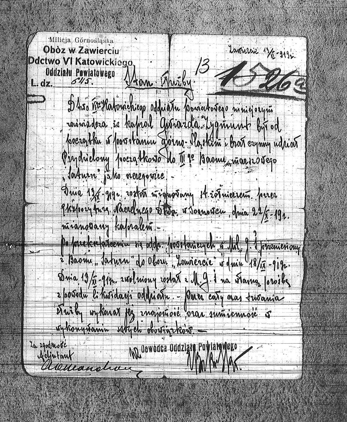 | Instytucje | Dowódctwo VI Katowickiego Oddziału Powiatowego L.dz. 645 Podpisał Dowódca Oddziału Powiatowego; Milicja Górnośląska; Milicja Górnośląska. Obóz w Zawierciu |