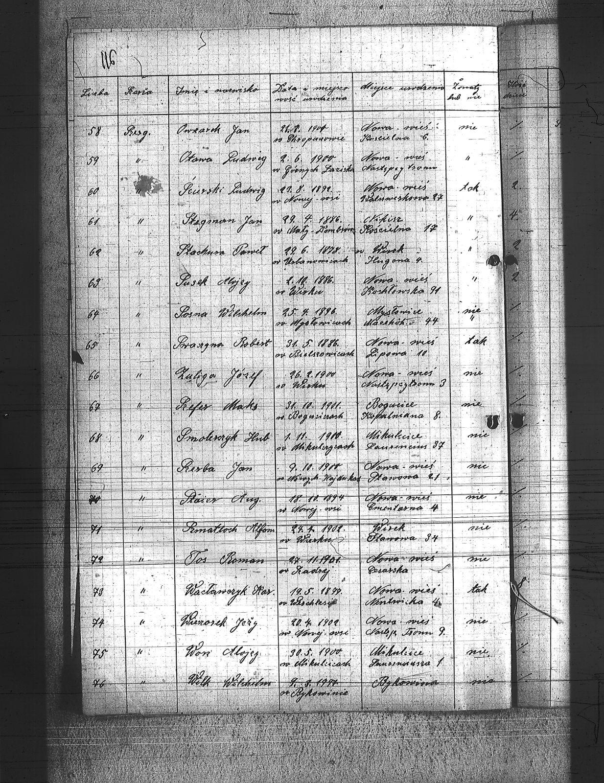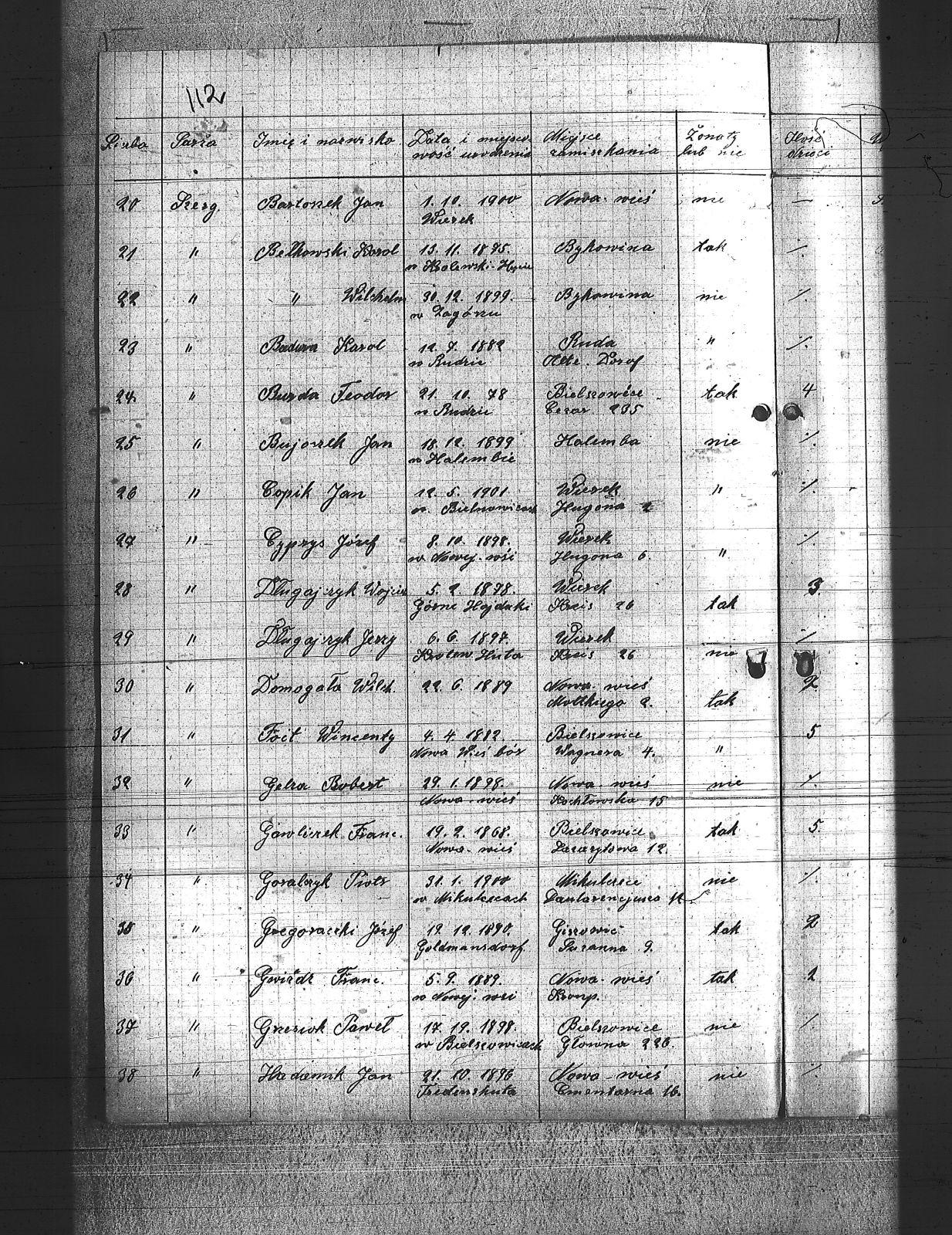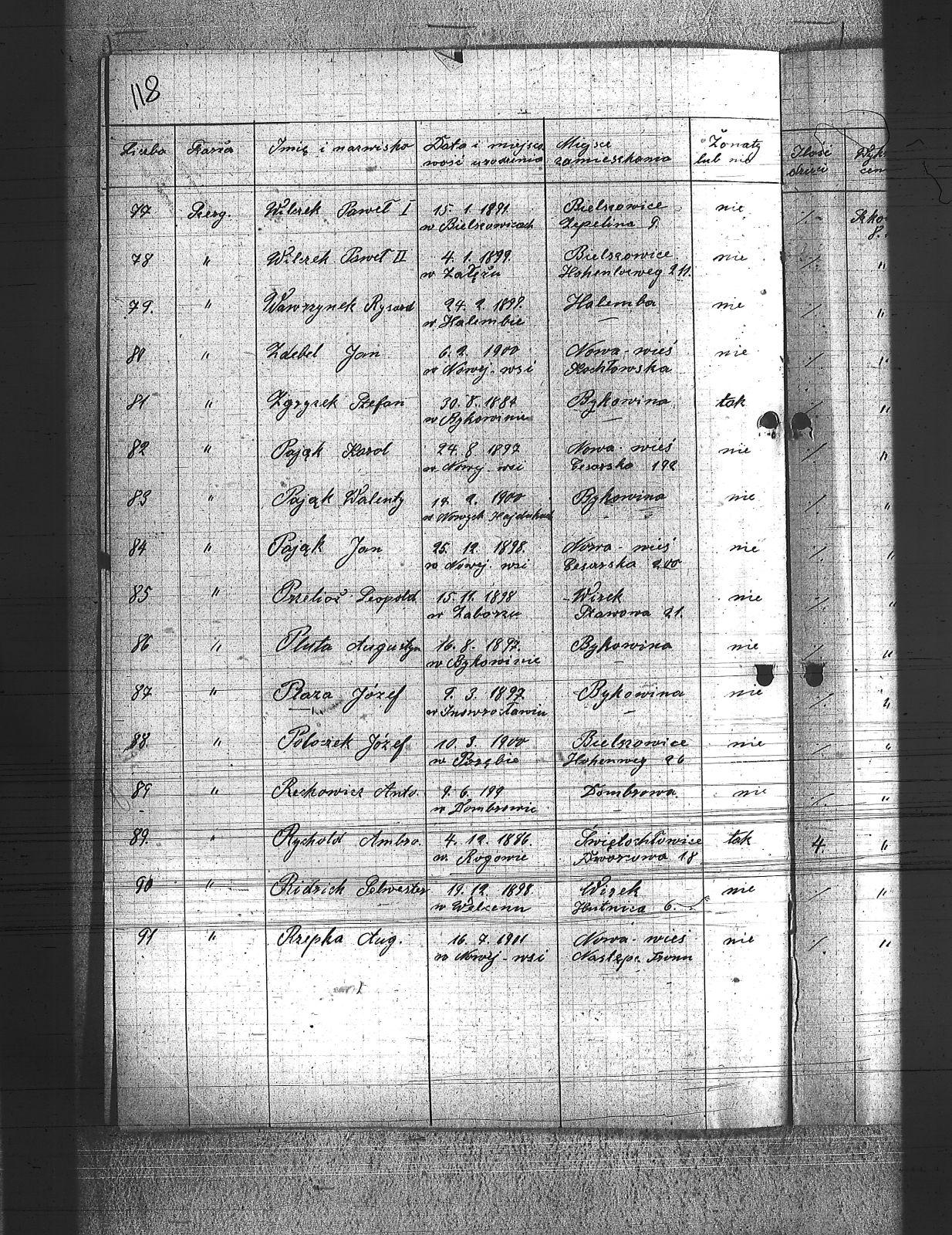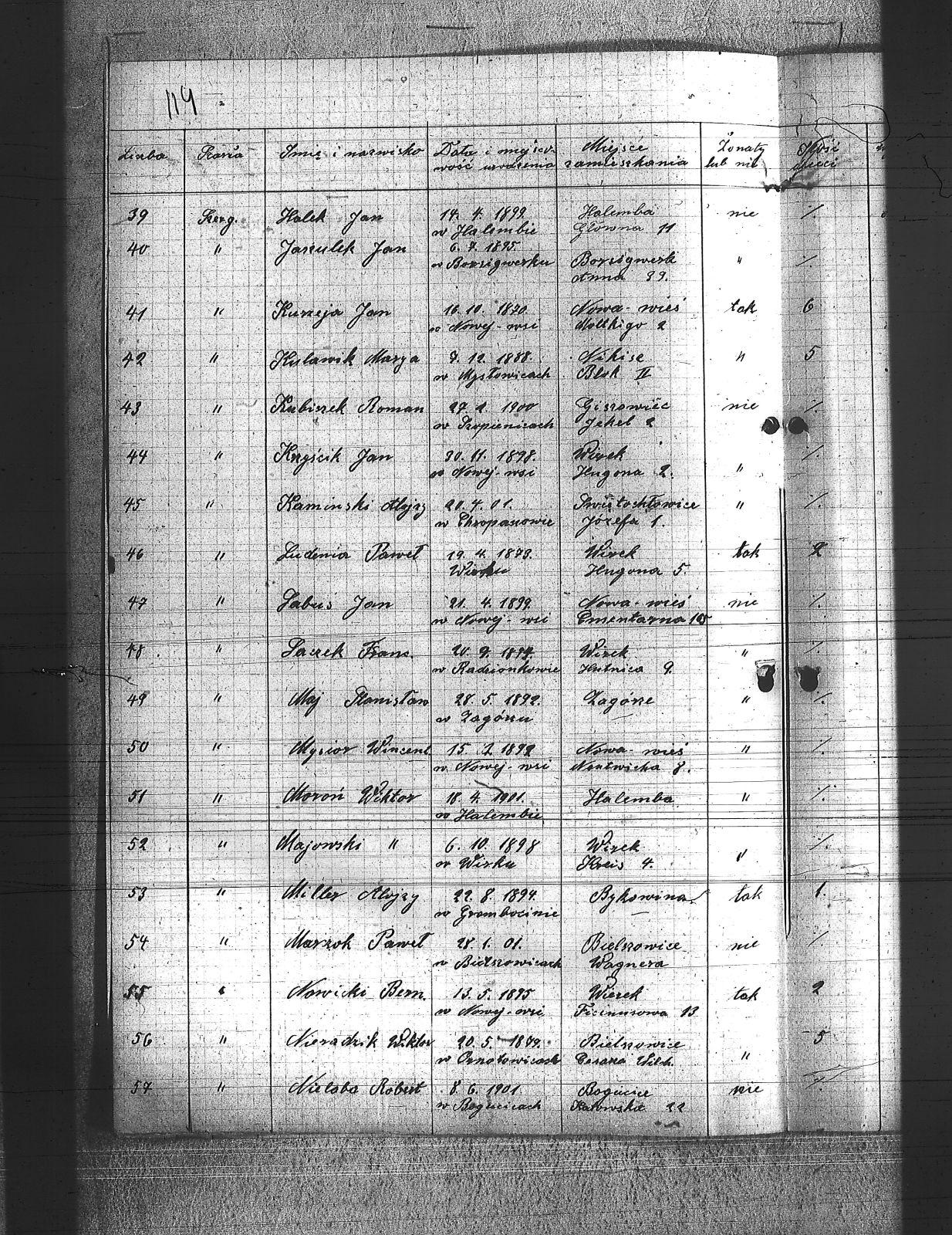 Badura, Jan; Badura, Karol; Bartoszek, Jan; Biłkowski, Karol; Biłkowski, Wilhelm; Bujoszek, Jan; Burda, Teodor; Burek, Tadeusz; Copik, Jan; Copik, Wiktor; Cyprys, Józef; Długajczyk, Jerzy; Długajczyk, Wojciech; Domagała, Wilhelm; Filla, Jan; Foit, Wincenty; Gabór, Karol; Gabus, Jan; Gaczek, Franciszek; Gawliczek, Franciszek; Gelra, Robert; Golik, Józef; Góralczyk, Piotr; Grzegorski, Józef; Grzesiok, Paweł; Gwiżdż, Franciszek; Gwiżdż, Robert; Hadamik, Jan; Hajok, Paweł; Halek, Jan; Huj, Jan; Janulek, Jan; Kamiński, Alojzy; Krzyścik, Jan; Kubiszek, Roman; Kulawik, Marian; Kurzeja, Jan; Ludenia, Paweł; Maj, Stanisław; Majowski, Wiktor; Marzok, Paweł; Miller, Alojzy; Moroń, Wiktor; Mysior, Wincenty; Nieloba, Robert; Nieradzik, Wiktor; Nowak, Stefan; Nowicki, Bernard; Nowok, Teodor; Obrączka, Józef; Otawa, Ludwig; Owczarek, Jan; Pająk, Jan; Pająk, Karol; Pająk, Walenty; Plaza, Józef; Pluta, Augustyn; Poloczek, Józef; Przelioł, Leopold; Rechowicz, Antoni; Ridzich, Sylwester; Rychold, Ambroży; Rzepka, August; Salamon, Ludwik; Sitko, August; Siurski, Ludwig; Smolarczyk, Hubert; Sosna, Wilhelm; Stachura, Paweł; Staier, August; Stegman, Jan; Susek, Alojzy; Swaczyna, Robert; Szefer, Maks; Szerba, Jan; Szmatloch, Alfons; Tartas, Franciszek; Tos, Roman; Wacławczyk, Karol; Walus, Paweł; Wawrzynek, Ryszard; Wawrzynek, Teodor; Wieczorek, Jerzy; Wilczek 1, Paweł; Wilczek 2, Paweł; Wilk, Wilhelm; Wojtyczka, Alojzy; Worz, Alojzy; Zdebel, Jan; Zgryzek, Stefan; Zuliga, Józef; |