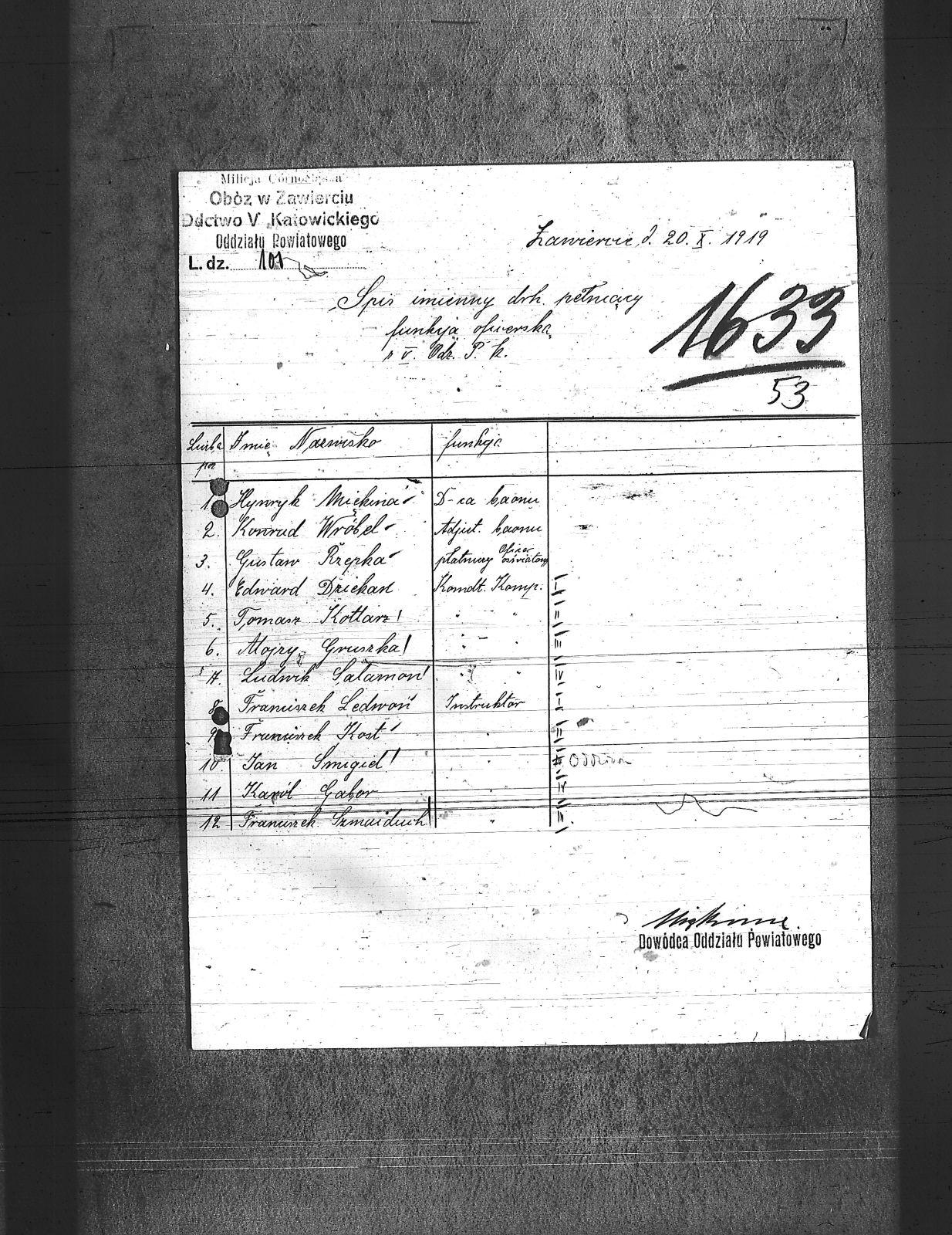 | Instytucje | Dowództwo V Katowickiego Oddziału Powiatowego - Dowódca Oddziału - H. Miękina; Milicja Górnośląska; Milicja Górnośląska. Obóz w Zawierciu |