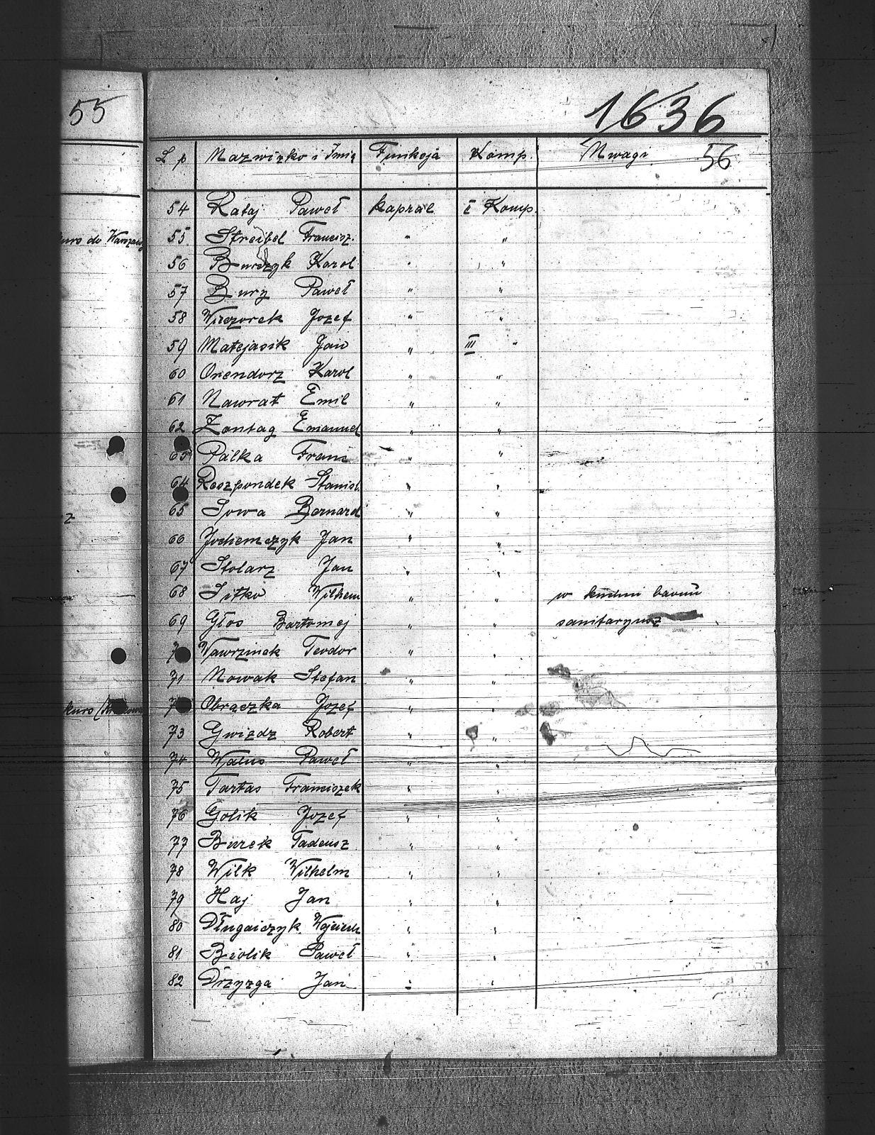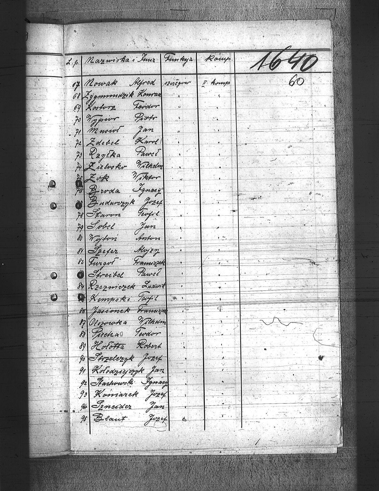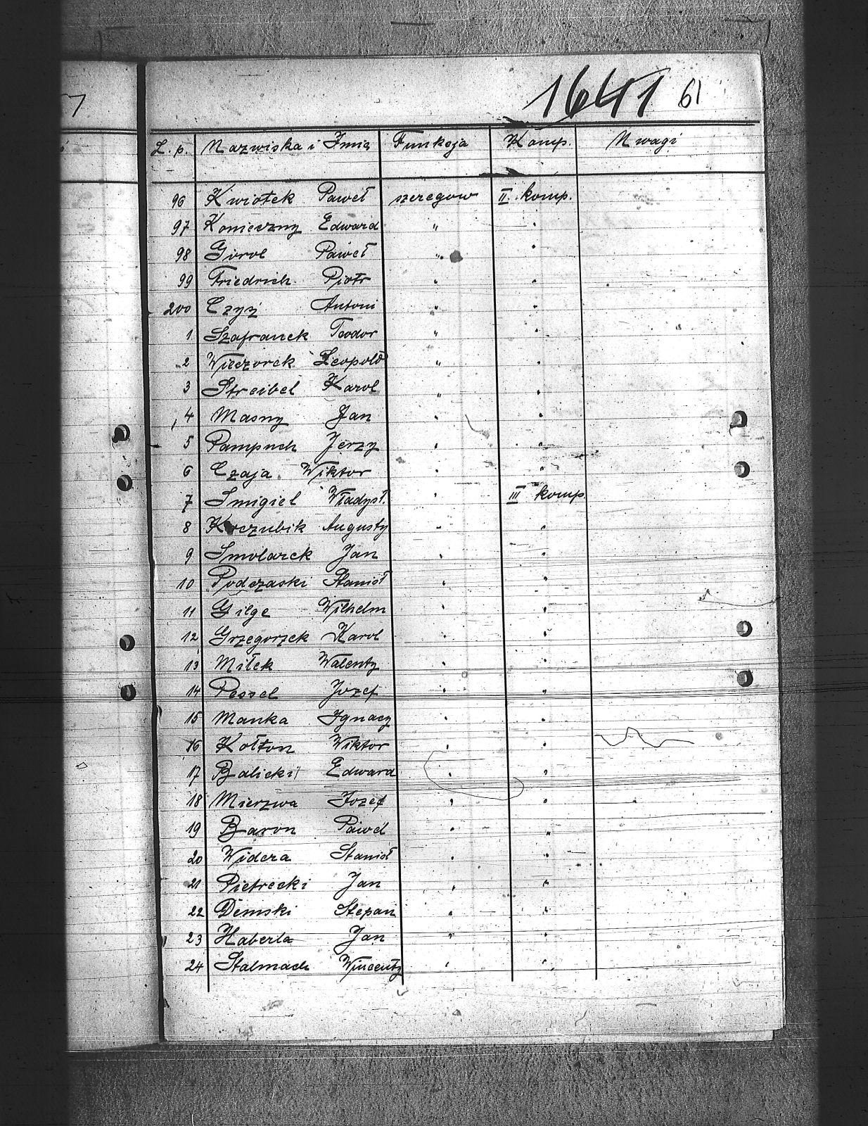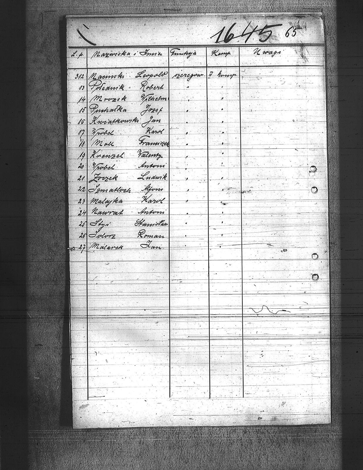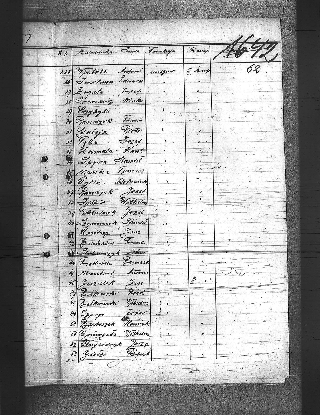 Adamiec, Franciszek; Anioł, Szczepan; Balicki, Edward; Baron, Paweł; Bartoszek, Henryk; Bawiert, Paweł; Bąk, Henryk; Bełkowski, Karol; Bełkowski, Wilhelm; Biolik, Paweł; Blaut, Józef; Brielich, Alojzy; Buchalis, Franciszek; Budarczyk, Józef; Bujoczek, Jan; Burczyk, Karol; Burda, Ignacy; Burek, Tadeusz; Bury, Paweł; Chroszcz, Herman; Ciołka, Wincenty; Ciszek, Emil; Cofała, Józef; Cyprys, Józef; Czaja, Wiktor; Czech, Piotr; Czwortek, Franciszek; Czwortek, Leopld; Czyż, Antoni; De Melane; Dimski, Stefan; Długaiczyk, Jerzy; Długaiczyk, Wojciech; Domogała, Wilhelm; Dreja, Paweł; Dreja, Wacław; Drozdek, Jan; Drozdek, Wilhelm; Drzyzga, Bernard; Drzyzga, Jan; Drzyzga, Leopold; Dylla, Aleksander; Dziacko, Dezyderiusz; Dziekan, Edward; Faltin, Karol; Feliks, Jacek; Filla, Jan; Friedrich, Bernard; Friedrich, Piotr; Frysz, Alojzy; Furgoł, Franciszek; Furgoł, Józef; Furtok, Mikołaj; Gabor, Karol; Gajdeczka, Franciszek; Galeja, Piotr; Gerc, Franciszek; Giełza, Robert; Gilge, Wilhelm; Głos, Bartłomiej; Goj, Józef; Golik, Józef; Golloch; Gorol, Paweł; Góralczyk, Piotr; Gregoracki, Józef; Gruszka, Alojzy; Gruszka, Antoni; Gruszka, Jerzy; Gruszka, Józef; Grzegorzek, Karol; Gwizdz, Robert; Gwiżdż, Franciszek; Haberla, Jan; Hadamik, Jan; Haj, Jan; Hajok, Paweł; Halek, Jan; Hanzel, Piotr; Holewa, Engelbert; Hołotta, Robert; Izydorczok, Franciszek; Janza, Robert; Jasiek, Paweł; Jasionek, Franciszek; Jaszulek, Jan; Jaworski, Jozef; Jeleń, Wiktor; Jezierski, Ludwik; Jochemczyk, Jan; Jusz, Edward; Kaczmarek, Wincenty; Kaczorowski, Jan; Kaida, Antoni; Kalinowski, Józef; Kamiński, Jan; Kapuściński, Emil; Kawa, Paweł; Kempski, Teofil; Kiczka, Franciszek; Kiczka, Piotr; Kira, Sylwester; Kira, Tadeusz; Kneć, Paweł; Koczuba, Florian; Koczubik, Augustyn; Koczurek, Alojzy; Kołaszyński, Paweł; Kołodziej, Jan; Kołodziejczyk, Jan; Kołtorz, Wiktor; Kondziołka, Rudolf; Koniarek, Józef; Konieczny, Edward; Konieczny, Józef; Kontny, Jan; Kontny, Teofil; Kosmala, Karol; Kosmela, Emil; Kost; Kostorz, Teodor; Kotlarz, Tomasz; Kowolik, Franciszek; Krenzel, Jan; Krenzel, Walenty; Kruczek, Franciszek; Krzoska, Michał; Krzyrz, Michał; Krzyścik, Jan; Kubiczek, Roman; Kulawik, Marian; Kurek, Jan; Kurek, Kazimierz; Kurzeja, Jan; Kwiatkowski, Jan; Kwiotek, Paweł; Labuś, Jan; Laska, Jerzy; Ledwoń, Franciszek; Lewań, Antoni; Lewań, Józef; Machulec, Józef; Maciński, Leopold; Maj, Stanisław; Majowski, Bernard; Majowski, Wiktor; Malajka, Karol; Malarek, Jan; Mania; Mansfeld, Wiktor; Manzla, Jan; Mańka, Ignacy; Mańka, Tomasz; Mańkut, Antoni; Markefka, Jan; Masny, Jan; Maślorz, Karol; Matejasik, Jan; Matuszka; Mądry, Jerzy; Mierzwa, Józef; Miękina, Henryk; Mildner, Oton; Miłek, Walenty; Moczygemba, Paweł; Moll, Franciszek; Mollik, Józef; Moroń, Wiktor; Mrozek, Wilhelm; Musioł, Jan; Musioł, Paweł; Mysior, Wincenty; Nawrat, Ambroży; Nawrat, Antoni; Nawrat, Emil; Nawrat, Jan; Nendza, Maks; Nestorowicz, Mieczysław; Nielaba, Robert; Nowak, Alfred; Nowak, Alojzy; Nowak, Jozef; Nowak, Paweł; Nowak, Rufin; Nowak, Stanisław; Nowak, Stefan; Nowak, Teodor; Nowicki, Bernard; Nyc, Wiktor; Obrączka, Józef; Olszowka, Wilhelm; Orendorz, Karol; Orendorz, Maks; Orszulik, Teofil; Owczarek, Jan; Pająk, Jan; Palka, Franciszek; Pampuch, Jerzy; Pandzik, Franciszek; Pandzik, Józef; Parkiełła, Alojzy; Pawelski, Wincenty; Pessel, Józef; Piecha, Teodor; Piekarski, Paweł; Piekarski, Piotr; Pieprzyna, Wincenty; Pietrecki, Jan; Plaża, Józef; Plottnik, Konstany; Pluta, Augustyn; Płąka, Wiktor; Podczaski, Stanisław; Pokładnik, Józef; Poloczek, Paweł; Polok, Henryk; Połednik, Robert; Pronobis, Jan; Przeliorz, Leopold; Przybyla, Maks; Puchałka, Józef; Raimann; Rataj, Paweł; Rechowicz, Antoni; Rembalski, Franciszek; Rembalski, Wilhelm; Rogacki, Feliks; Roszpondek, Stanisław; Russin, Jan; Rzepka, Gustaw; Rzepus, Franciszek; Rzeźniczek, Ludwik; Rzychoń, Jozef; Rzyłka, Paweł; Salamon, Jan; Salamon, Ludwik; Sarek, Franciszek; Sieroń, Edwrad; Sikora, Franciszek; Sitek, Franciszek; Sitko, Wilhelm; Smolarczyk, Hubert; Smolarek, Jan; Smolawa, Edward; Sobel, Jan; Sojka, Augustyn; Solorz, Roman; Sosna, Wilhelm; Sowa, Bernard; Spyra, Stanisław; Srteibel, Franciszek; Stachurski, Ignacy; Stalmach, Wincenty; Staroń, Teofil; Stawowy, Franciszek; Stawowy, Jan; Stawowy, Paweł; Stegman, Jan; Steier, Augustyn; Stolarczyk, Artur; Stolarz, Jan; Stolorz, Jan; Streibel, Karol; Streibel, Paweł; Strużek, Szczepan; Strzelczyk, Józef; Styś, Stanisław; Sussek, Alojzy; Swaczyna, Robert; Szafranek, Teodor; Szarf, Dominik; Szefer, Alojzy; Szefer, Maks; Szeliga, Kleofas; Szmaiduch, Franciszek; Szmatloch, Alfons; Szneider, Jan; Szneller, Alojzy; Szołtysik, Ludwik; Szromek, Wincenty; Szubert, Wojciech; Szuster, Pius; Szuwald, Roman; Szymonik, Stanisław; Śliwiok, Leon; Śmigiel, Jan; Śmigiel, Władysław; Śmiłowski, Leopold; Świerczyński, Kazimierz; Tartas, Franciszek; Tos, Roman; Tuszyński, Roman; Twardella, Jerzy; Tyka, Józef; Urbański, Wilhelm; Walus, Paweł; Wanicek, Emil; Wawrzinek, Ryszard; Wawrzinek, Teodor; Widera, Stanisław; Wiechuła, Franciszek; Wieczorek, Jerzy; Wieczorek, Józef; Wieczorek, Leopold; Wilczek, ; Wilczek, Edward; Wilk, Wilhelm; Właczawczyk, Karol; Wois, Alojzy; Woitala, Antoni; Wojtoń, Antoni; Wróbel, Antoni; Wróbel, Karol; Wróbel, Konrad; Wydloch, Paweł; Wypior, Piotr; Wypukoł, Konrad; Zdebel, Jan; Zdebel, Karol; Zieloski, Wilhelm; Ziętek, Herman; Zogala, Józef; Zontag, Emanuel; Zygmundzik, Konrad; Żoczek, Ludwik; Żok, Wiktor; |