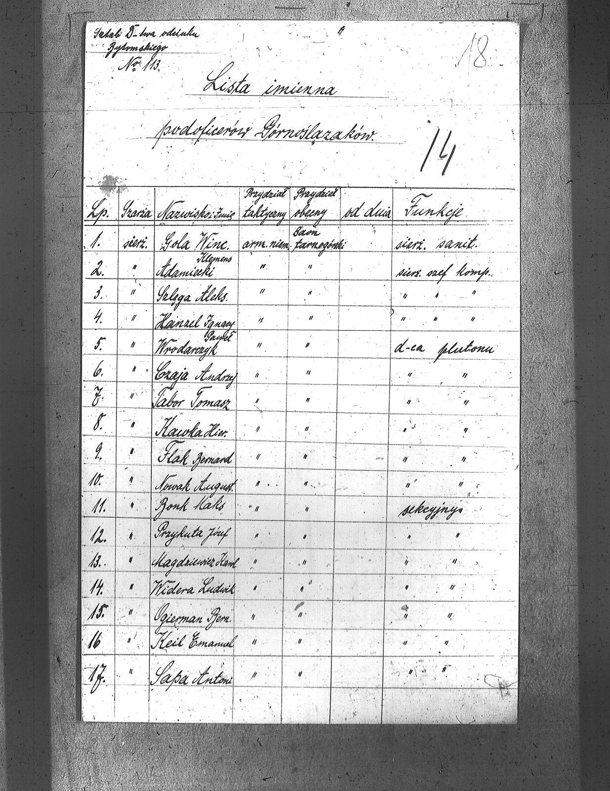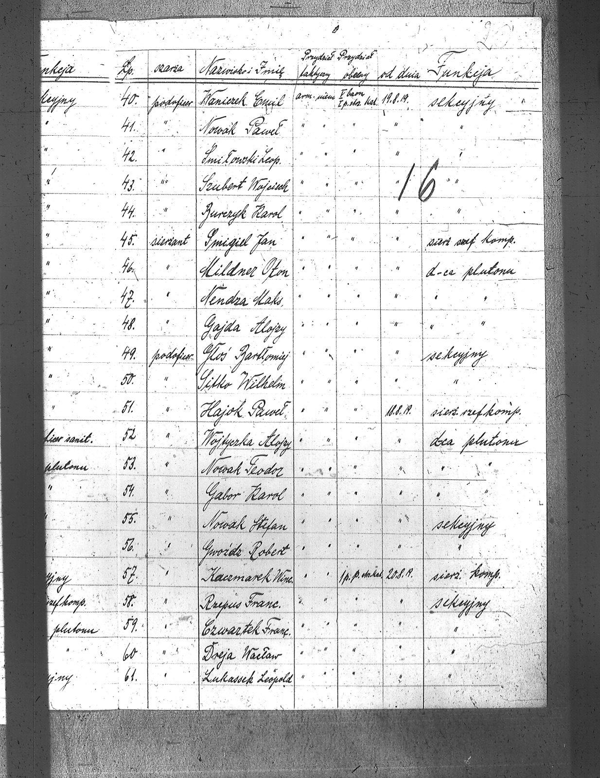 Adamiecki, Klemens; Anioł, Szczepan; Bacik, Paweł; Badura, Jan; Bannert, Paweł; Bonk, Maks; Burczyk, Karol; Czaja, Andrzej; Czwartek, Franc; Dreja, Wacław; Dymarczyk, Franc; Faltin, Karol; Flak, Bernard; Francik, Wilhelm; Gabor, Karol; Gajda, Alojzy; Gaweł, Jan; Głoś, Bartłomiej; Gola, Mikołaj; Gola, Wincenty; Gwóźdź, Robert; Hajok, Paweł; Hamp, Bolesław; Hanzel, Jakób; Heinzel, Ignacy; Kaczmarek, Wicenty; Kapica, Herman; Kawka, Hieronim; Keil, Emanuel; Kost, Franciszek; Ledwoń, Franc; Lipski, Leopold; Lukassek, Leopold; Magdziewicz, Karol; Markiewka, Jan; Mazur, Józef; Mildner, Otton; Nendza, Maks; Nolewajka, Paweł; Nowak, Alojzy; Nowak, August; Nowak, Paweł; Nowak, Robert; Nowak, Stefan; Nowak, Teodor; Ogierman, Bernard; Przykuta, Józef; Rakosz, Aug.; Reiman, Franc; Rembalski, Franc; Rembalski, Wilhelm; Rzepus, Franc; Sapa, Antoni; Sitko, Wilhelm; Smigiel, Jan; Sowa, Roman; Szlęga, Aleksander; Szubert, Wojciech; Śmiłowski, Leopold; Tabor, Tomasz; Tabór, Ludwik; Tilla, Jan; Tobór, Florjan; Waniczek, Emil; Widera, Ludwik; Wojtyczka, Alojzy; Wrodarczyk, Paweł; |