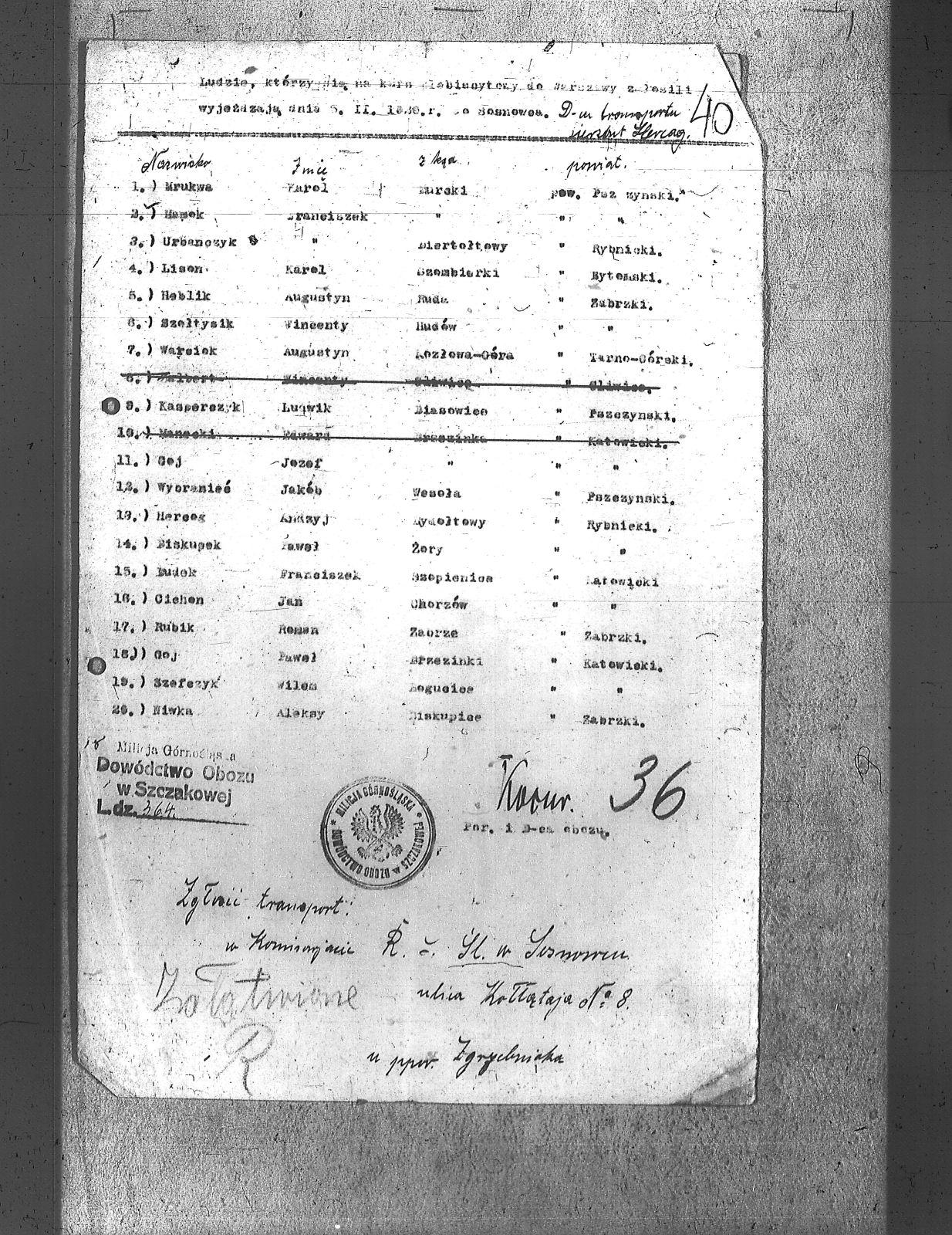 | Osoby | Biskupek, Paweł; Cichon, Jan; Dudek, Franciszek; Goj, Józef; Goj, Paweł; Herzog, Andrzej; Hoblik, Augustyn; Kasperczyk, Ludwik; Lisoń, Karol; Mamok, Franciszek; Mrukwa, Karol; Niwka, Aleksy; Rubik, Roman; Szewczyk, Wilem; Szołtysik, Wincenty; Urbańczyk, Franciszek; Warsiek, Augustyn; Wybraniec, Jakób; |