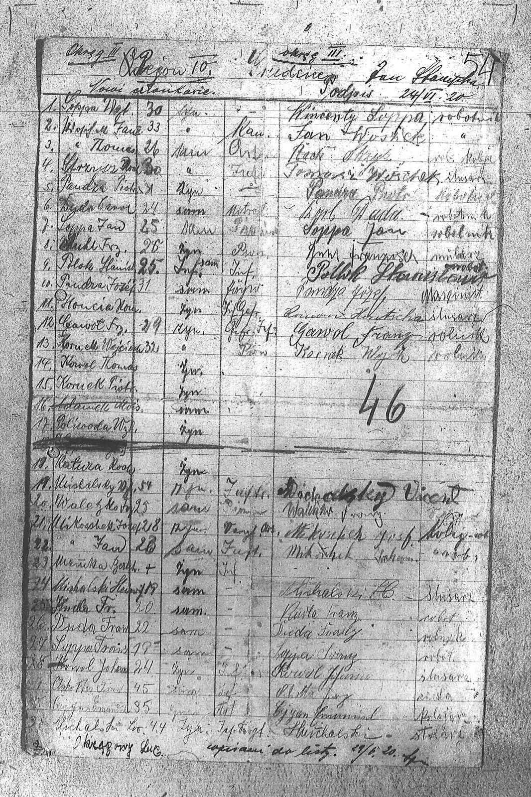 | Osoby | [Czygon], Emanuel; [Ochotton], Fran.; Buhl, Franzisch; Duda, Franciszek; Duda, Karol; Gawot, Franz; Honcia, Roman; Katuza, Karol; Kornek, Piotr; Kornek, Wojciech; Kowal, Johan; Kowol, Thomas; Kudla, Franciszek; Manka, B.; Michalski; Michalski, L.; Mikoschek, Jan; Mikoschek, Józef; Paliwoda; Pandza, Józef; Pandza, Piotr; Polok, Stanisław; Sopica; Soppa, Franciszek; Soppa, Jan; Strzysz; Ucichalsky; Waletzko; Woszek, Jan; Woszek, Tomasz; |