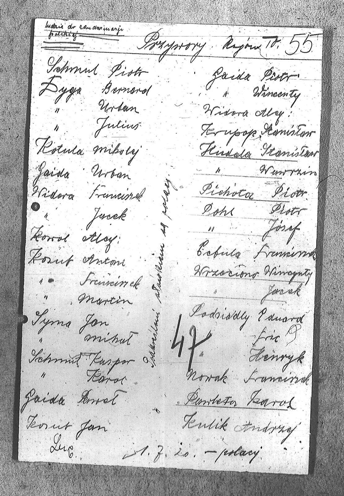 Cebula, Franciszek; Dyga, Bernard; Dyga, Julius; Dyga, Urban; Gaida, Paweł; Gaida, Piotr; Gaida, Urban; Gaida, Wincenty; Hudala, Stanisław; Hudala, Wawrzin; Kotula, Mikołaj; Kowal, Alojzy; Kozut, Antoni; Kozut, Franciszek; Kozut, Jan; Kozut, Martin; Krupok, Stanisław; Kulik, Andrzej; Nowak, Franciszek; Pawleta, Karol; Pichota, Piotr; Podsiadły, Edward; Podsiadły, Fric; Podsiadły, Henryk; Pohl, Józef; Pohl, Piotr; Schmit, Kacper; Schmit, Karol; Schmul, Piotr; Syrna, Jan; Syrna, Michał; Widera ; Widera, Franciszek; Widera, Jacek; Wrzeciono, Jacek; Wrzeciono, Wincenty; |
