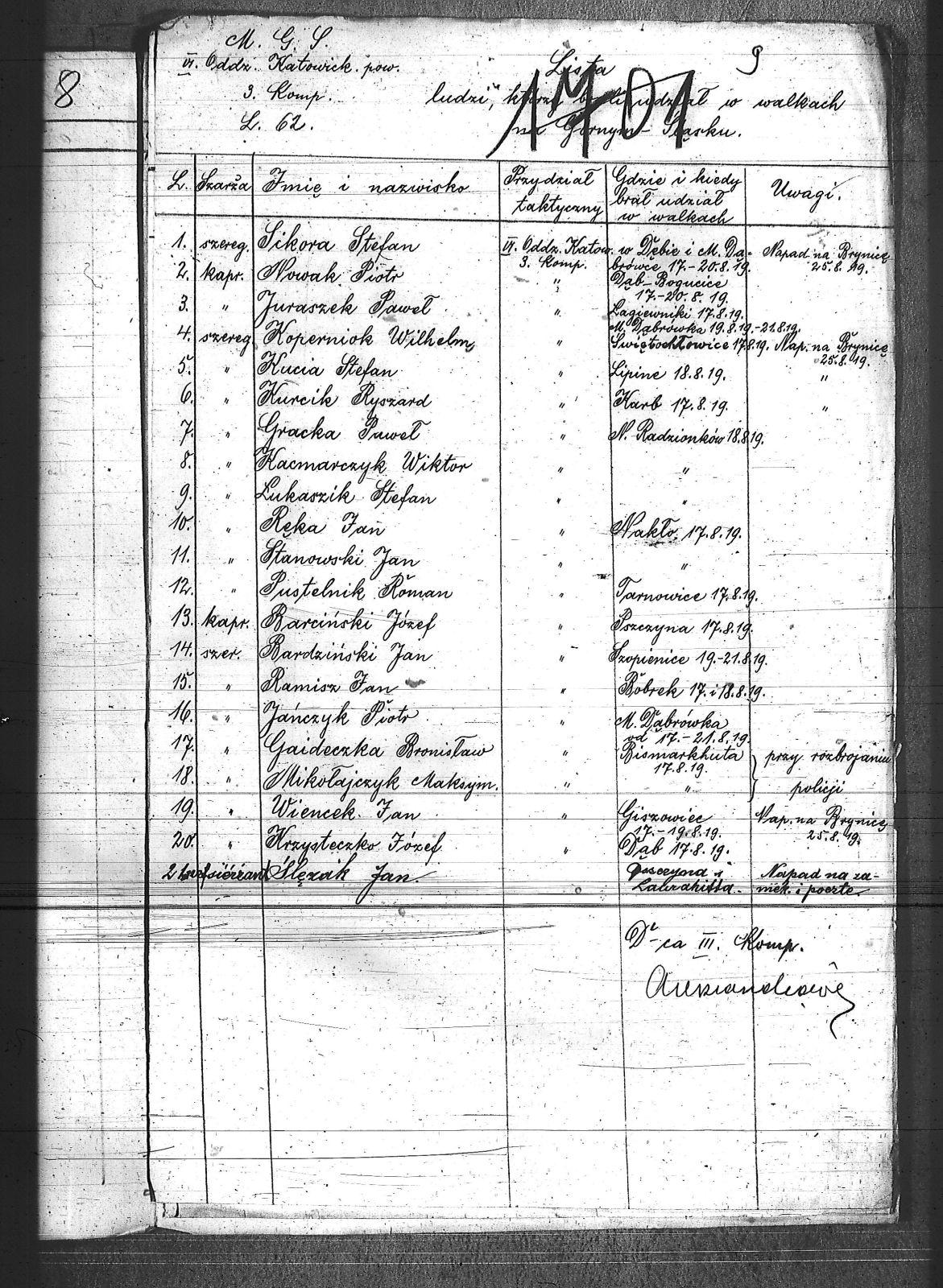 | Instytucje | Milicja Górnośląska; VI Katowicki Oddział Powiatowy III Kompania - Dowódca III Komanii |