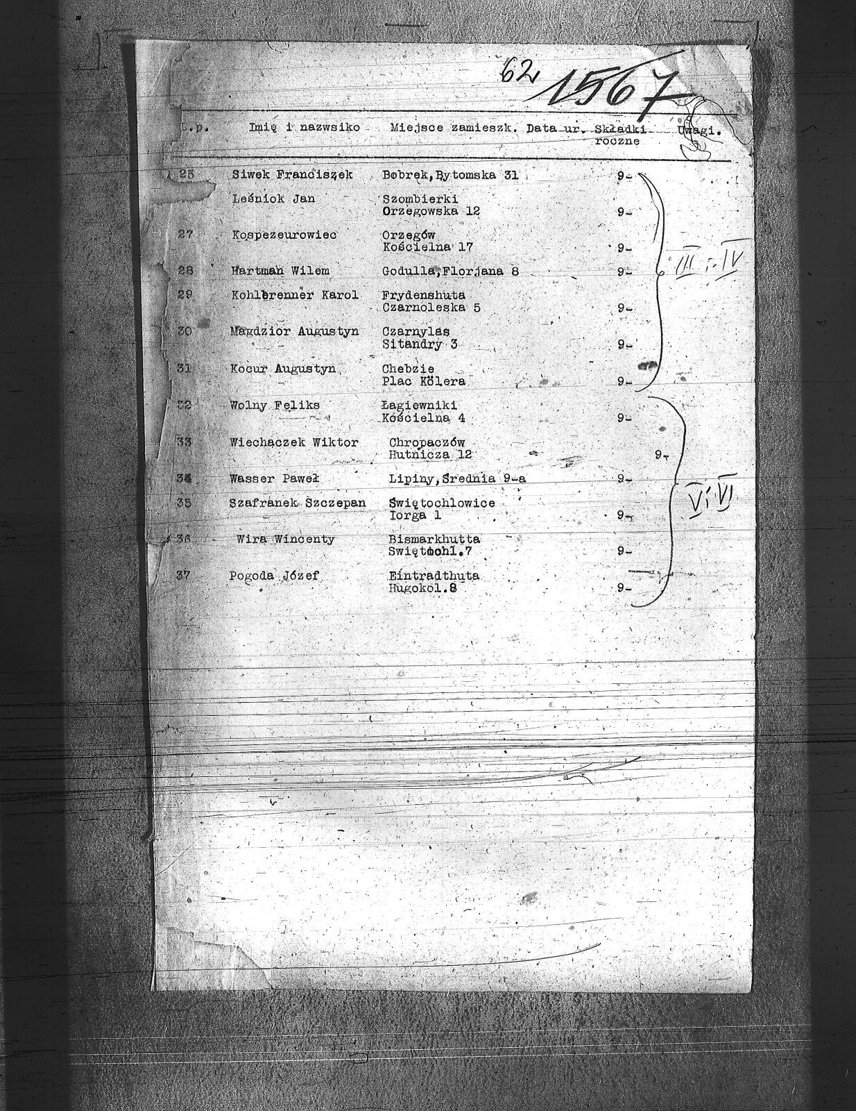 Czesław, Paul; Dworak, Paweł; Foj, Jan; Franiel, Jan; Hartman, Wilhelm; Kocur, Augustyn; Kohlerenner, Karol; Kornke, Rudolf; Kospezeurowiec, ; Koszentko, Wawrzyniec; Lenert, Teodor; Leśniak, Jan; Lubojański, Józef; Magdzior, Augustyn; Michta, Jan; Musioł, Franciszek; Pogoda, Józef; Popęda, Jan; Ręka, Wincenty; Ring, Józef; Rogoc, Antoni; Siwek, Franciszek; Streciok, Jan; Szafarz, Paweł; Szafranek, F.; Szafranek, Szczepan; Szczepanik, Piotr; Thaul, Jan; Waloszek, Wiktor; Wasser, Paweł; Wiechaczek, Wiktor; Wira, Wincenty; Wolny, Feliks; Wróbel, Feliks; Zarcz, Jan; |