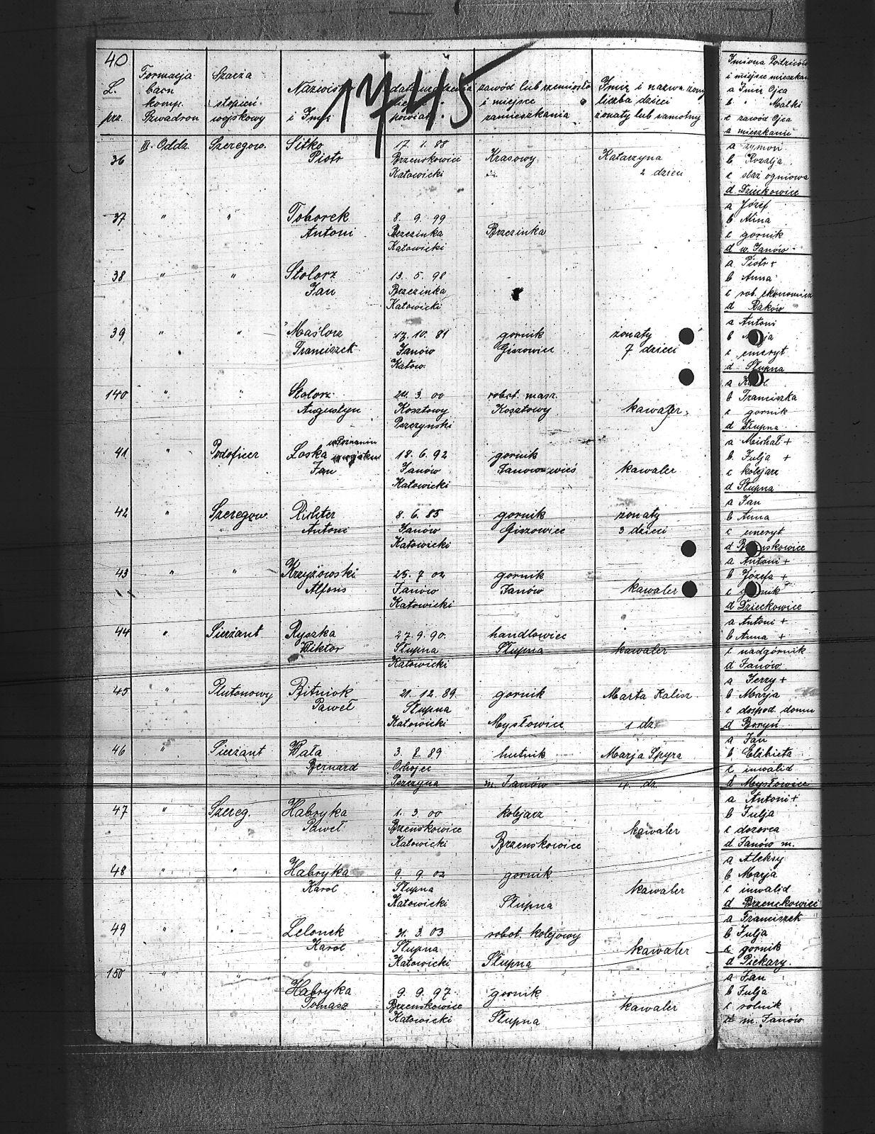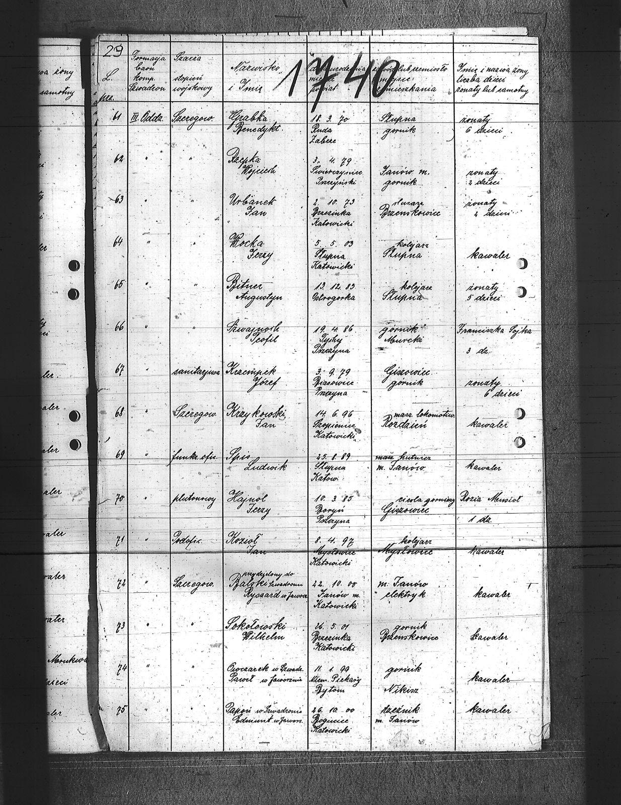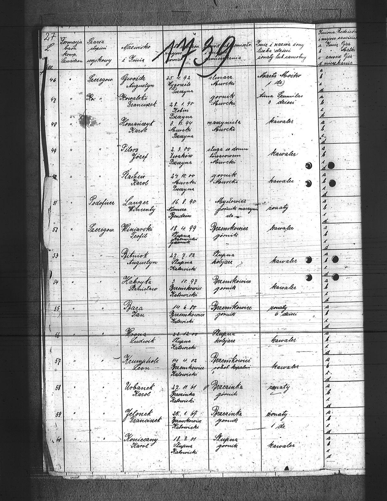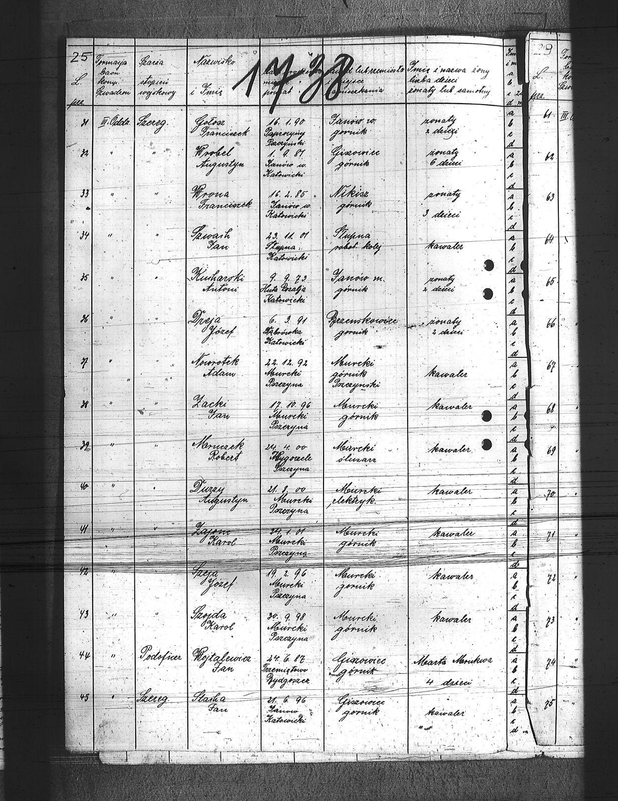 Augustyniak, Jan; Balski, Ryszard; Balura, Jan; Baza, Augustyn; Baza, Jan; Baza, Leon; Ben, Józef; Biecki, Fryderyk; Bielanik, Jan; Bieniek, Józef; Bitner, Augustyn; Bitner, Józef; Bitniok, Augustyn; Bitniok, Paweł; Bitniok, Robert; Bittniok, Piotr; Brzoska, Leopold; Buła, Jan; Cwik, Karol; Danisz, Henryk; Dejas, Stanisław; Dombek, Franciszek; Dreja, Józef; Drobiec, Franciszek; Drobiec, Józef; Durzy, Augustyn; Faska, Franciszek; Fołda, Jan; Fołda, Paweł; Gancorz, Józef; Gniełka, Wilhelm; Goj, Filip; Gołosz, Franciszek; Grabka, Benedykt; Graca, Paweł; Gwóźdź, Augustyn; Habryka, Karol; Habryka, Paweł; Habryka, Stanisław; Habryka, Tomasz; Hajnol, Jerzy; Hassa, Konrad; Hedwig, Jan; Hedwig, Karol; Hetmański, Jakub; Hetmański, Tomasz; Holewa, Wiktor; Hołota, Szczepan; Homańczyk, Karol; Jamrozy, Franciszek; Janko, Emanuel; Janota, Józef; Jelonek, Franciszek; Josz, Emanuel; Karpiczak, Ignacy; Kawa, Franciszek; Kawa, Jan; Kern, Paweł; Kłos, Augustyn; Kocy, Wiktor; Konieczny, Jakub; Konieczny, Karol; Kontny, Tomasz; Kortyczko, Konrad; Kowalski, Augustyn; Kowalski, Franciszek; Kozioł, Ignacy; Kozioł, Jan; Kozioł, Stanisław; Kroczek, Jan; Krumplok, Leon; Krzempek, Józef; Krzykowski, Jan; Krzyżowski, Alfons; Kubica, Franciszek; Kubicki, Szczepan; Kucharski, Antoni; Kurdziej, Teodor; Kuś, Jan; Laby, Józef; Langer, Wincenty; Lasok, Wincenty; Lelonek, Karol; Lorenc, Franciszek; Lorenc, Juliusz; Łaska, Jan; Magdziorz, Aleksy; Mamok, Franciszek; Mańka, Filip; Marszoł, Teodor; Maślarz, Franciszek; Mazur, Augustyn; Mazur, Jan; Mokry, Konrad; Mruczek, Robert; Musialik, Augustyn; Niemczyk, Konrad; Nowakowski, Antoni; Nowakowski, Edward; Nowrotek, Adam; Owczarek, Paweł; Papoń, Edmund; Patałong, Tomasz; Pawlik, Emanuel; Pilorz, Józef; Piotrowski, Jan; Ptok, Emanuel; Pypłacz, Jan; Rembacz, Teodor; Richter, Antoni; Rojek, Augustyn; Rombacz, Robert; Rozkoszny, Jan; Ryszka, Wiktor; Rzepka, Wojciech; Saternus, Bartłomiej; Sieroński, Roman; Sitko, Piotr; Skolik, Bolesław; Słota, Bronisław; Sojka, Franciszek; Sokołowski, Wilhelm; Sorek, Alfons; Spis, Ludwik; Starka, Jan; Stolorz, Augustyn; Stolorz, Jan; Stolorz, Józef; Szary, Franciszek; Szary, Mateusz; Szeja, Antoni; Szeja, Józef; Szeja, Paweł; Szeja, Tomasz; Szejda, Karol; Szwaik, Jan; Szwajnork, Teofil; Szwejcok, Karol; Ślachcic, Karol; Śliwa, Piotr; Toborek, Antoni; Tomala, Leopold; Tuszyński, Bernard; Tuszyński, Józef; Urbanek, Jan; Urbanek, Karol; Wała, Bernard; Wandziura, Józef; Winiarski, Teofil; Wocka, Jerzy; Wocka, Wilhelm; Wojtalewicz, Alojzy; Wojtalewicz, Jan; Wola, Jan; Wójcik, Wilhelm; Wrobel, Franciszek; Wrona, Franciszek; Wrona, Ludwik; Wyleżoł, Karol; Zacki, Jan; Zajonc, Karol; Żelazny, Antoni; Żok, Jan; Żołna, Franciszek; |