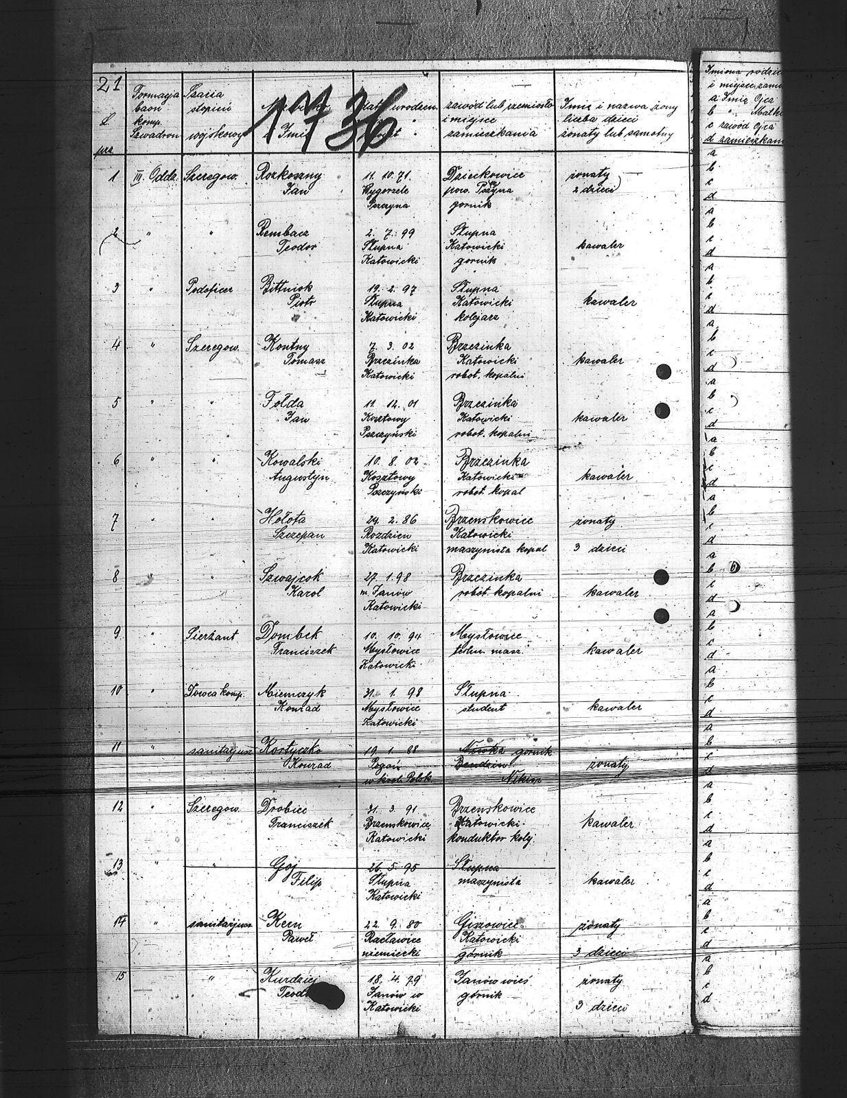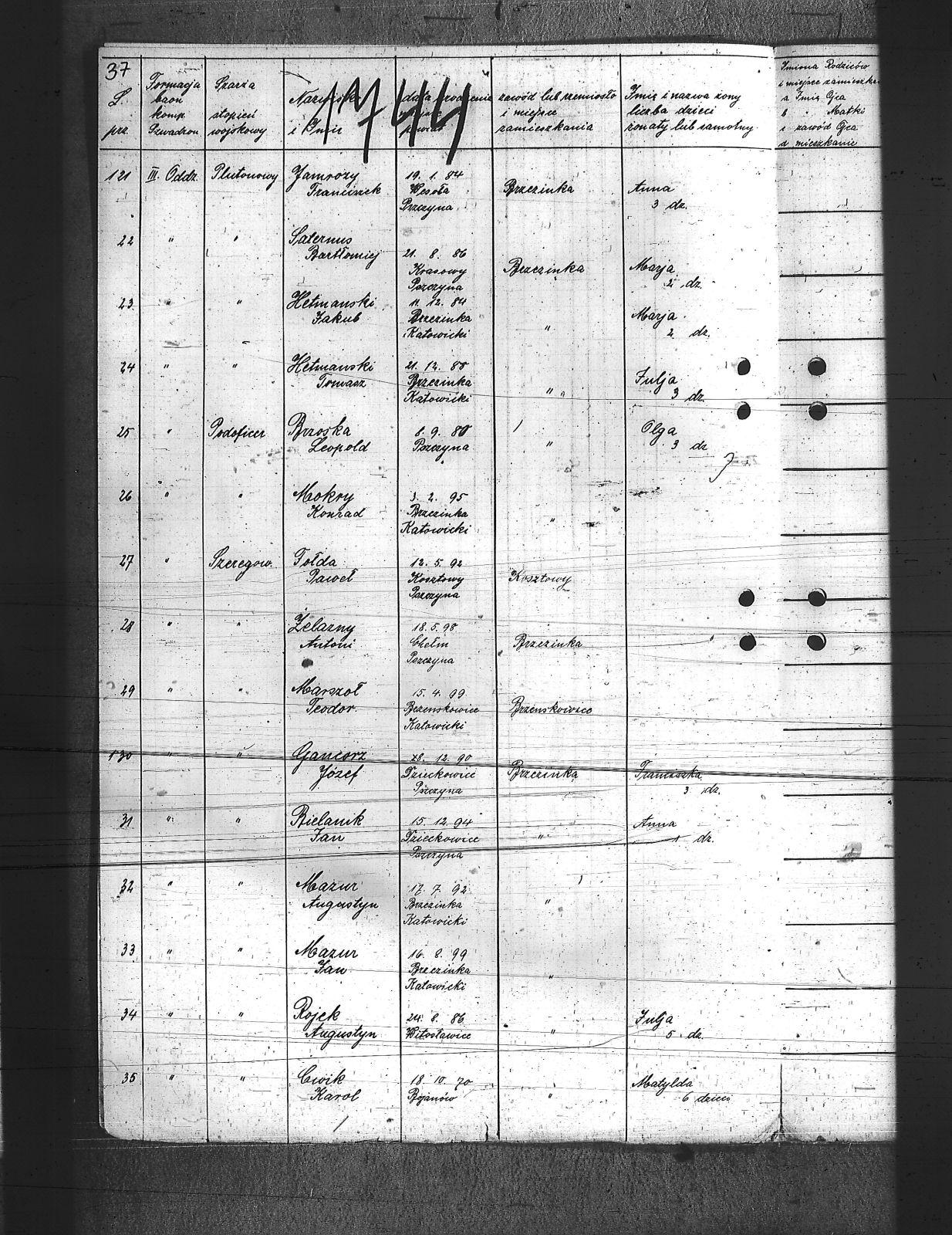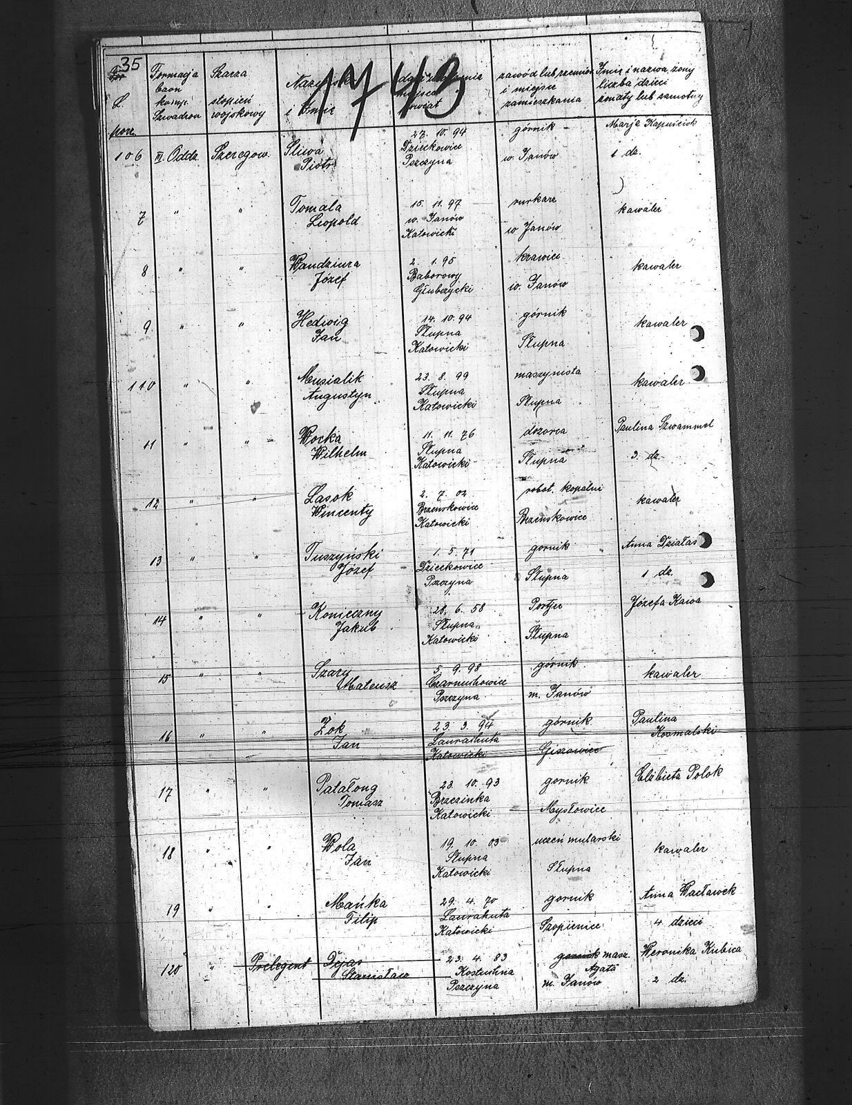 Augustyniak, Jan; Balski, Ryszard; Balura, Jan; Baza, Augustyn; Baza, Jan; Baza, Leon; Ben, Józef; Biecki, Fryderyk; Bielanik, Jan; Bieniek, Józef; Bitner, Augustyn; Bitner, Józef; Bitniok, Augustyn; Bitniok, Paweł; Bitniok, Robert; Bittniok, Piotr; Brzoska, Leopold; Buła, Jan; Cwik, Karol; Danisz, Henryk; Dejas, Stanisław; Dombek, Franciszek; Dreja, Józef; Drobiec, Franciszek; Drobiec, Józef; Durzy, Augustyn; Faska, Franciszek; Fołda, Jan; Fołda, Paweł; Gancorz, Józef; Gniełka, Wilhelm; Goj, Filip; Gołosz, Franciszek; Grabka, Benedykt; Graca, Paweł; Gwóźdź, Augustyn; Habryka, Karol; Habryka, Paweł; Habryka, Stanisław; Habryka, Tomasz; Hajnol, Jerzy; Hassa, Konrad; Hedwig, Jan; Hedwig, Karol; Hetmański, Jakub; Hetmański, Tomasz; Holewa, Wiktor; Hołota, Szczepan; Homańczyk, Karol; Jamrozy, Franciszek; Janko, Emanuel; Janota, Józef; Jelonek, Franciszek; Josz, Emanuel; Karpiczak, Ignacy; Kawa, Franciszek; Kawa, Jan; Kern, Paweł; Kłos, Augustyn; Kocy, Wiktor; Konieczny, Jakub; Konieczny, Karol; Kontny, Tomasz; Kortyczko, Konrad; Kowalski, Augustyn; Kowalski, Franciszek; Kozioł, Ignacy; Kozioł, Jan; Kozioł, Stanisław; Kroczek, Jan; Krumplok, Leon; Krzempek, Józef; Krzykowski, Jan; Krzyżowski, Alfons; Kubica, Franciszek; Kubicki, Szczepan; Kucharski, Antoni; Kurdziej, Teodor; Kuś, Jan; Laby, Józef; Langer, Wincenty; Lasok, Wincenty; Lelonek, Karol; Lorenc, Franciszek; Lorenc, Juliusz; Łaska, Jan; Magdziorz, Aleksy; Mamok, Franciszek; Mańka, Filip; Marszoł, Teodor; Maślarz, Franciszek; Mazur, Augustyn; Mazur, Jan; Mokry, Konrad; Mruczek, Robert; Musialik, Augustyn; Niemczyk, Konrad; Nowakowski, Antoni; Nowakowski, Edward; Nowrotek, Adam; Owczarek, Paweł; Papoń, Edmund; Patałong, Tomasz; Pawlik, Emanuel; Pilorz, Józef; Piotrowski, Jan; Ptok, Emanuel; Pypłacz, Jan; Rembacz, Teodor; Richter, Antoni; Rojek, Augustyn; Rombacz, Robert; Rozkoszny, Jan; Ryszka, Wiktor; Rzepka, Wojciech; Saternus, Bartłomiej; Sieroński, Roman; Sitko, Piotr; Skolik, Bolesław; Słota, Bronisław; Sojka, Franciszek; Sokołowski, Wilhelm; Sorek, Alfons; Spis, Ludwik; Starka, Jan; Stolorz, Augustyn; Stolorz, Jan; Stolorz, Józef; Szary, Franciszek; Szary, Mateusz; Szeja, Antoni; Szeja, Józef; Szeja, Paweł; Szeja, Tomasz; Szejda, Karol; Szwaik, Jan; Szwajnork, Teofil; Szwejcok, Karol; Ślachcic, Karol; Śliwa, Piotr; Toborek, Antoni; Tomala, Leopold; Tuszyński, Bernard; Tuszyński, Józef; Urbanek, Jan; Urbanek, Karol; Wała, Bernard; Wandziura, Józef; Winiarski, Teofil; Wocka, Jerzy; Wocka, Wilhelm; Wojtalewicz, Alojzy; Wojtalewicz, Jan; Wola, Jan; Wójcik, Wilhelm; Wrobel, Franciszek; Wrona, Franciszek; Wrona, Ludwik; Wyleżoł, Karol; Zacki, Jan; Zajonc, Karol; Żelazny, Antoni; Żok, Jan; Żołna, Franciszek; |