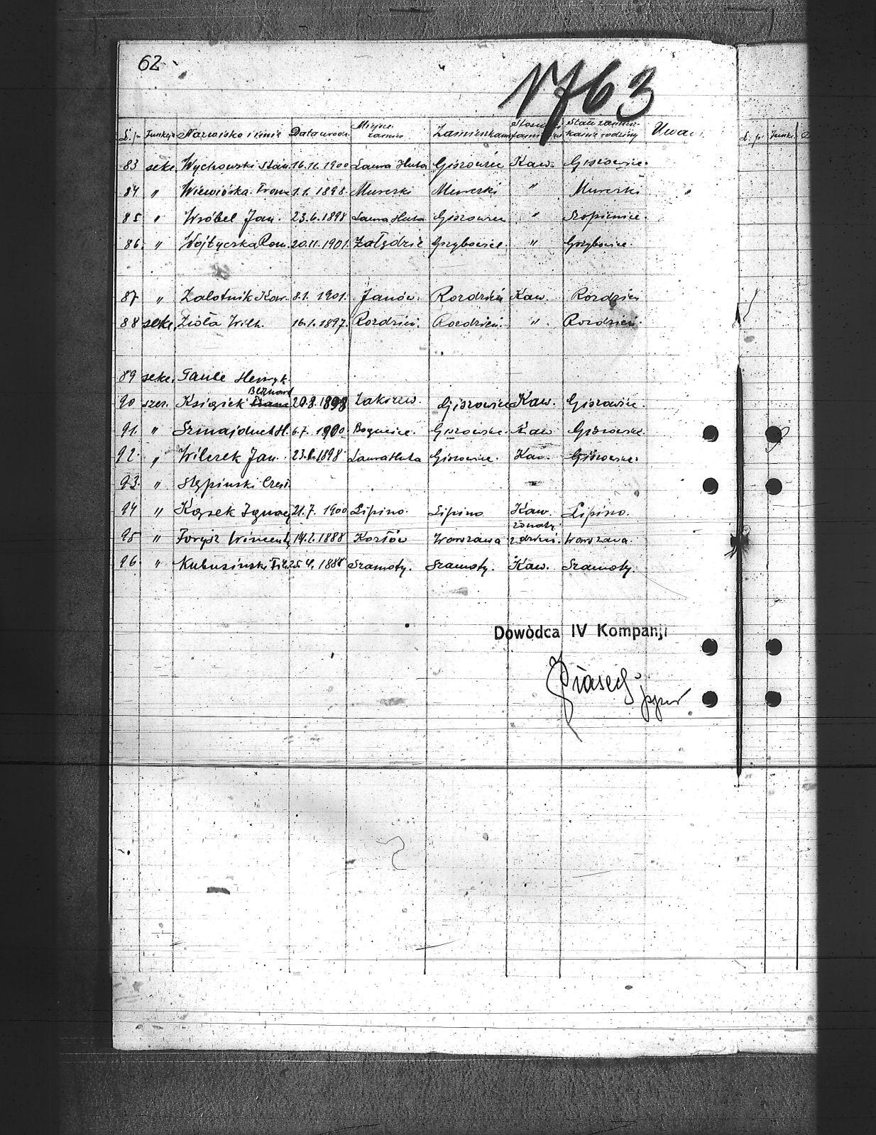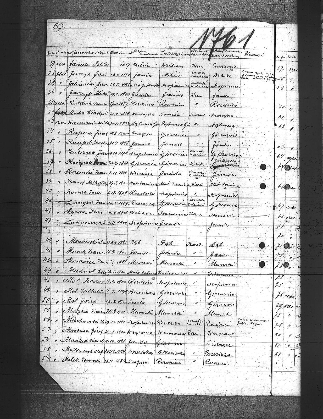 Bankiel, Józef; Baron, Henryk; Belun, Jan; Bienek, ; Brzozka, Ludwik; Chromy, Franciszek; Cichoń, Józef; Cichy, Maksymilian; Czajor, Józef; Dikta, Paweł; Dobiczek, Julian; Drużba, Eugeniusz; Dryś, Jerzy; Drzyzga, Ludwik; Duda, August; Filipek, Emanuel; Fogiel, Teodor; Forysz, Wincenty; Gajowski, Wilhelm; Gank, Henryk; Gawlik, Franciszek; Gierlotka, Wilhelm; Glowalla, Józef; Górecki, Wawrzyn; Grzesica, Jan; Grzyp, Paweł; Hackuła, Teofil; Humańczyk, Paweł; Jałowiecki, Jan; Janicki, Feliks; Jarczyk, Aleksander; Jarczyk, Jan; Kapica, Jacek; Karmieniecki, Stanisław; Kązek, Ignacy; Knapik, Teodor; Korczek, Tomasz; Kowal, Mikołaj; Krzemień, Franciszek; Książek, Bernard; Książek, Franciszek; Kubiczek, Jan; Kubusiński, Teodor; Kulawik, Tomasz; Kuta, Władysław; Langosz, Paweł; Łukaszczyk, Tomasz; Łysak, Stanisław; Macherski, Ludwik; Mańkut, Karol; Marek, Franciszek; Michnol, Edward; Miechowski, K.; Miszka, Franciszek; Mol, Józef; Mol, Teodor; Mol, Wilhelm; Molek, Tomasz; Morawiec, Karol; Moskwa, Józef; Myśliwczyk, Stefan; Nowak, Grzegorz; Nowak, Teofil; Nowara, Wilhelm; Ogara, Alojzy; Olesiński, Wincent; Opaszowski, Piotrek; Palka, Tomasz; Piszczek, Teodor; Plewnia, Ludwik; Rezler, Ludwik; Sałata, Zygmund; Schmidt, Piotr; Seweryn, Jan; Sieja, Józef; Skowronek, Józef; Spleśniak, Józef; Spyra, Jan; Stacha, Alojzy; Stacha, Ludwik; Stachura, Jan; Stępiński, Czesław; Stokora, Wiktor; Strącik, Teodor; Strzyżyk, Jan; Szafranek, Alojzy; Szklorz, Teodor; Szmajdnek, Teodor; Szmajduch, H.; Wiewiórka, Franciszek; Wilczek, Jan; Wojtyczka, Roman; Wróbel, Jan; Wychowski, Stanisław; Zalotnik, Konrad; Zióła, Wilhelm; |